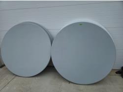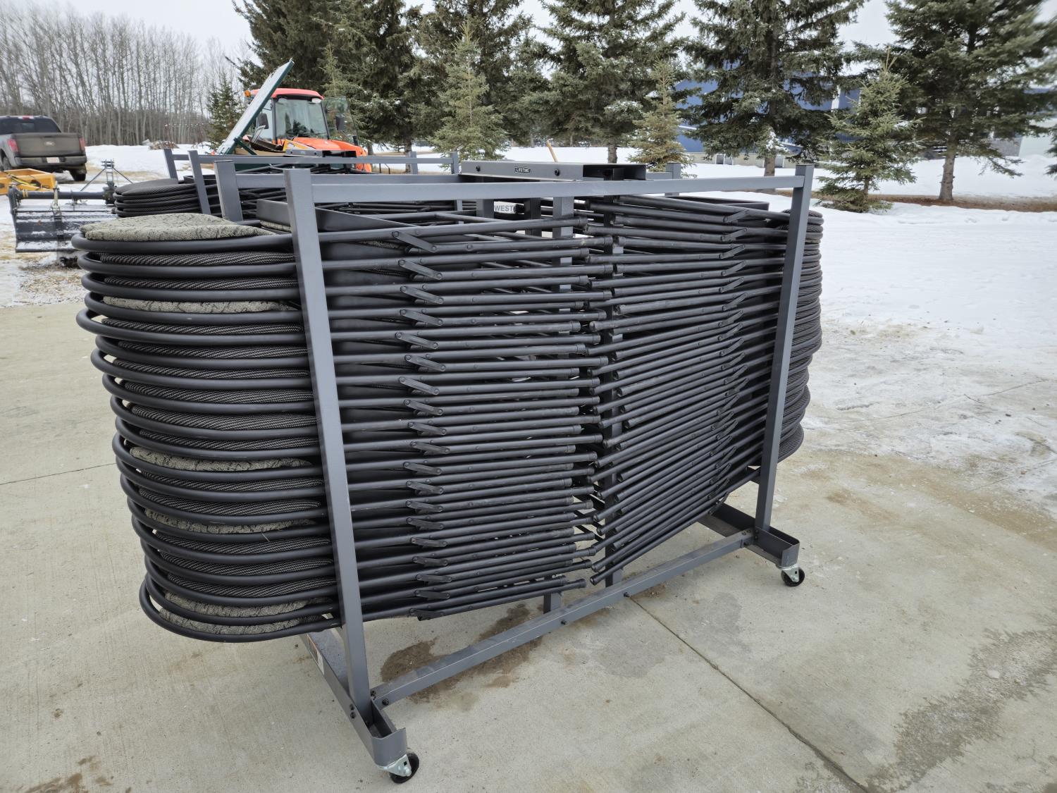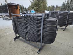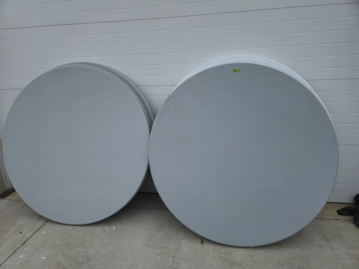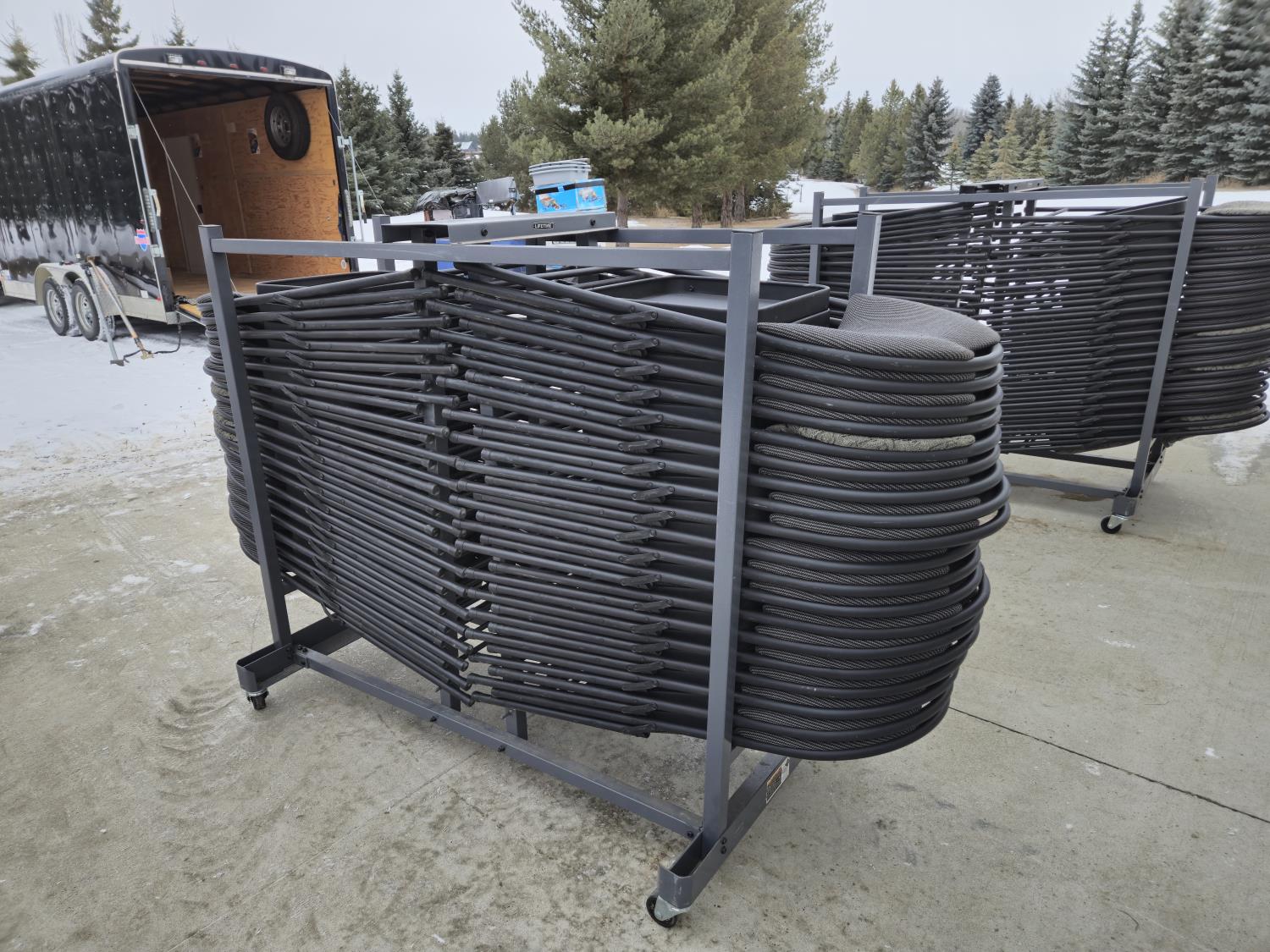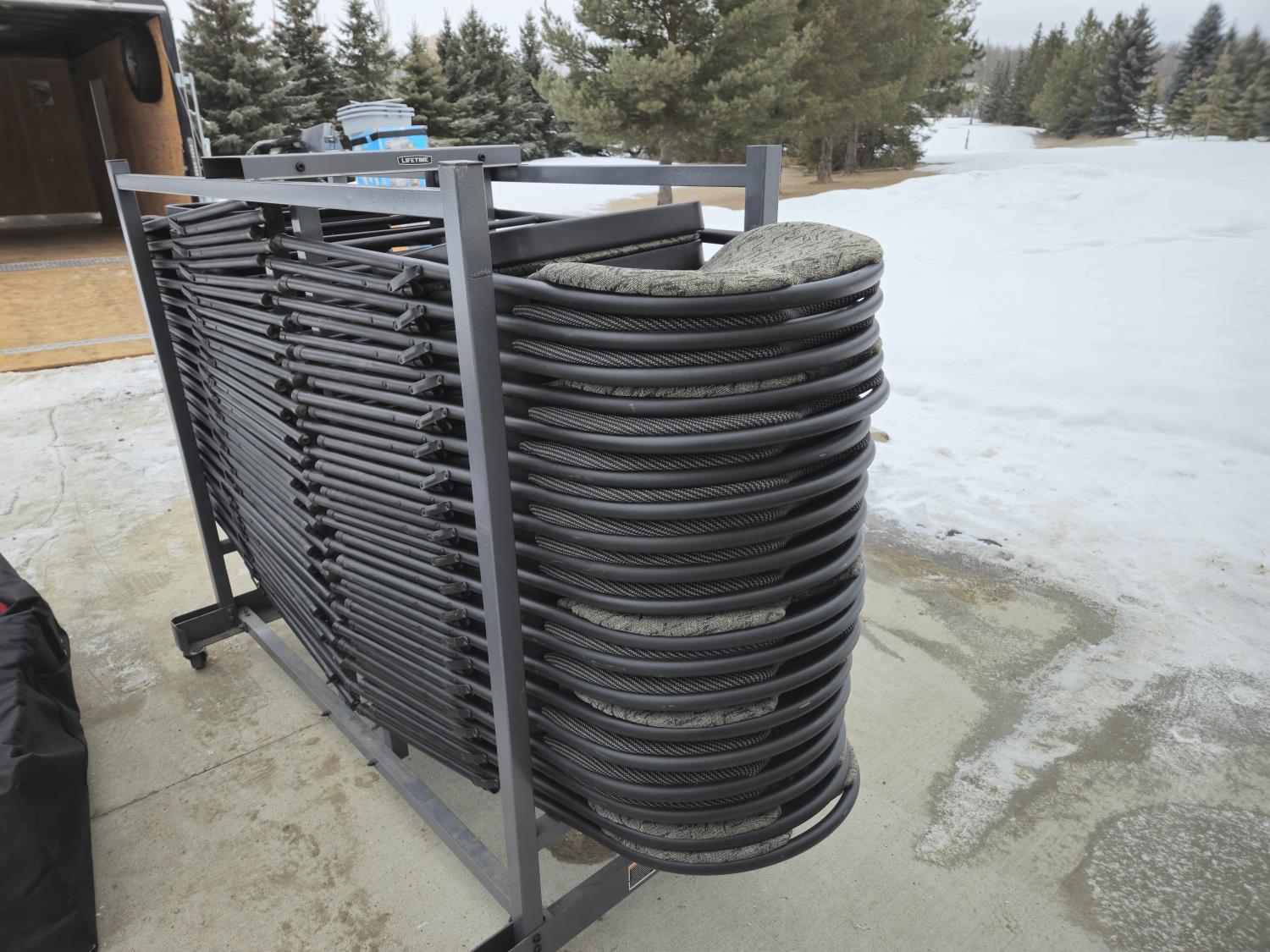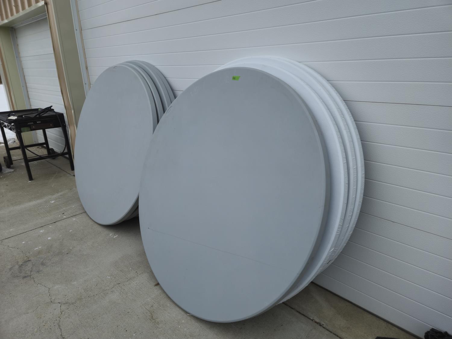 144 (8) 5 Ft Round Poly Folding Tables & (76) Stacking Chairs On Rolling Racks