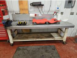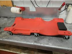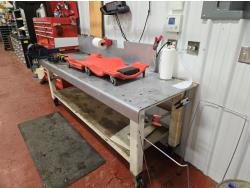 29.5 inch deep X 36 inch high, wooden frame, heavy duty steel top, (2) pair of ear protectors, mechanic's creeper