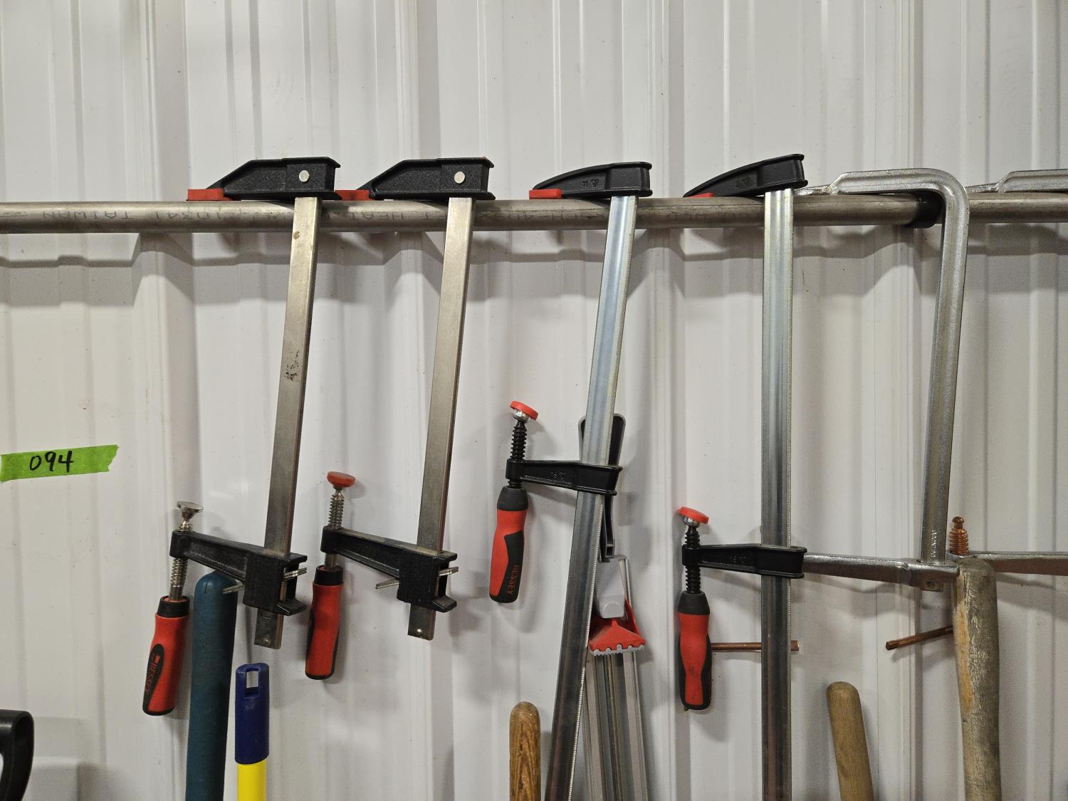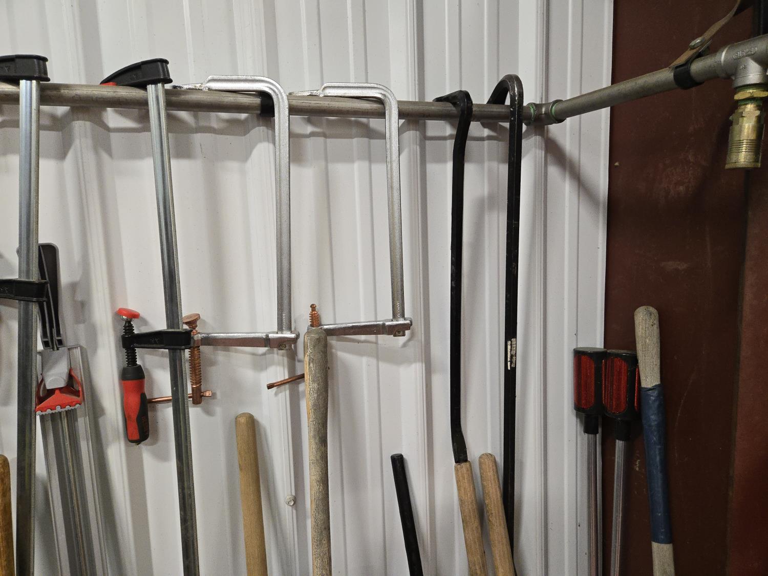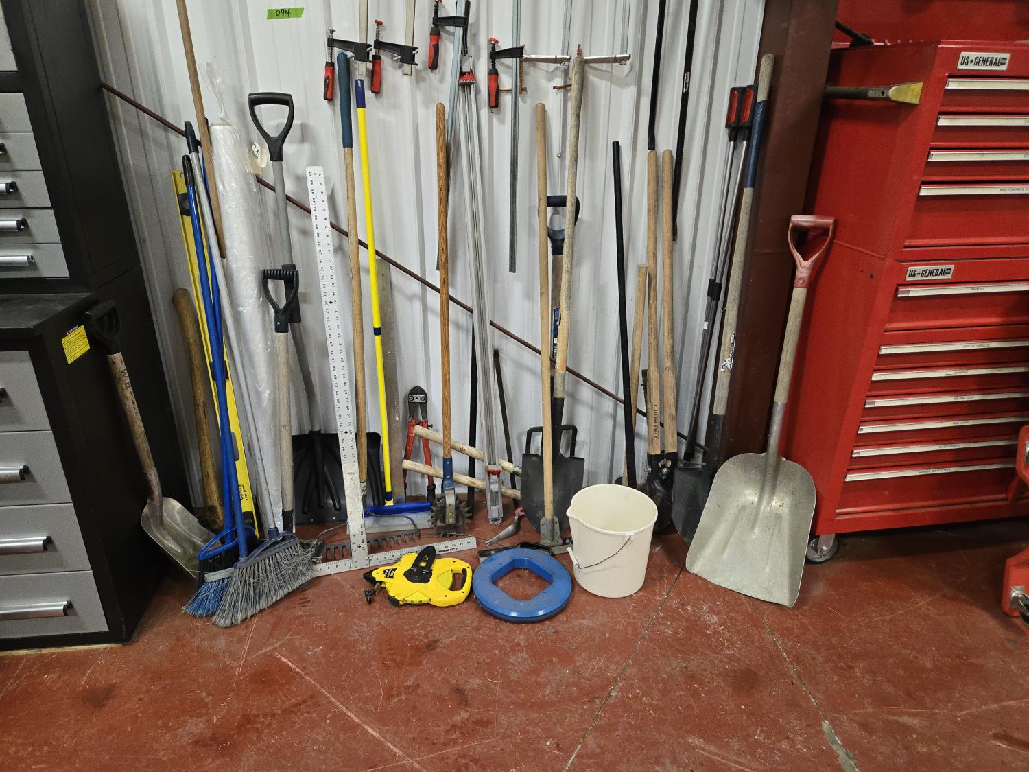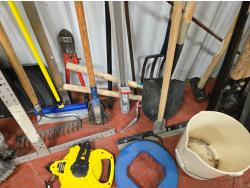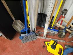 brooms, shovels, clamps, axes, sledge hammer, rake, bolt cutter, long tape measure, fish tape, miscellaneous items