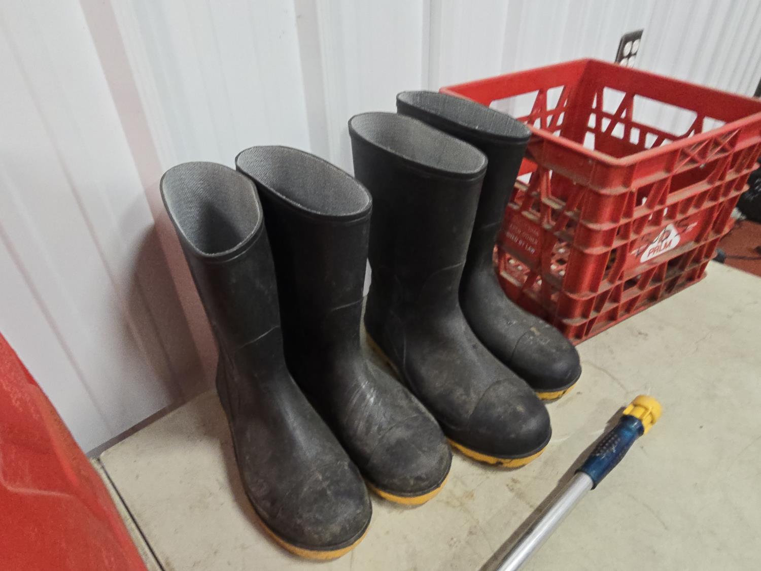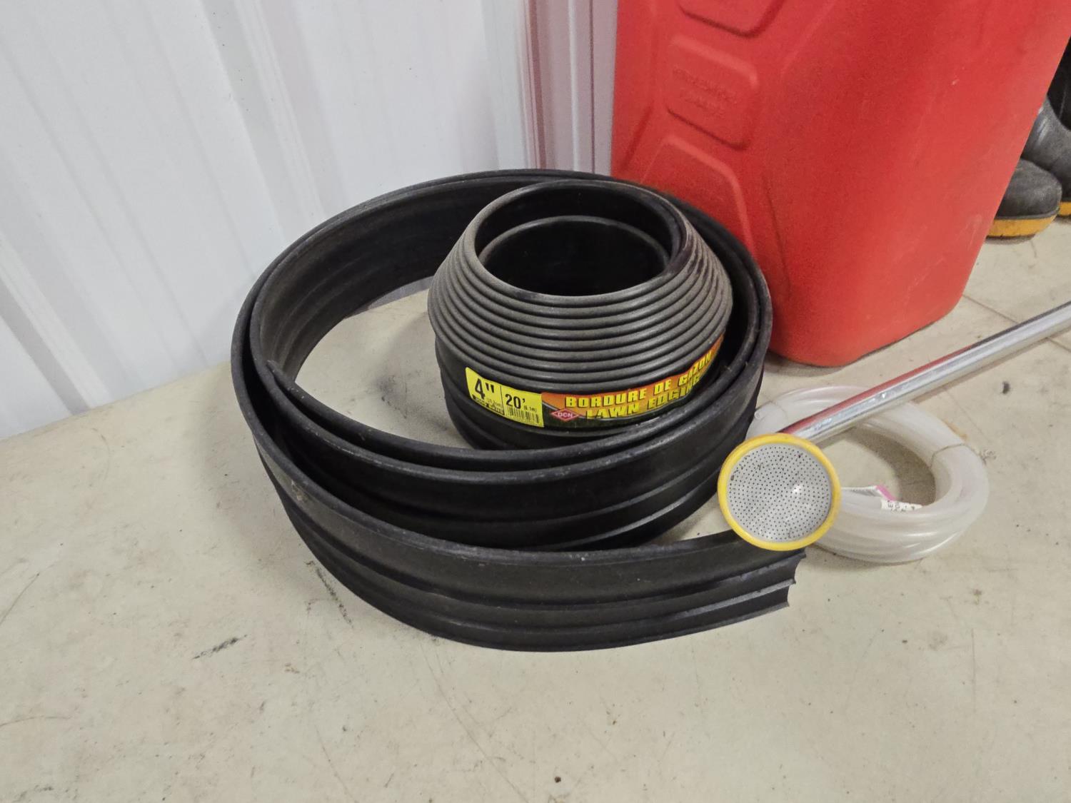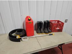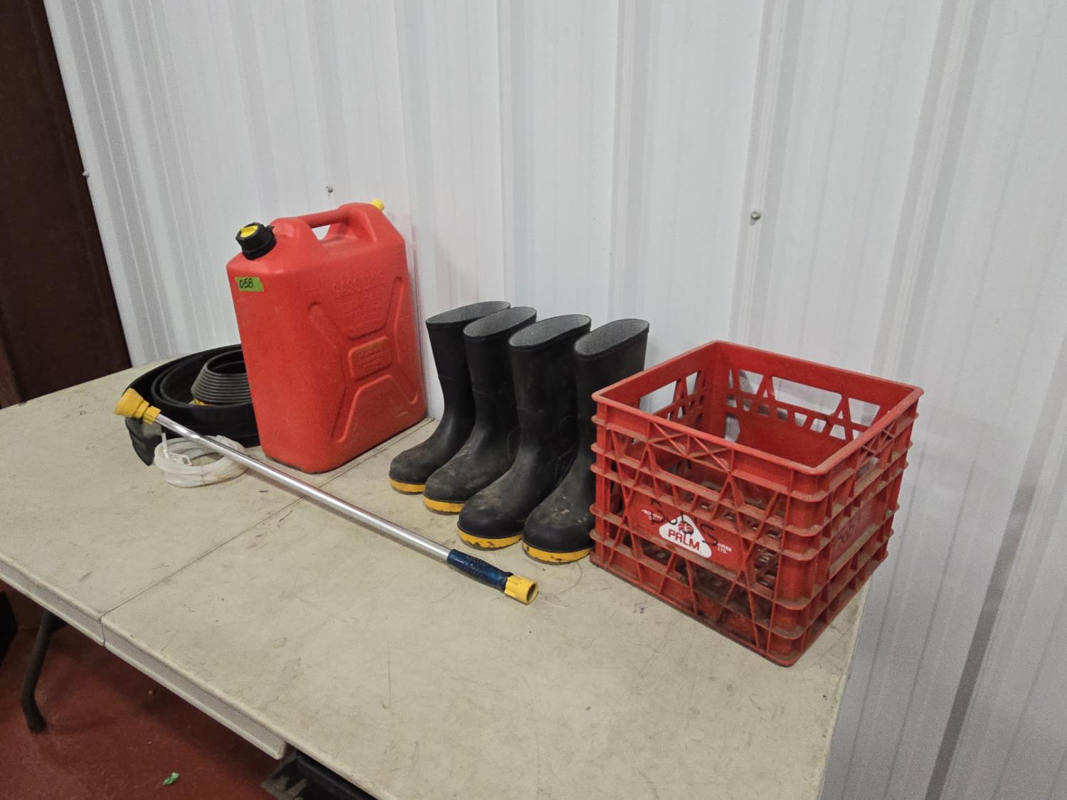 (1) pair rubber boots size 12, (1) pair rubber boots size 9, 20 L Jerry can, qty of garden edging, watering wand