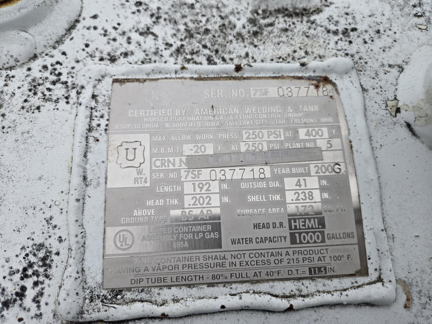 102 2006 1000 Gallon Propane Tank on Skid