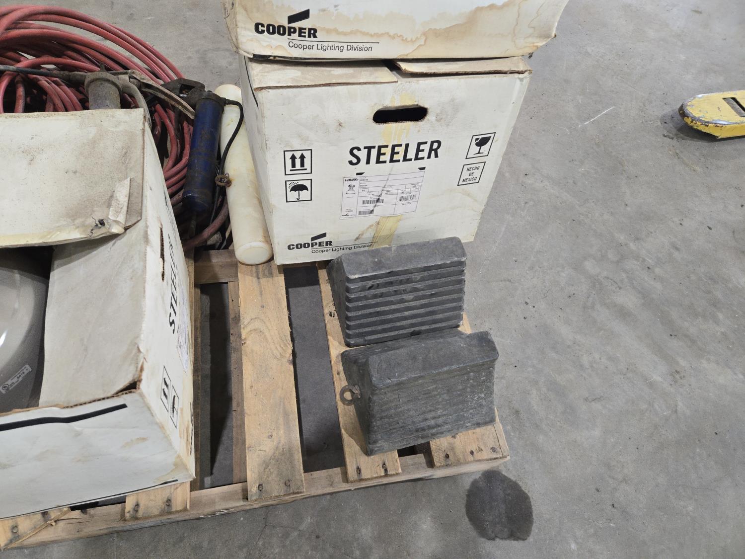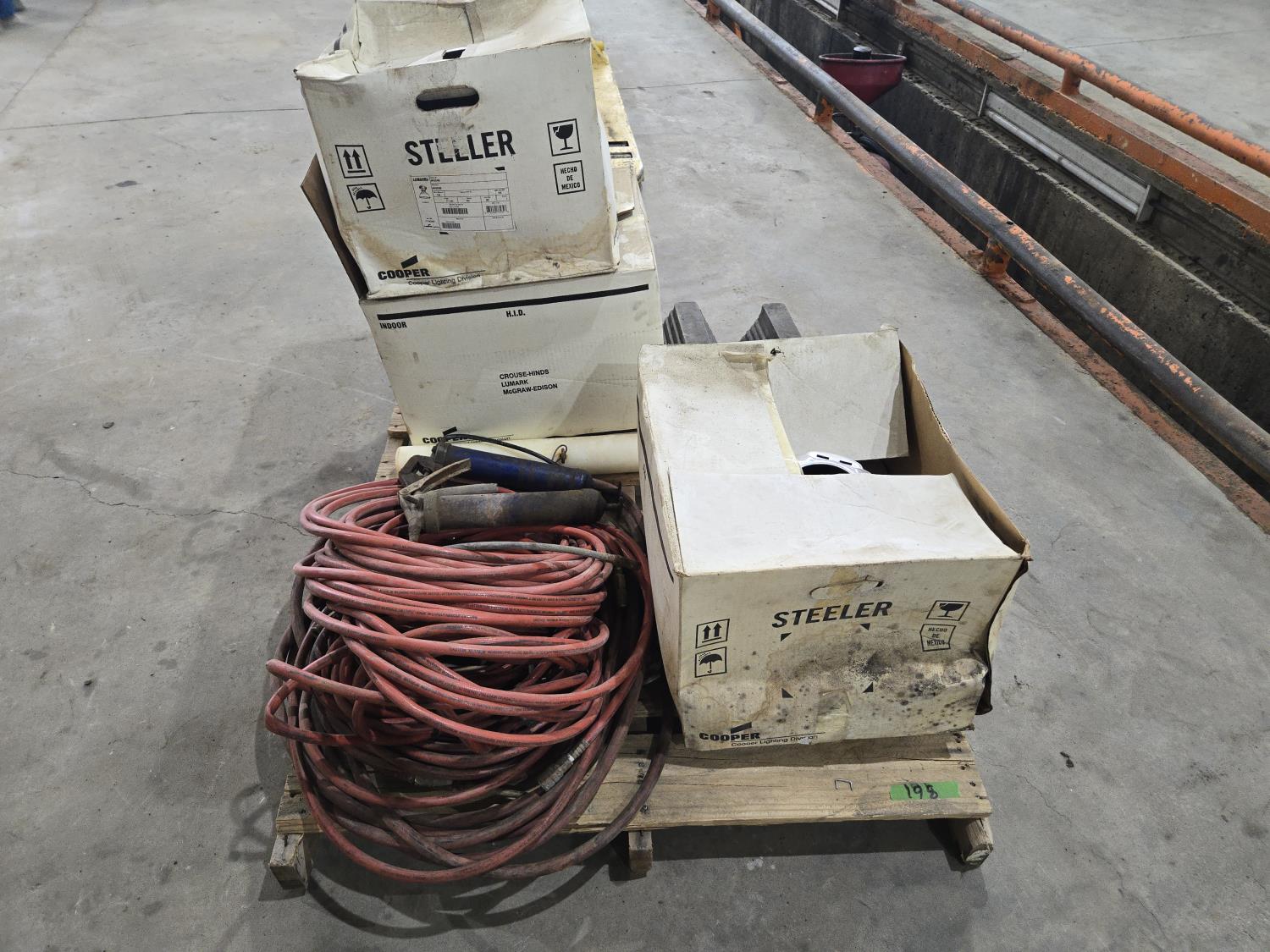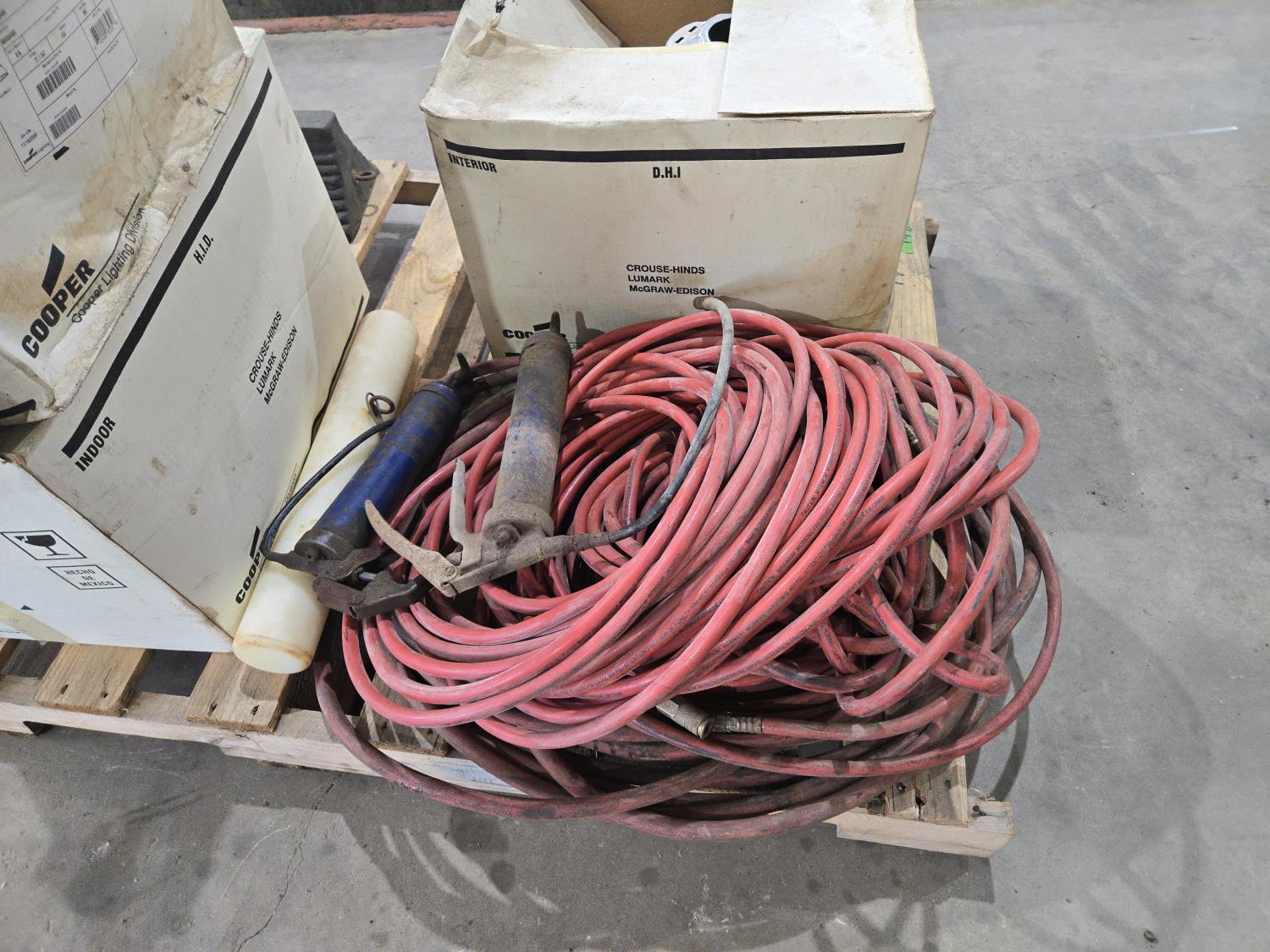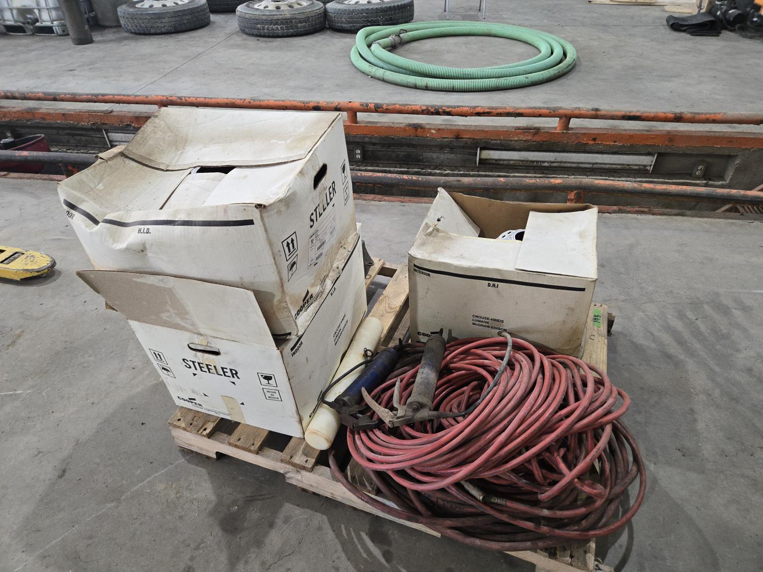 43 Qty of Air Hose, (3) 400 Watt Shop Lights, Wheel Chocks