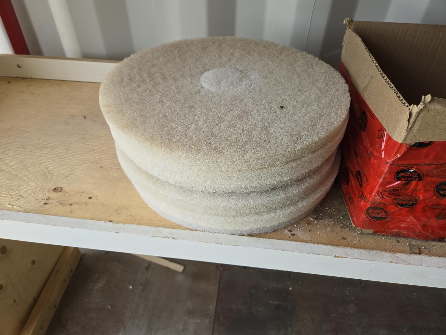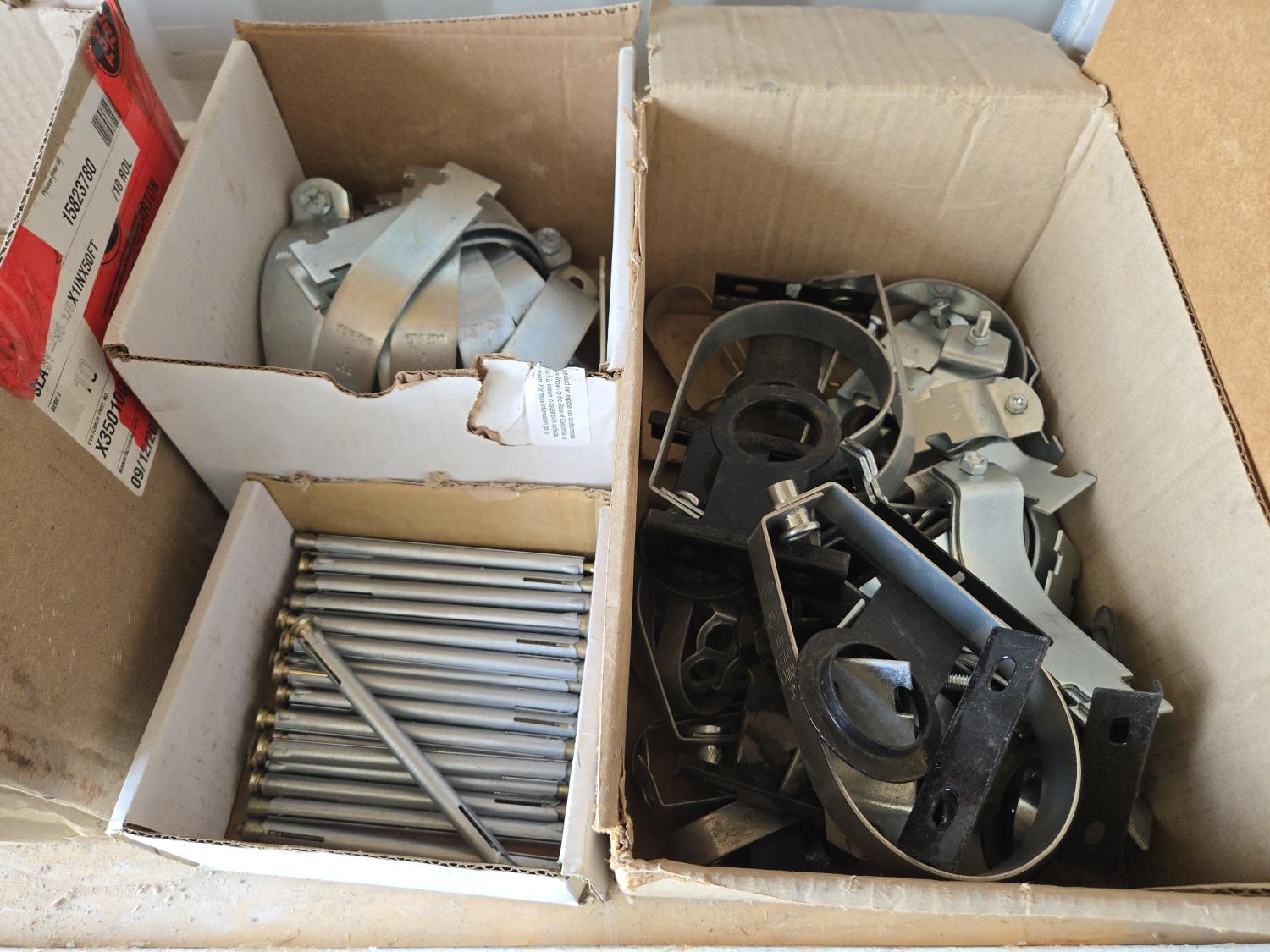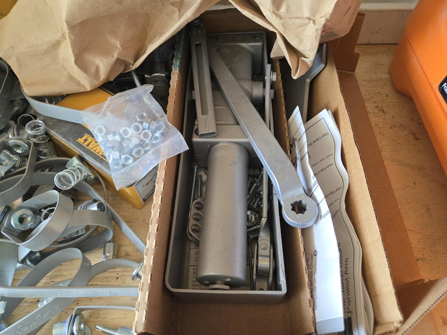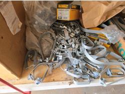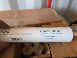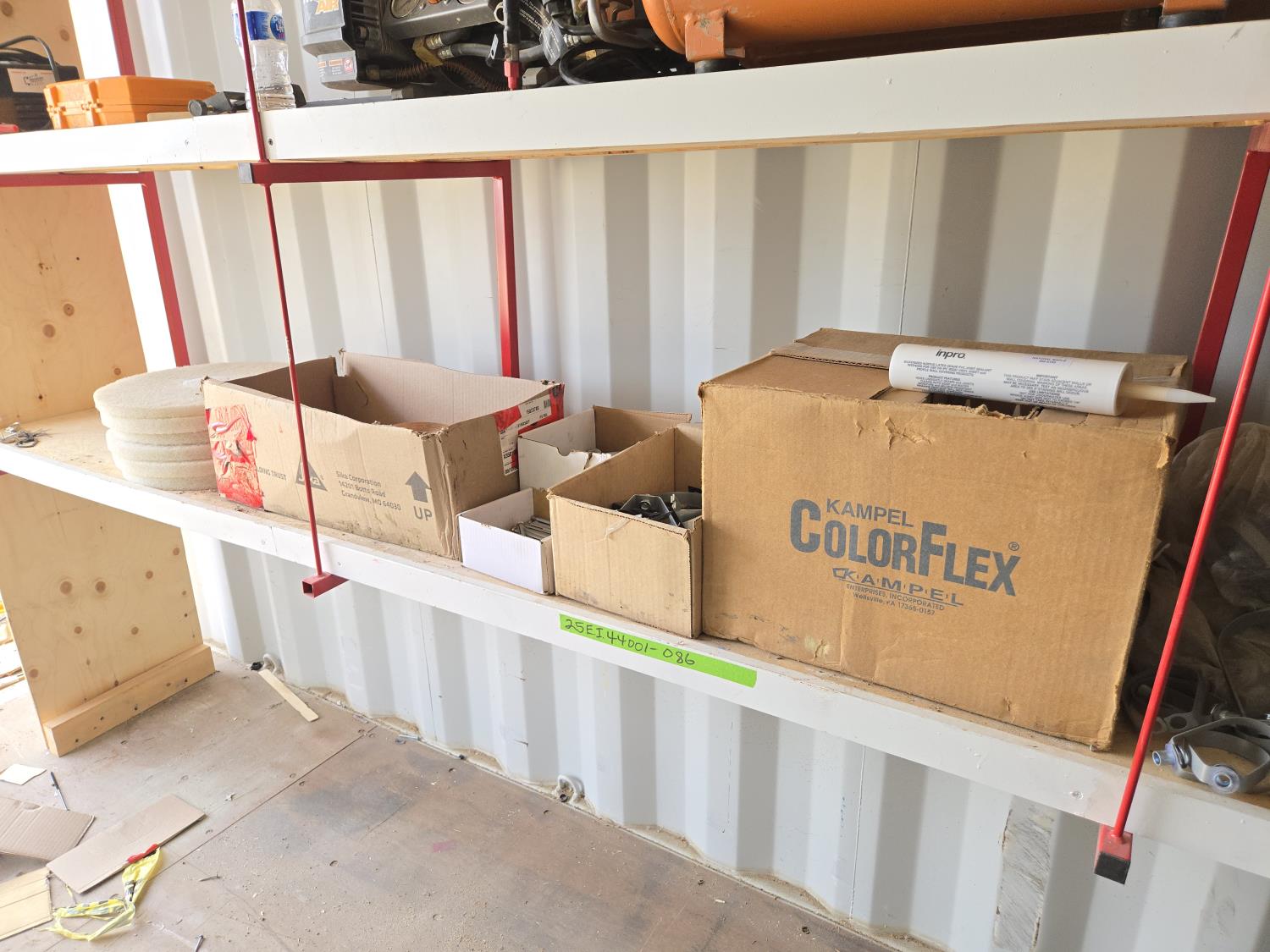 Pipe hangers, (48) tubes of vinyl floor caulk, sander pads, qty of Butyl, door closer, miscellaneous