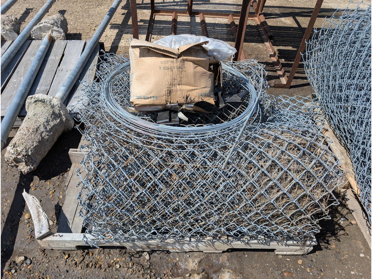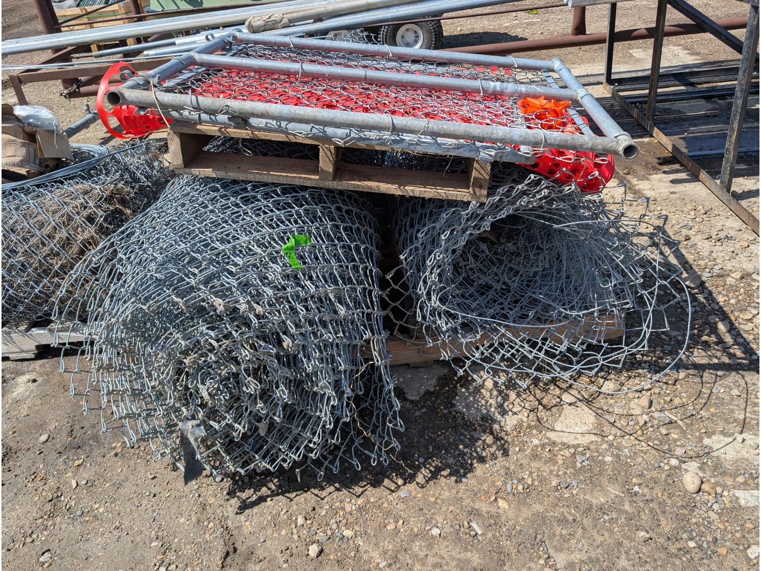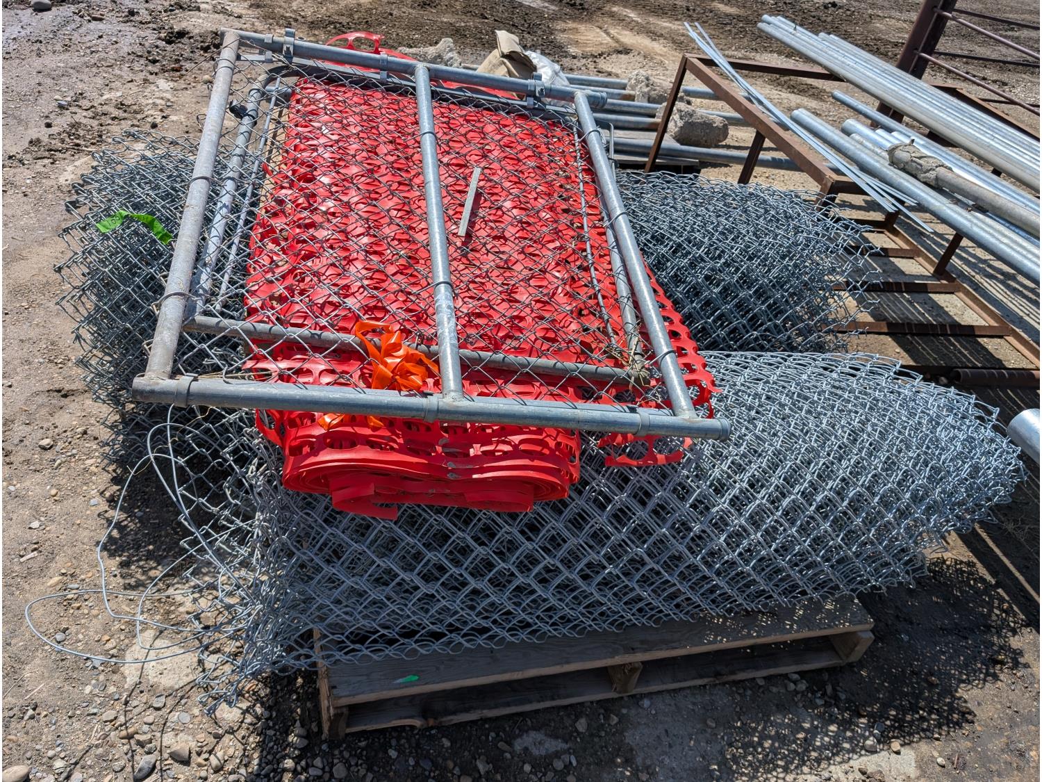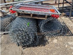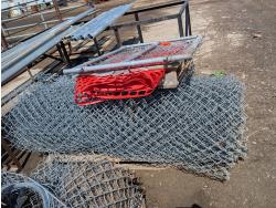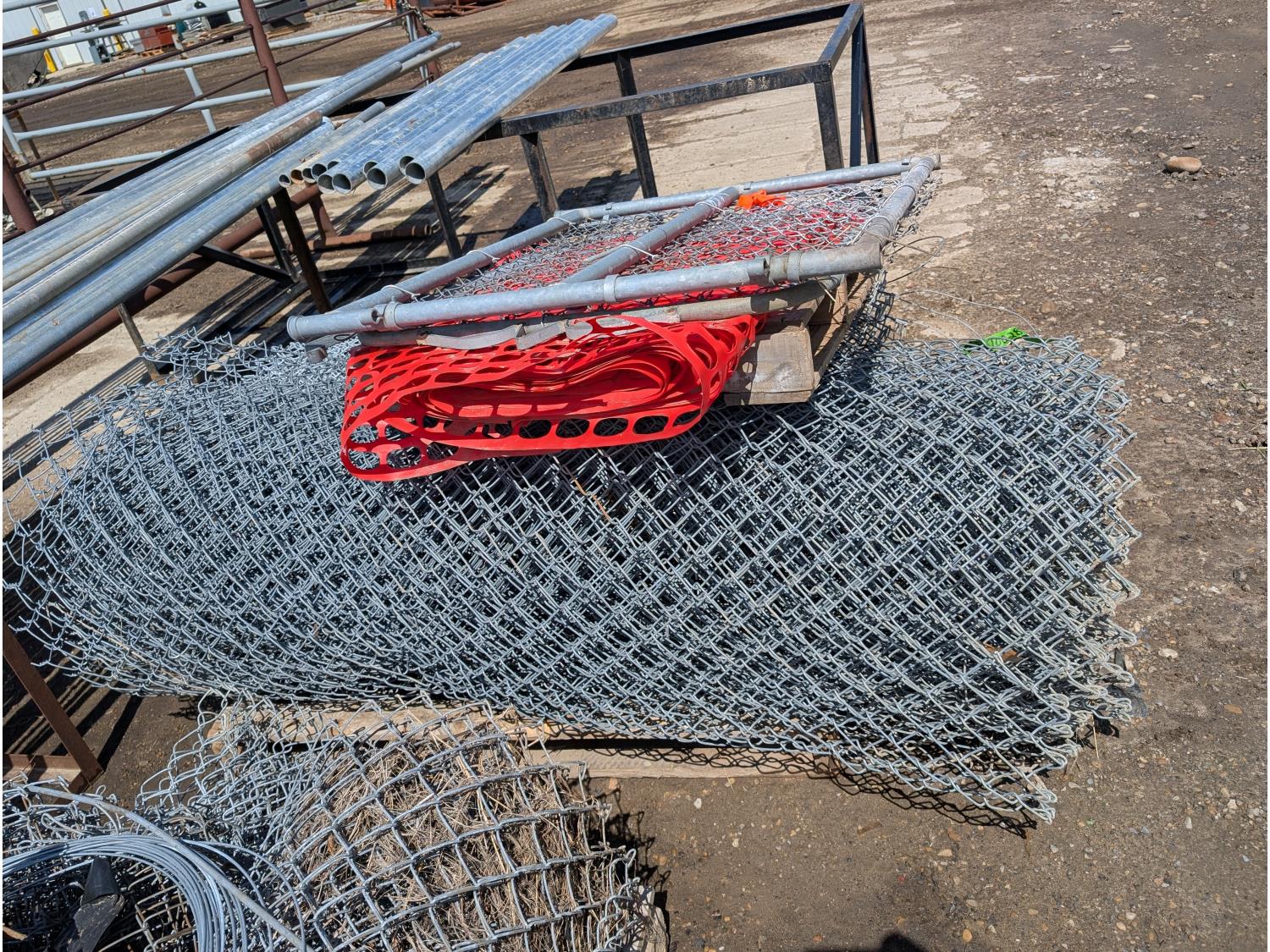 (6) rolls of chain link fencing from 3 ft to 5-1/2 ft lengths, (2) 3 ft gates, various chain link posts from 6 ft to 9 ft 21 ft top rails, various hardware, roll of snow fence
