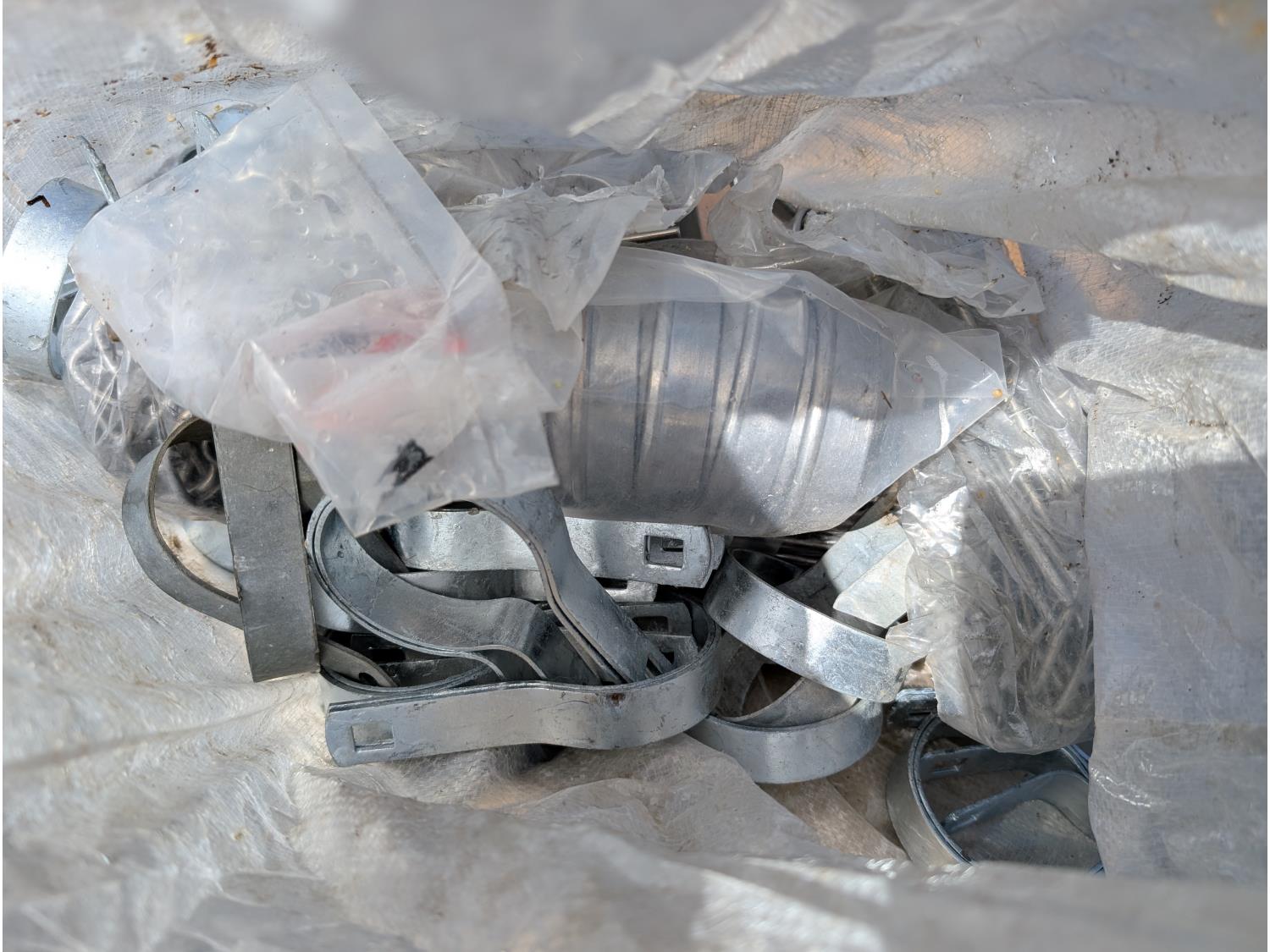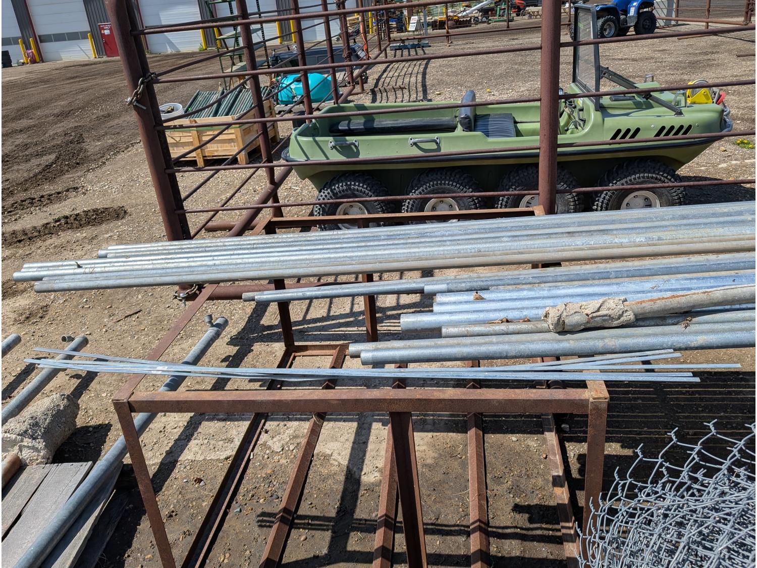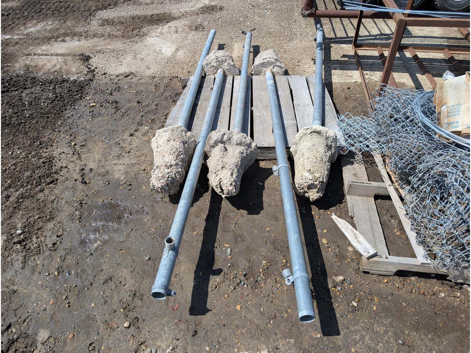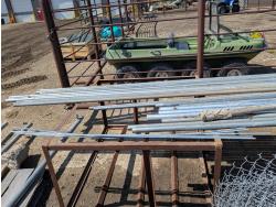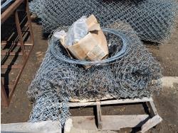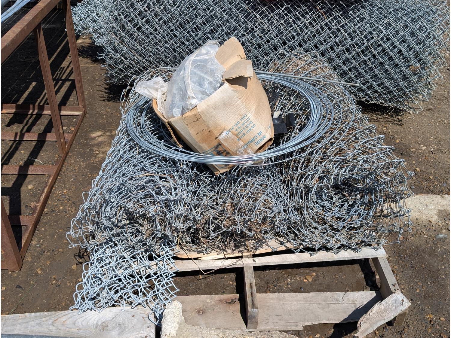 (6) rolls of chain link fencing from 3 ft to 5-1/2 ft lengths, (2) 3 ft gates, various chain link posts from 6 ft to 9 ft 21 ft top rails, various hardware, roll of snow fence