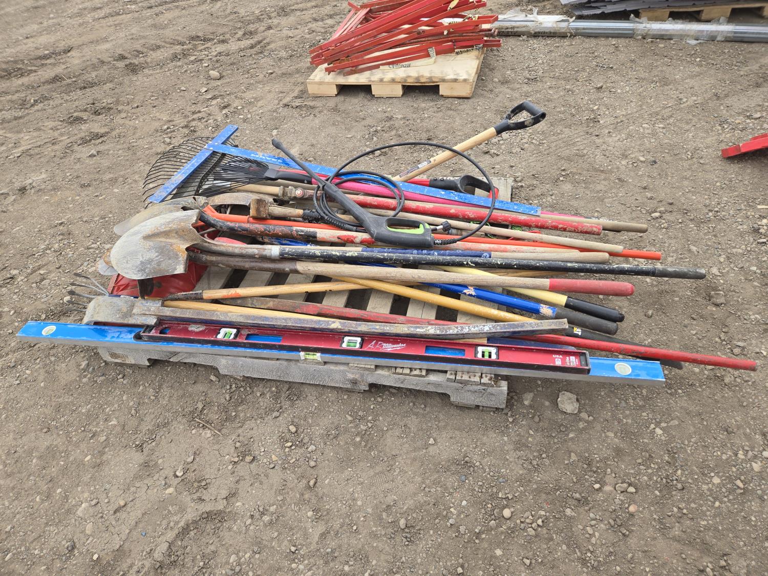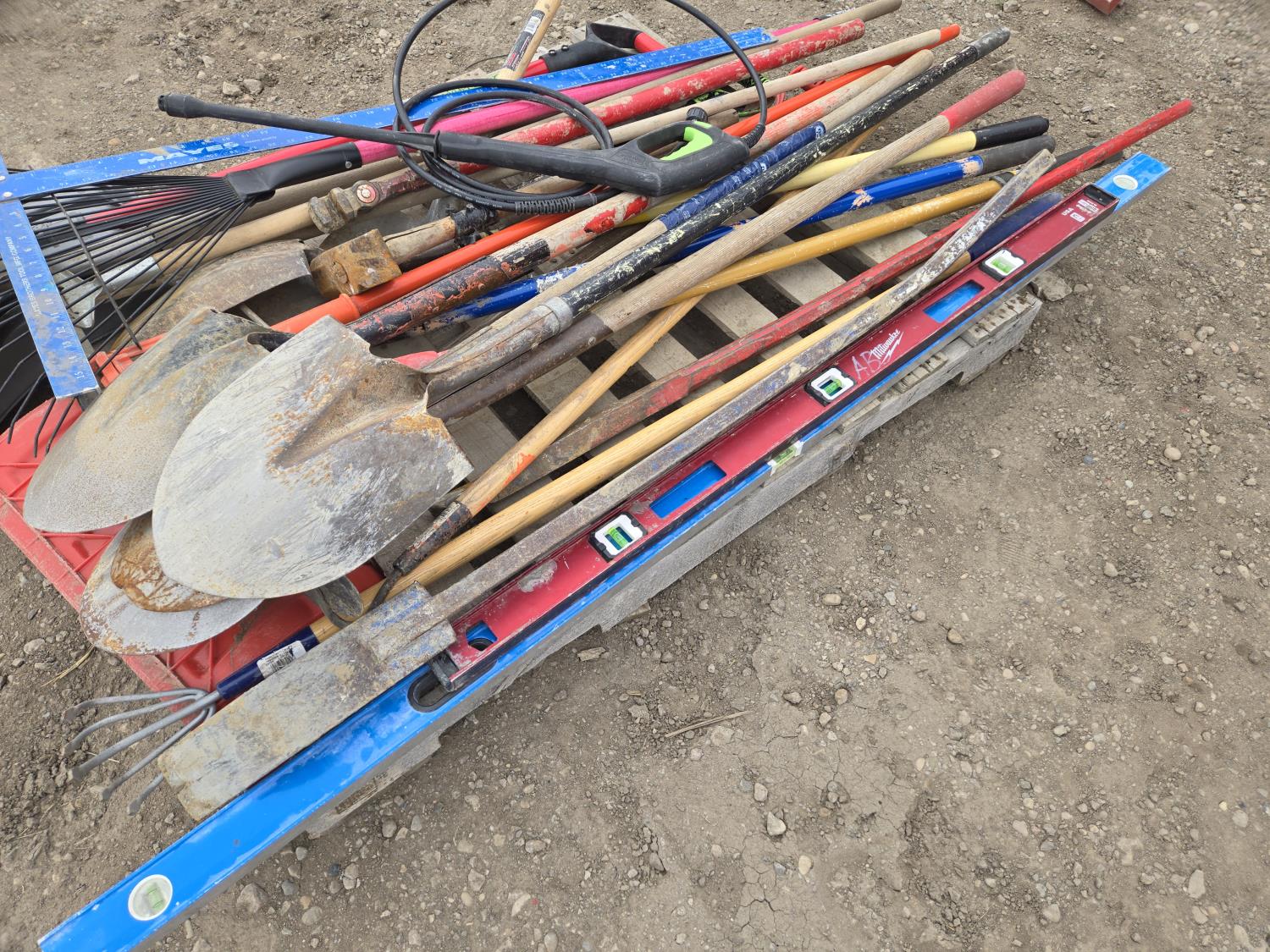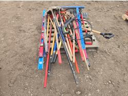 shovels, rake, levels, bar, hammers, miscellaneous tools