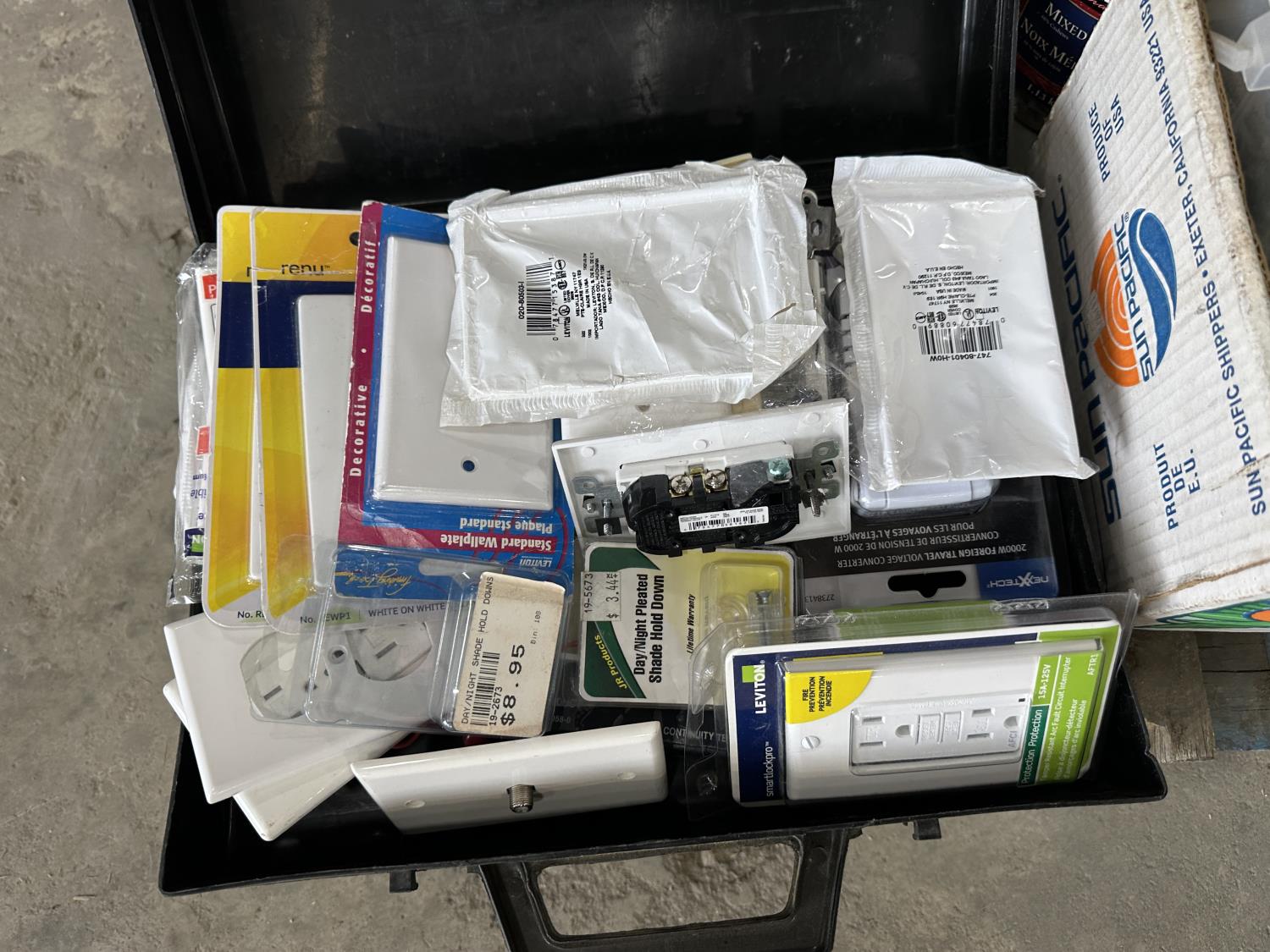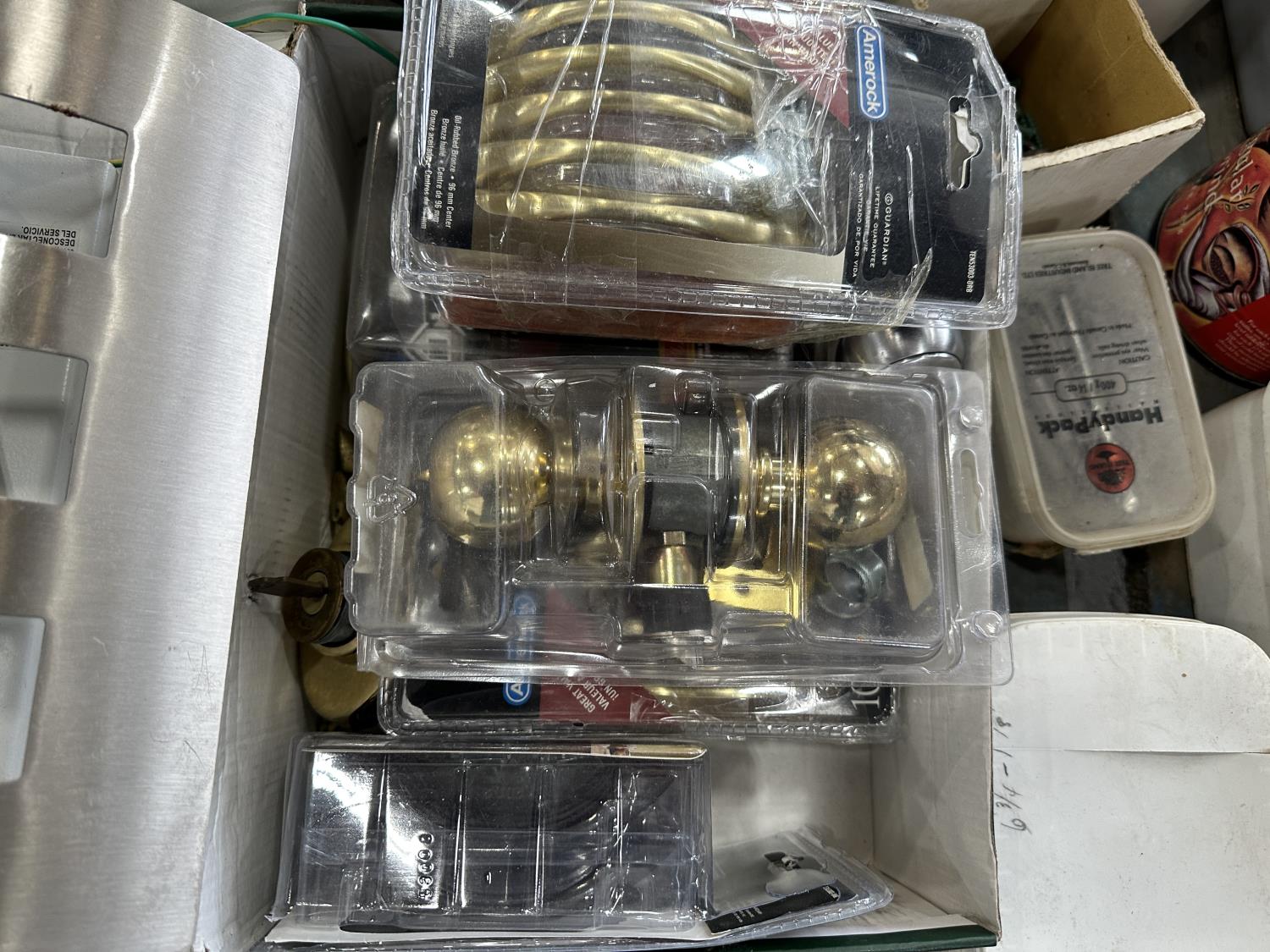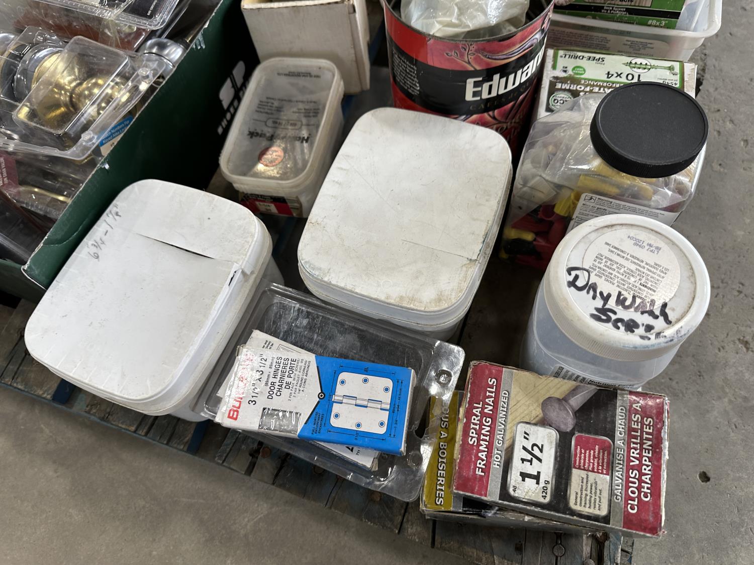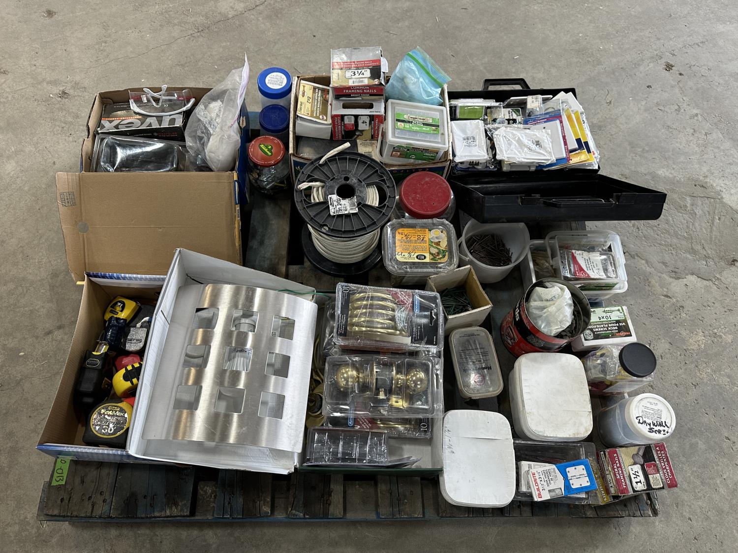 Door knobs, drawer pulls, measuring tapes, safety goggles, screws, framing nails, electrical supplies, door hinges,