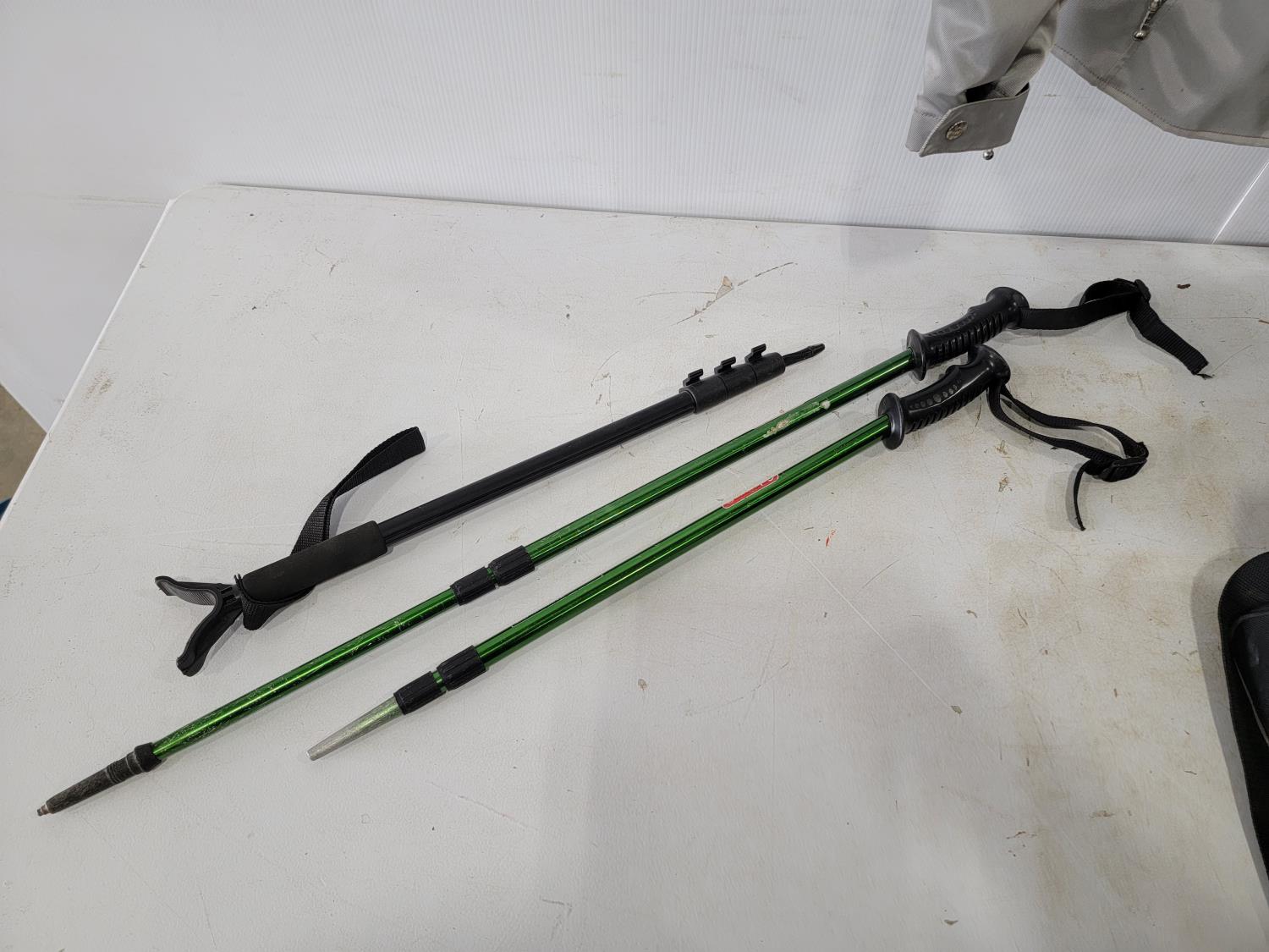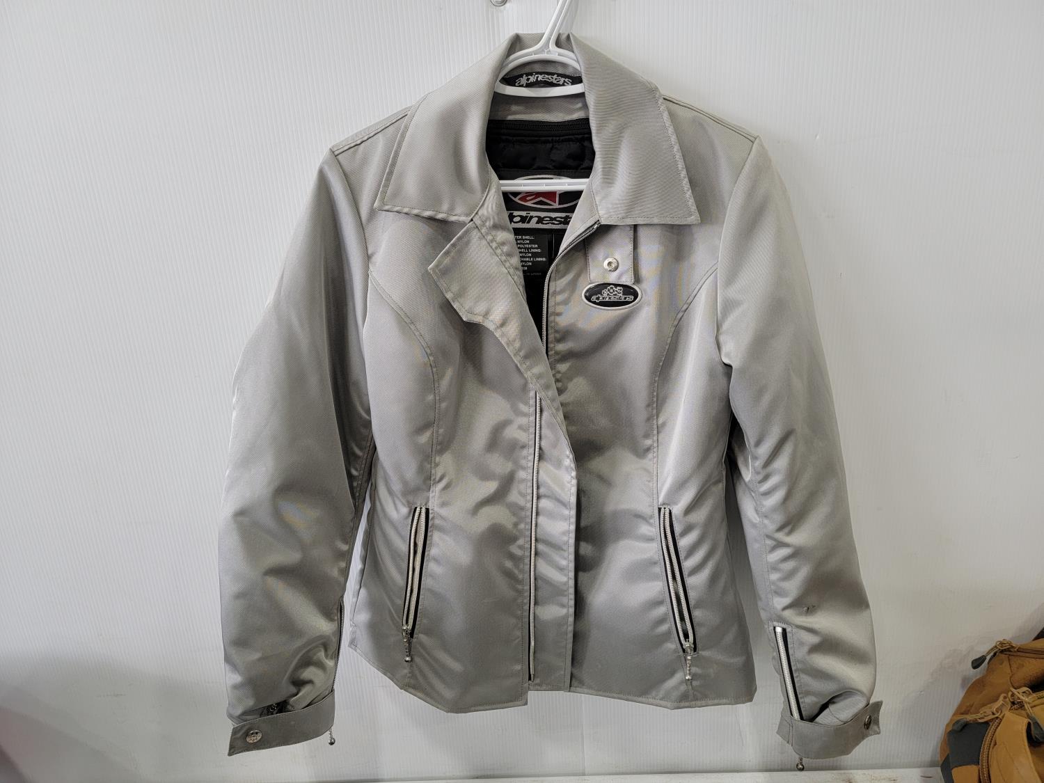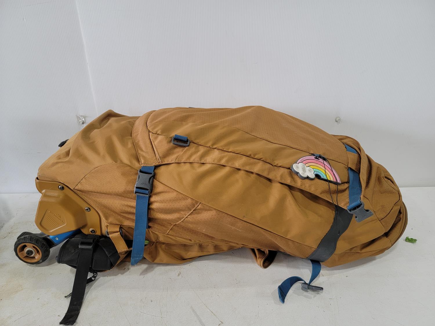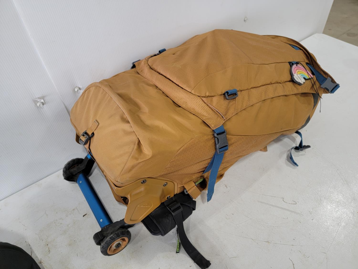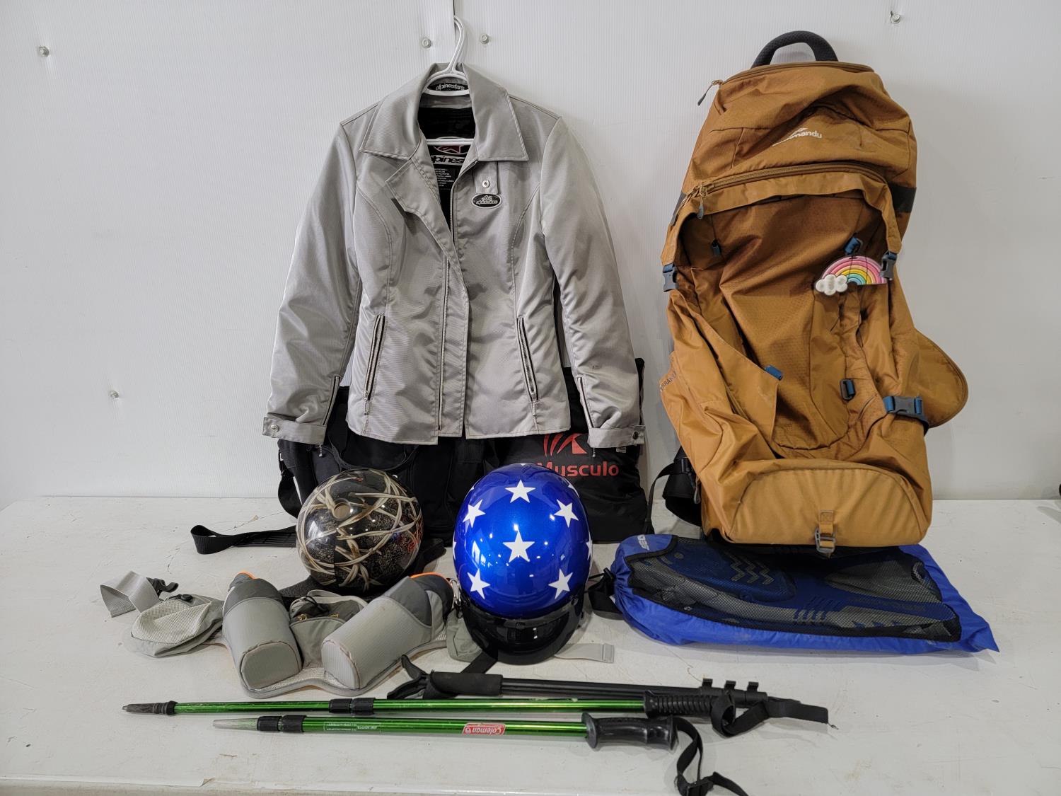 women's small motorcycle jacket, hike pack with (2) flasks, XL Dayton cruiser helmet, bowling ball, (4) tire totes, snorkel gear, trekking poles, 70L Kathmandu wheeled backpack