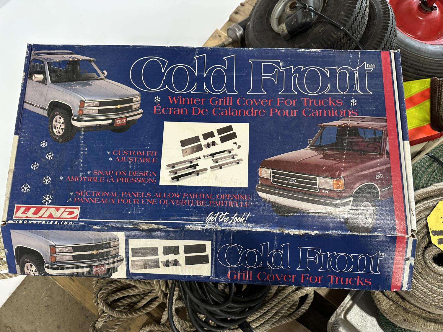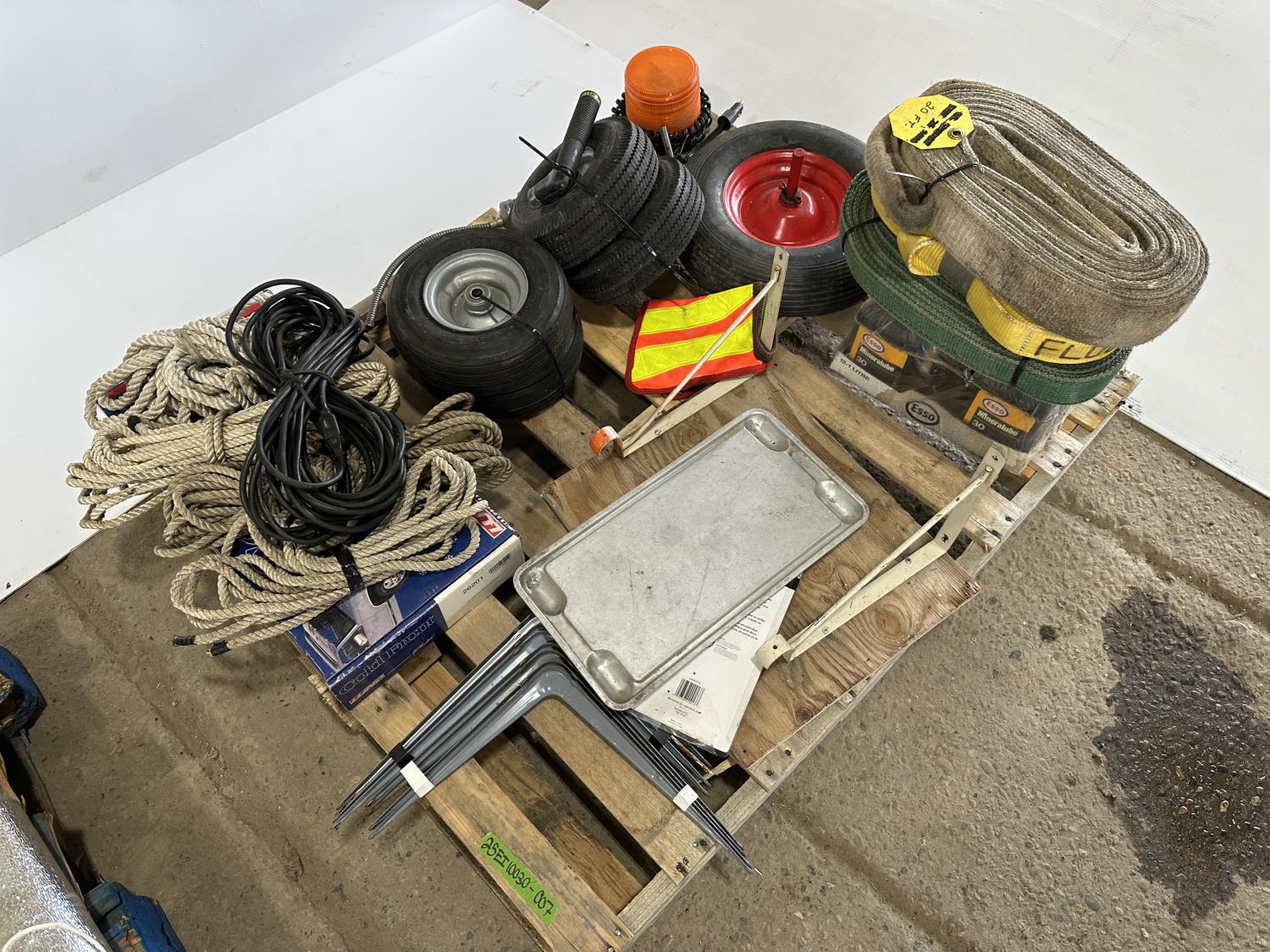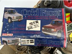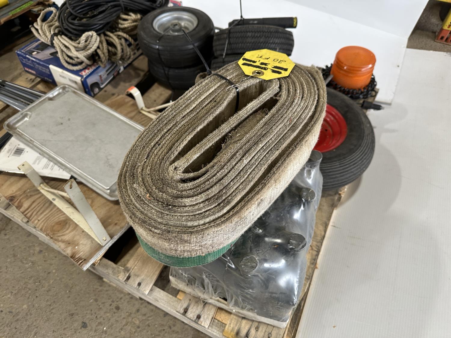 Slings, utility tires, oil, ropes, cold front winter grill cover, beacon light