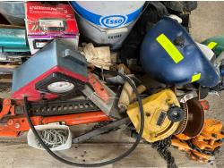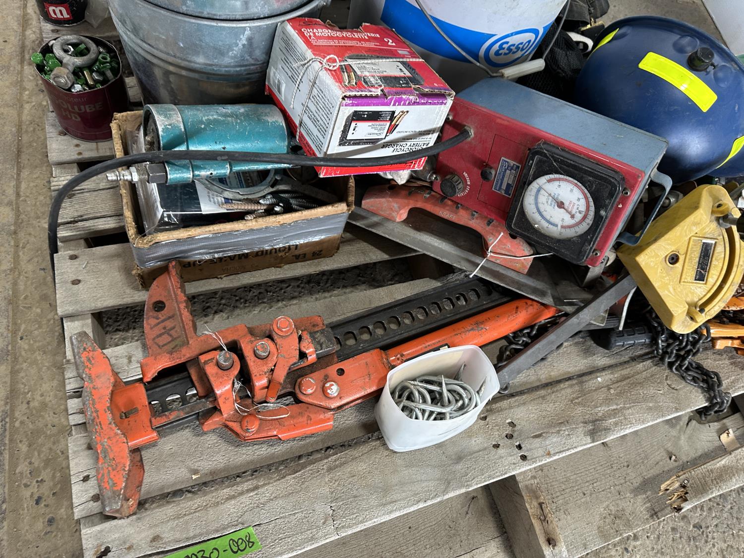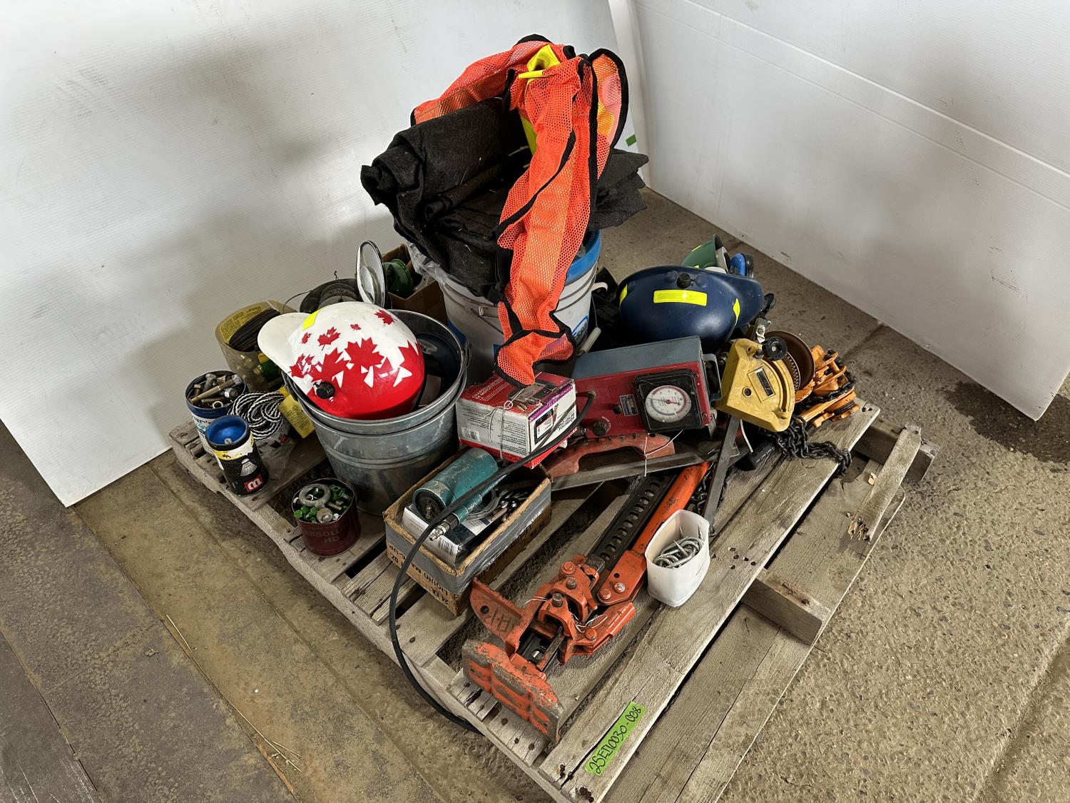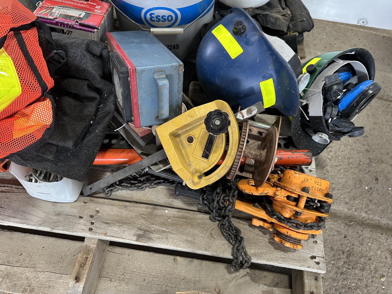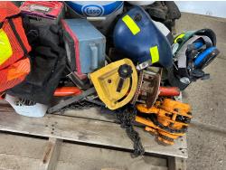 Various hardware, jack-all, chain, come-along, hardhats