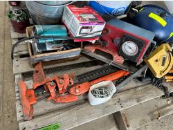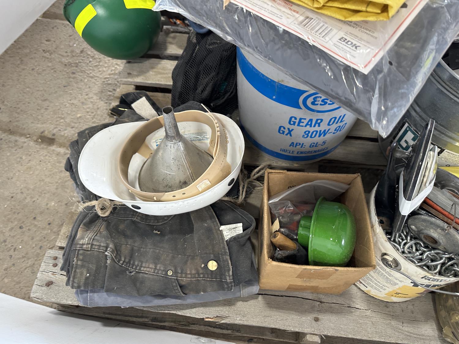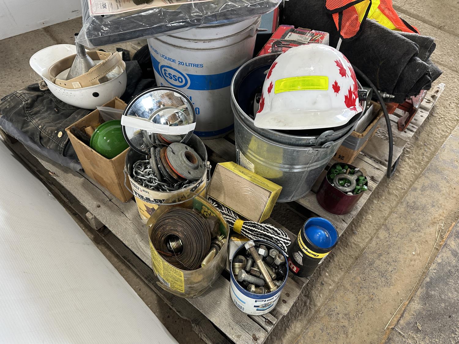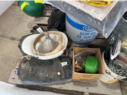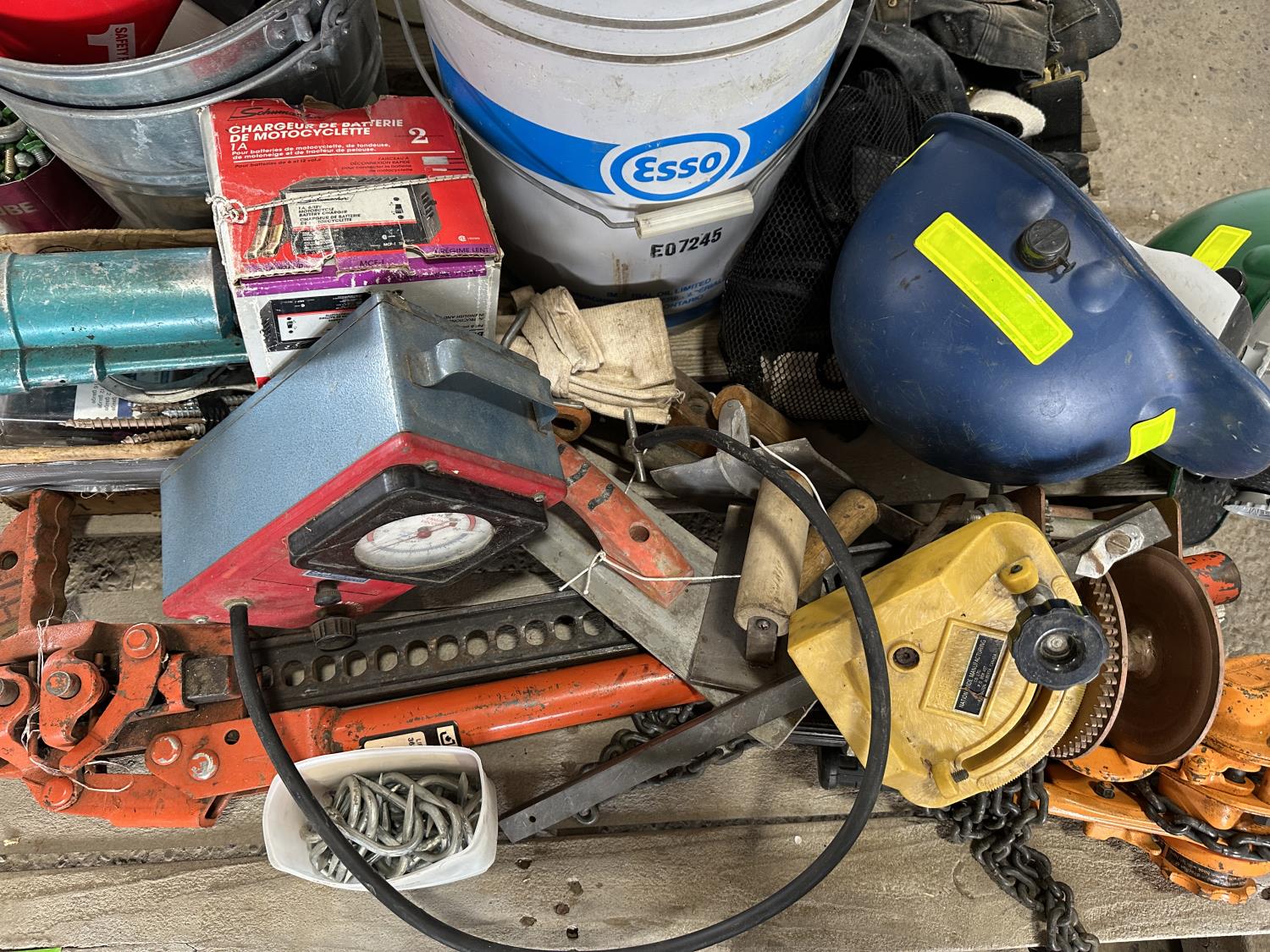 Various hardware, jack-all, chain, come-along, hardhats