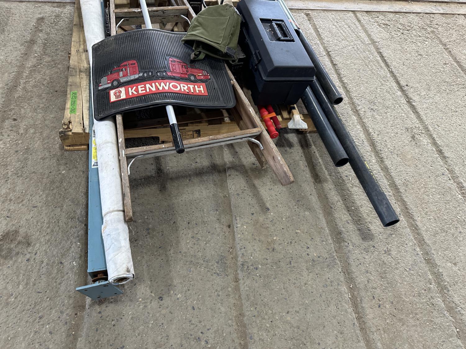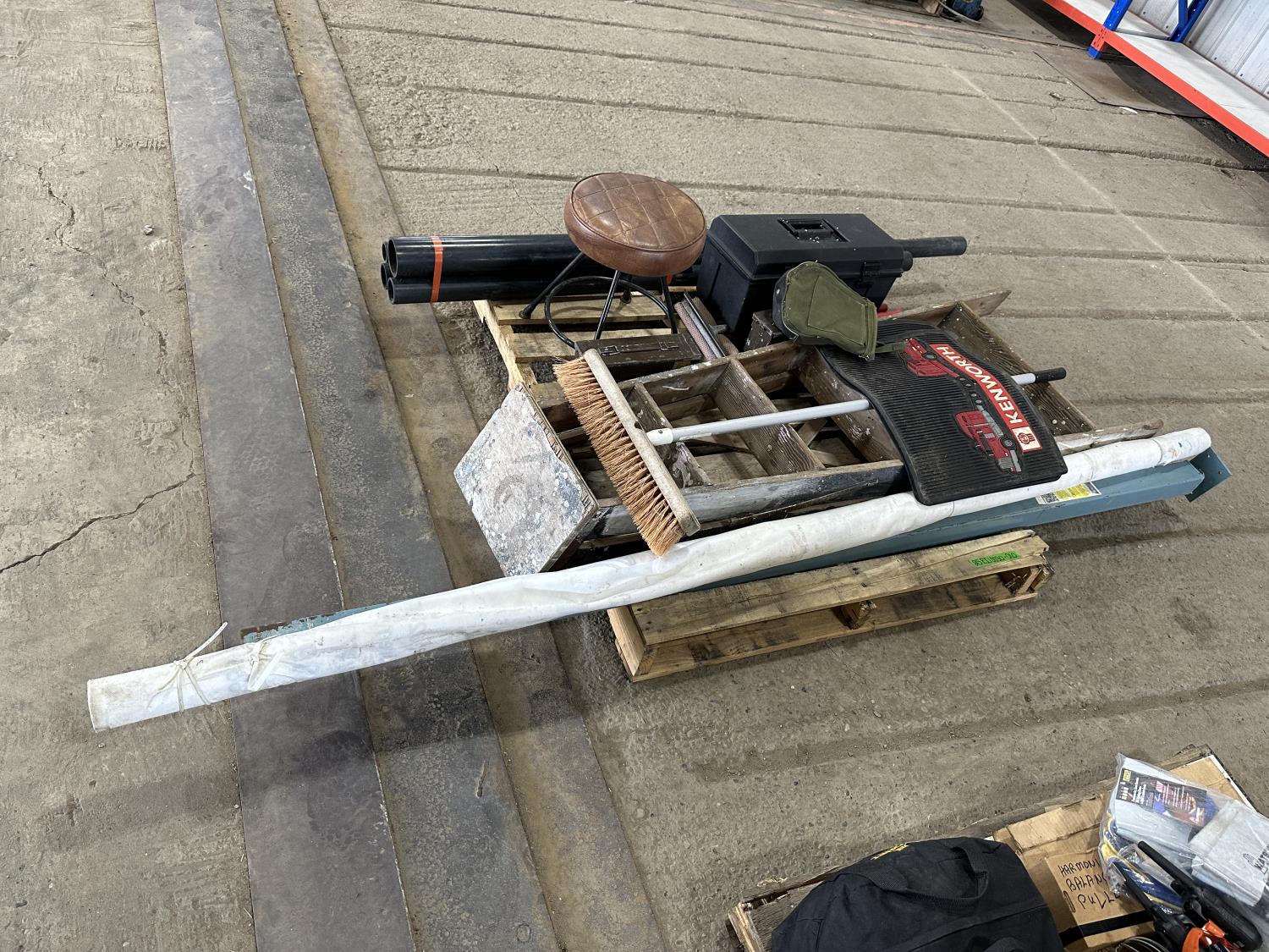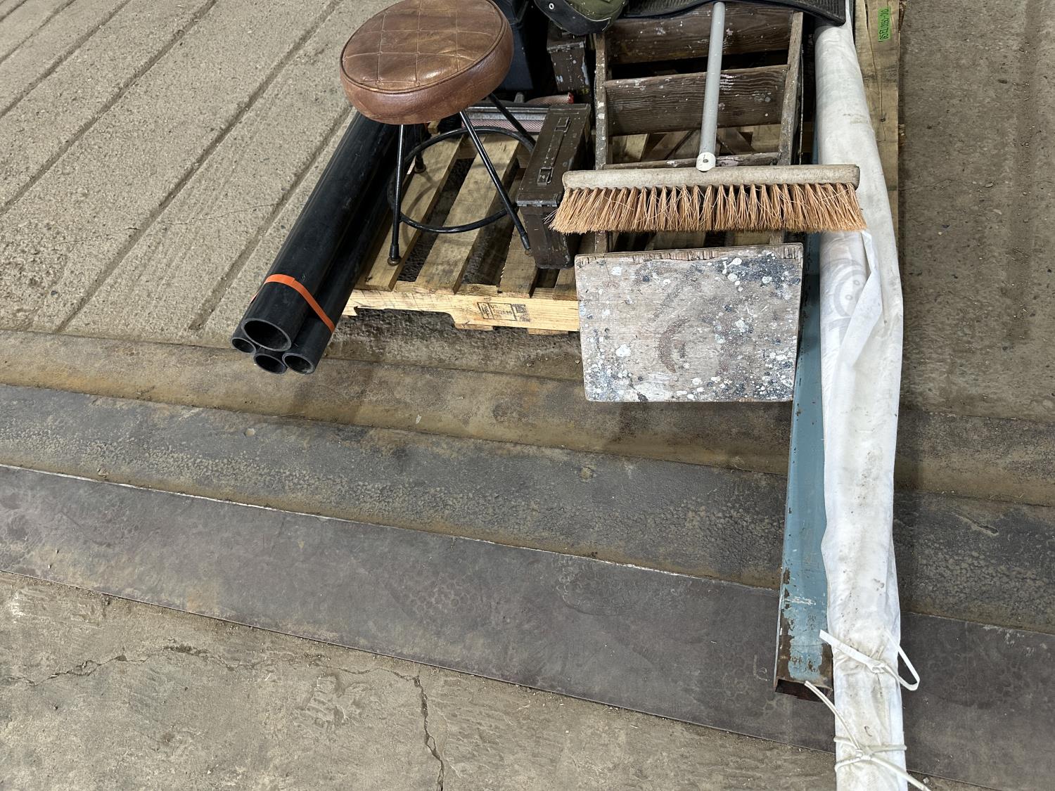 Telepost, Tyvek house wrap, ammunition boxes, Kenworth mud flaps, broom, PVC pipe