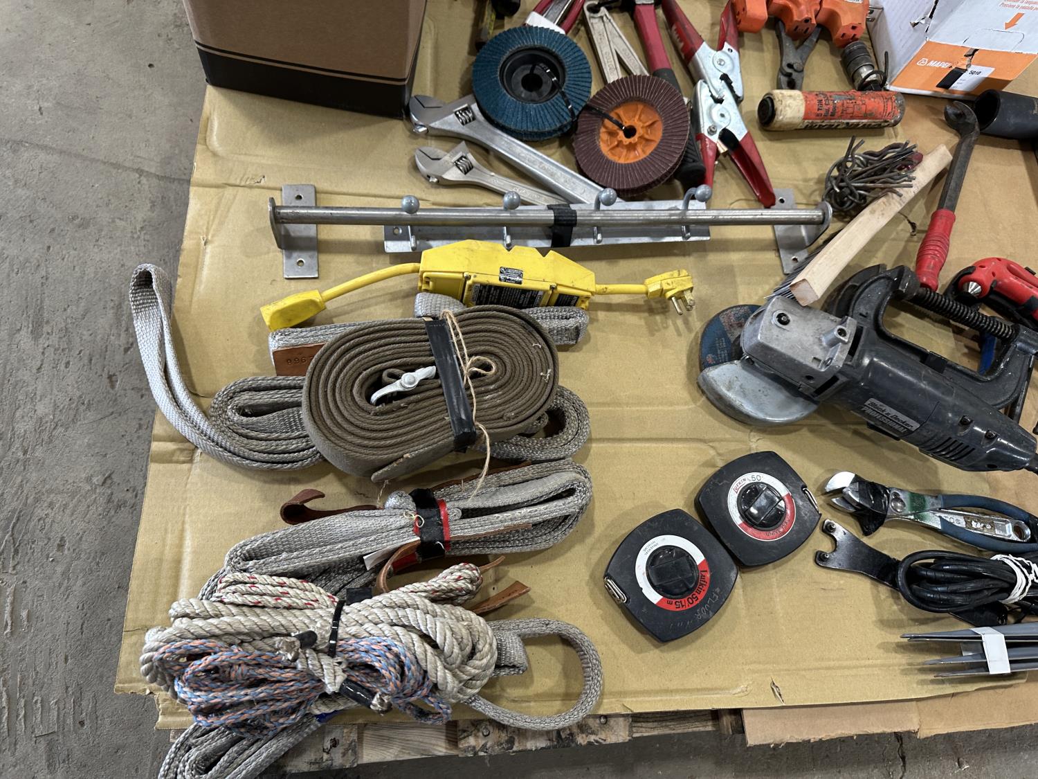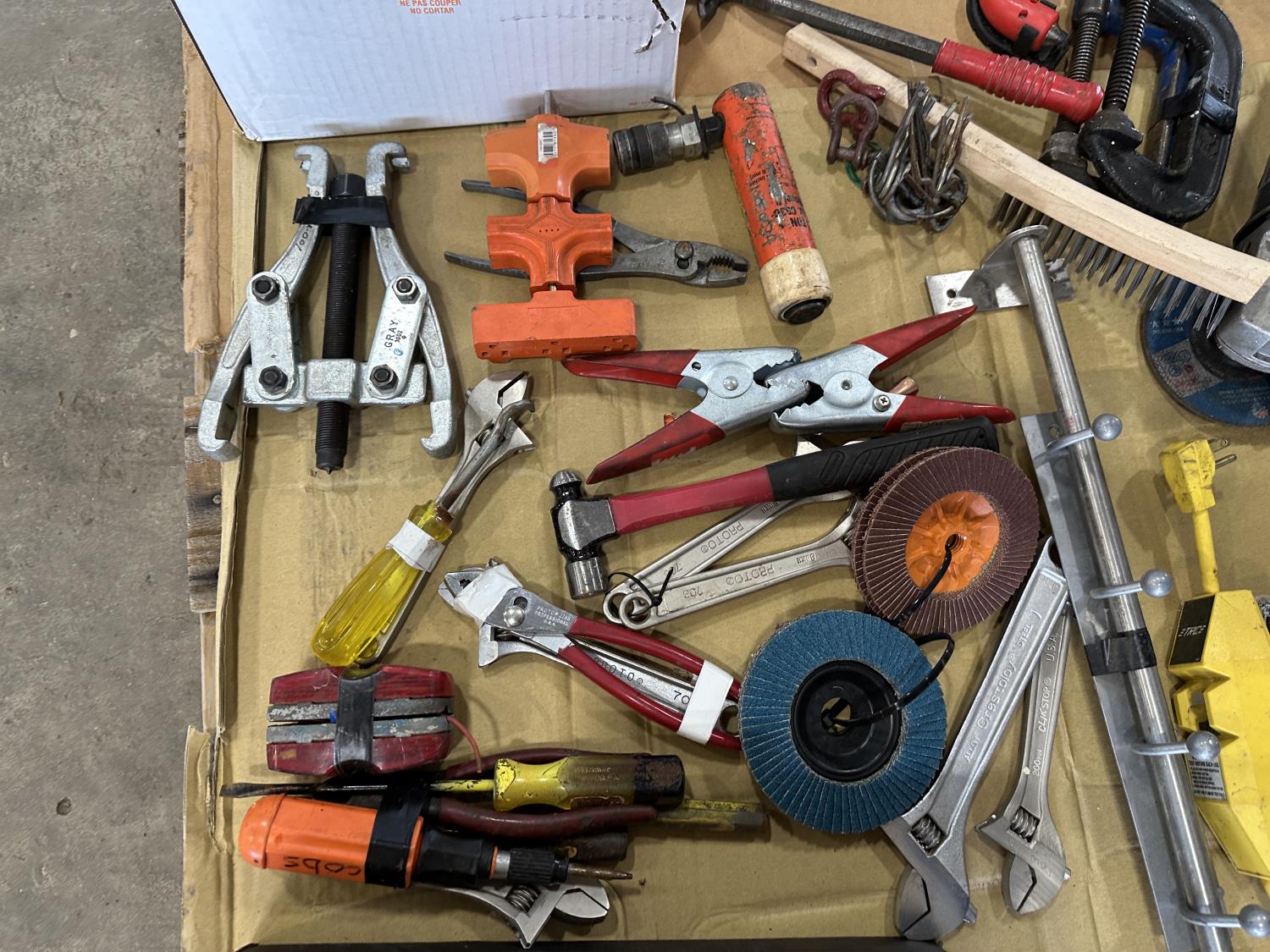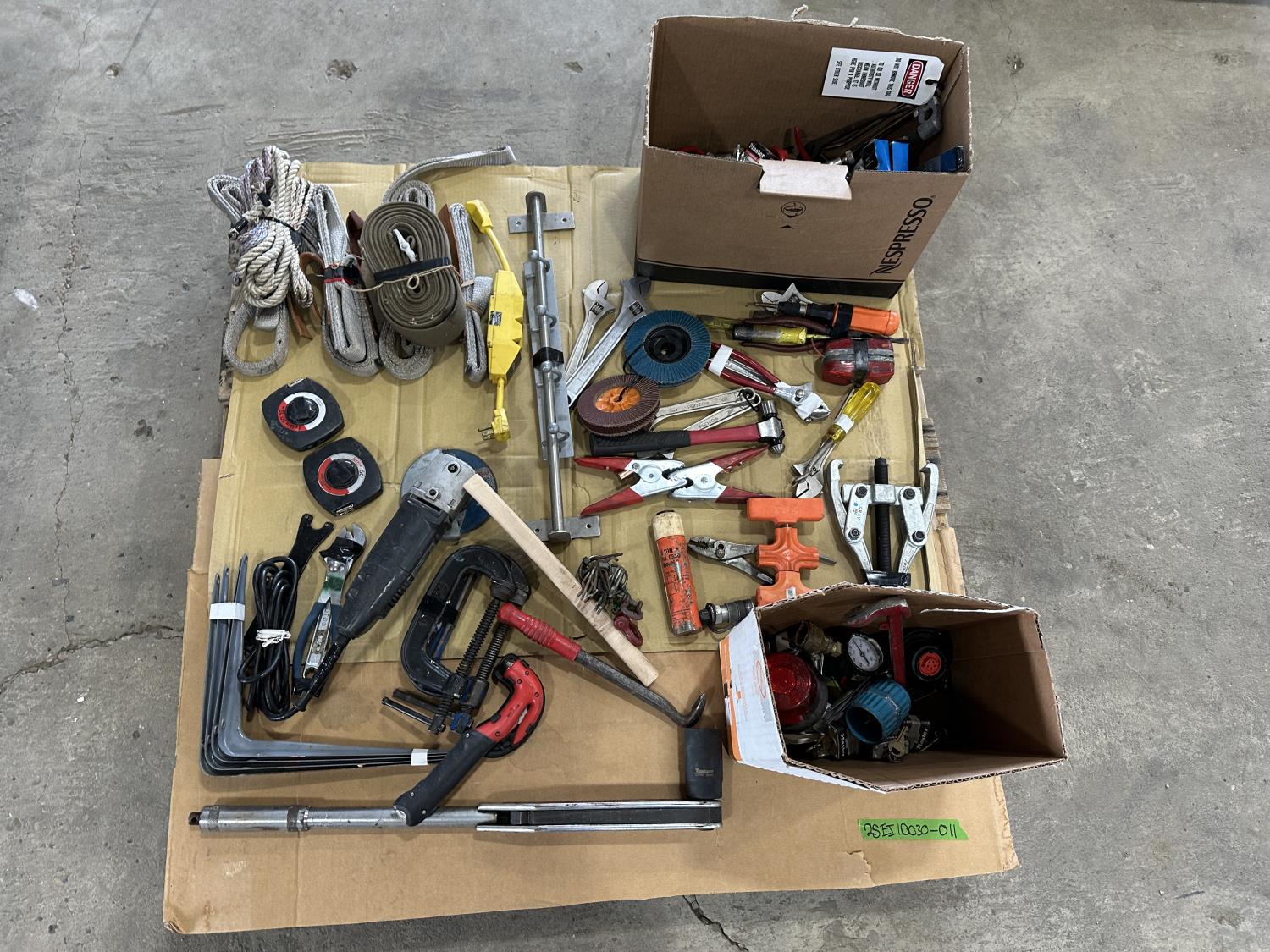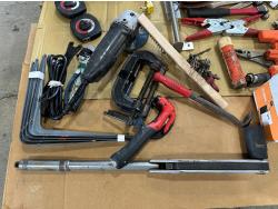 C-clamps, angle grinder, shelf brackets, wire brush, slings, wrenches, hand tools