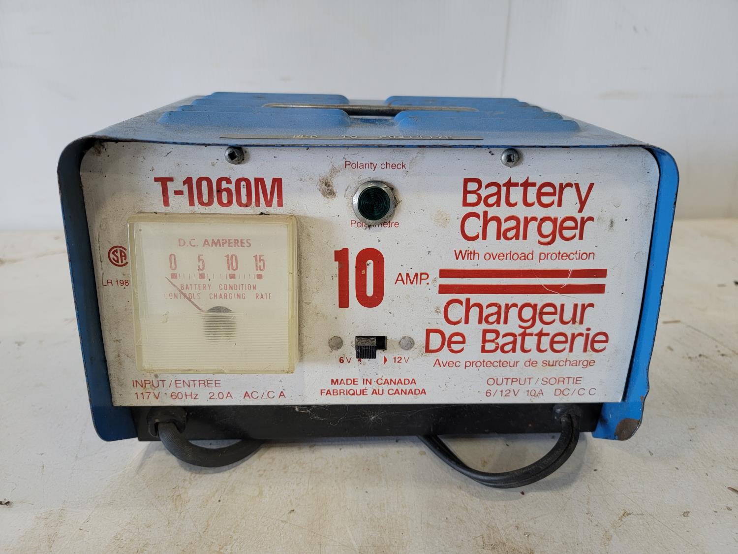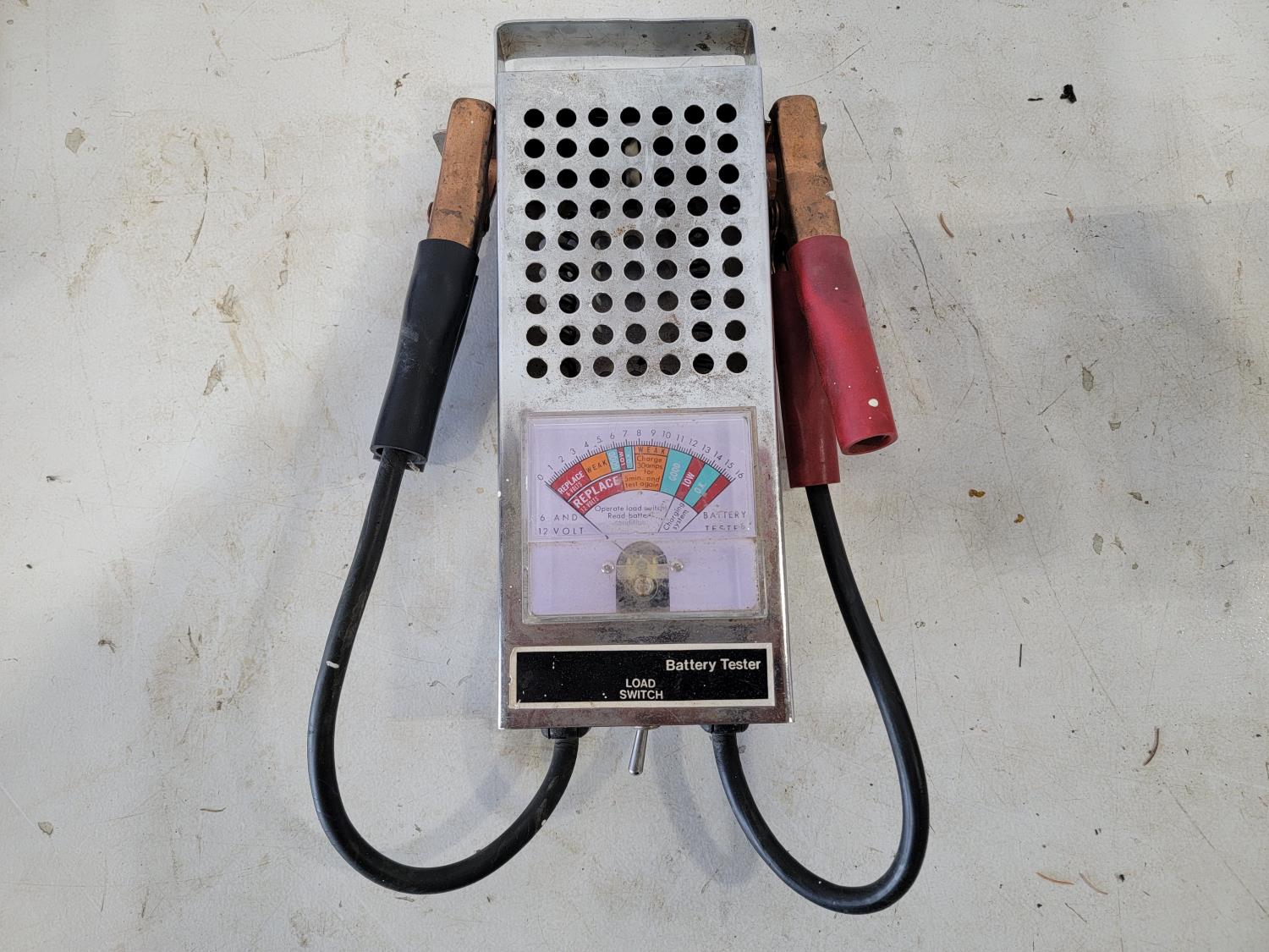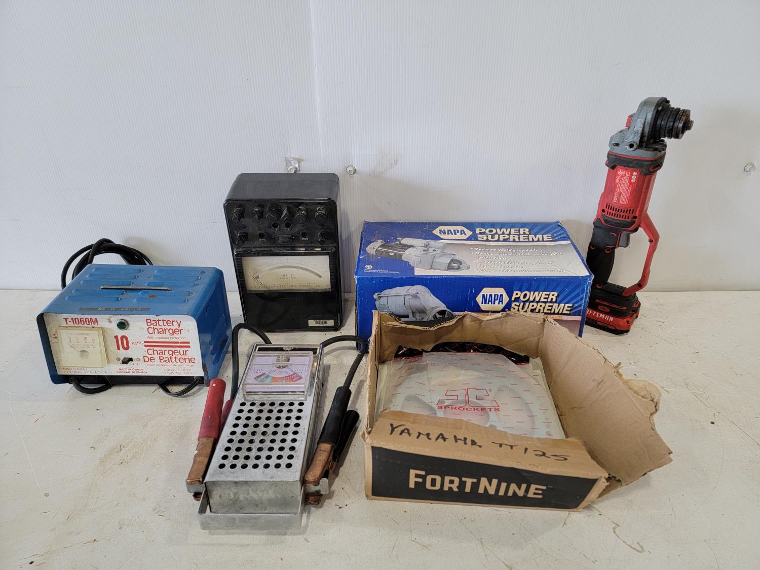 10 amp battery charger, battery load tester, (2) sprockets, motor starter, angle grinder (inoperable)