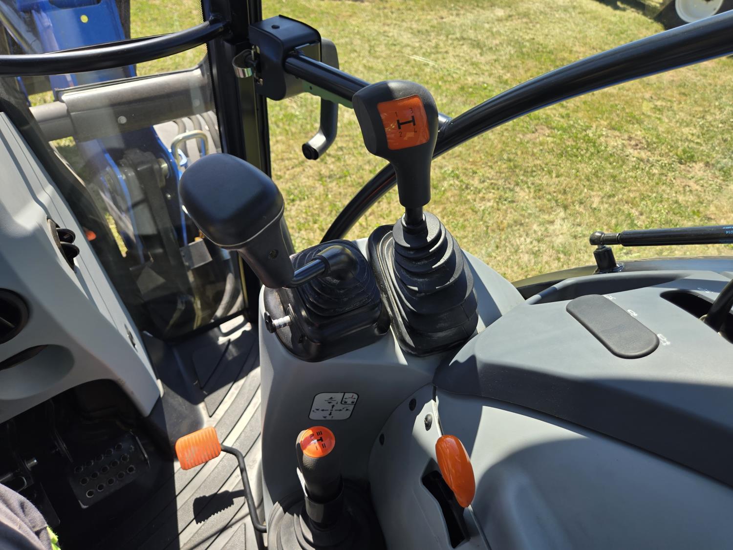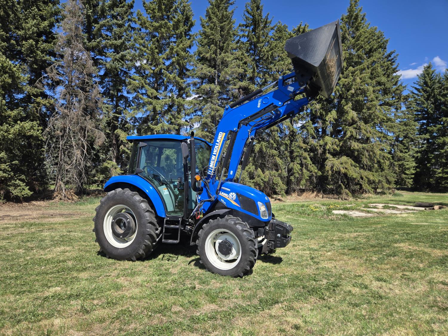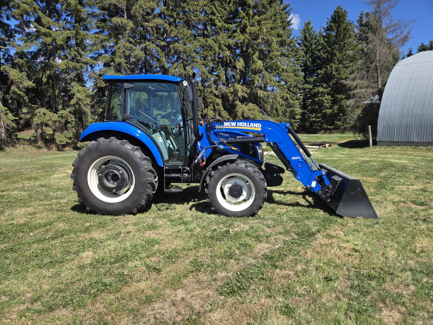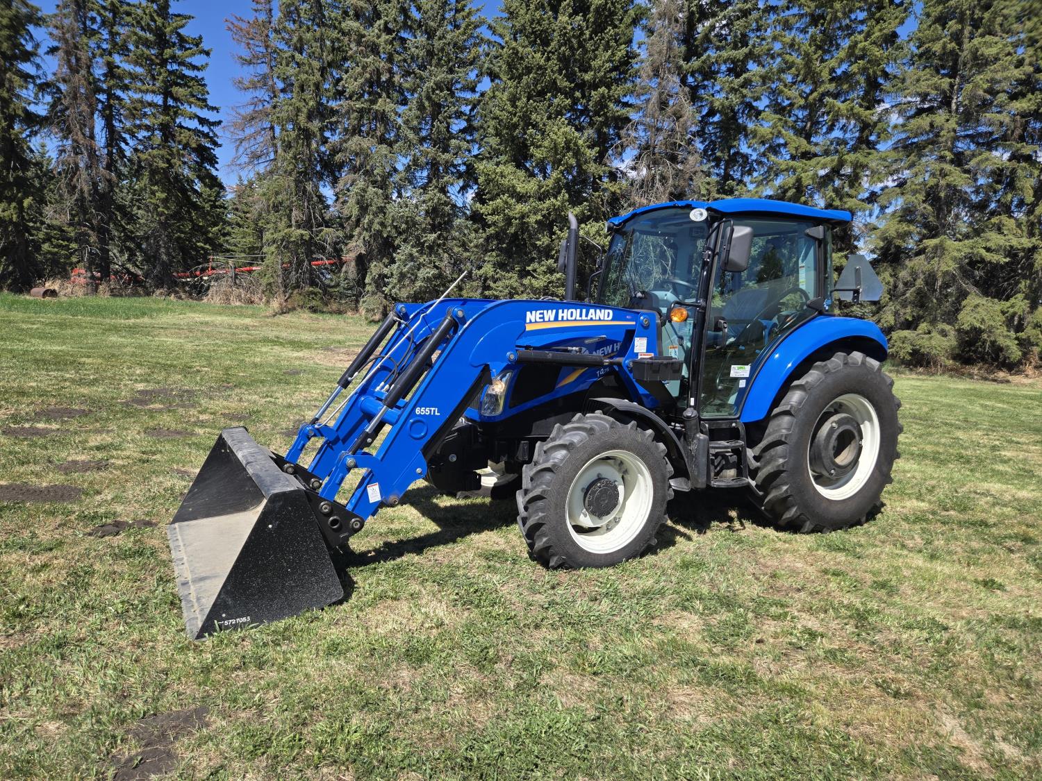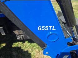 New Holland 655TL loader, Q/A, 72 inch bucket, mid mount hydraulic connection, FPT 3.2 L 4 cylinder 74 HP, diesel engine, 12 speed manual transmission, cab, shuttle shift, rear differential lock, joystick, A/C, radio, buddy seat, front weights, 540 PTO, 3 point hitch, 2 rear hydraulic outlets, rear wheel weights, 280/85R24 front tires, 420/895R30 rear tires, front fenders, front weights