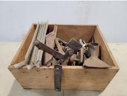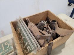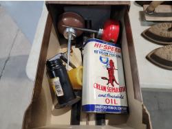 Gasoline can, irons, cigarette tins, milk bottles, license plates