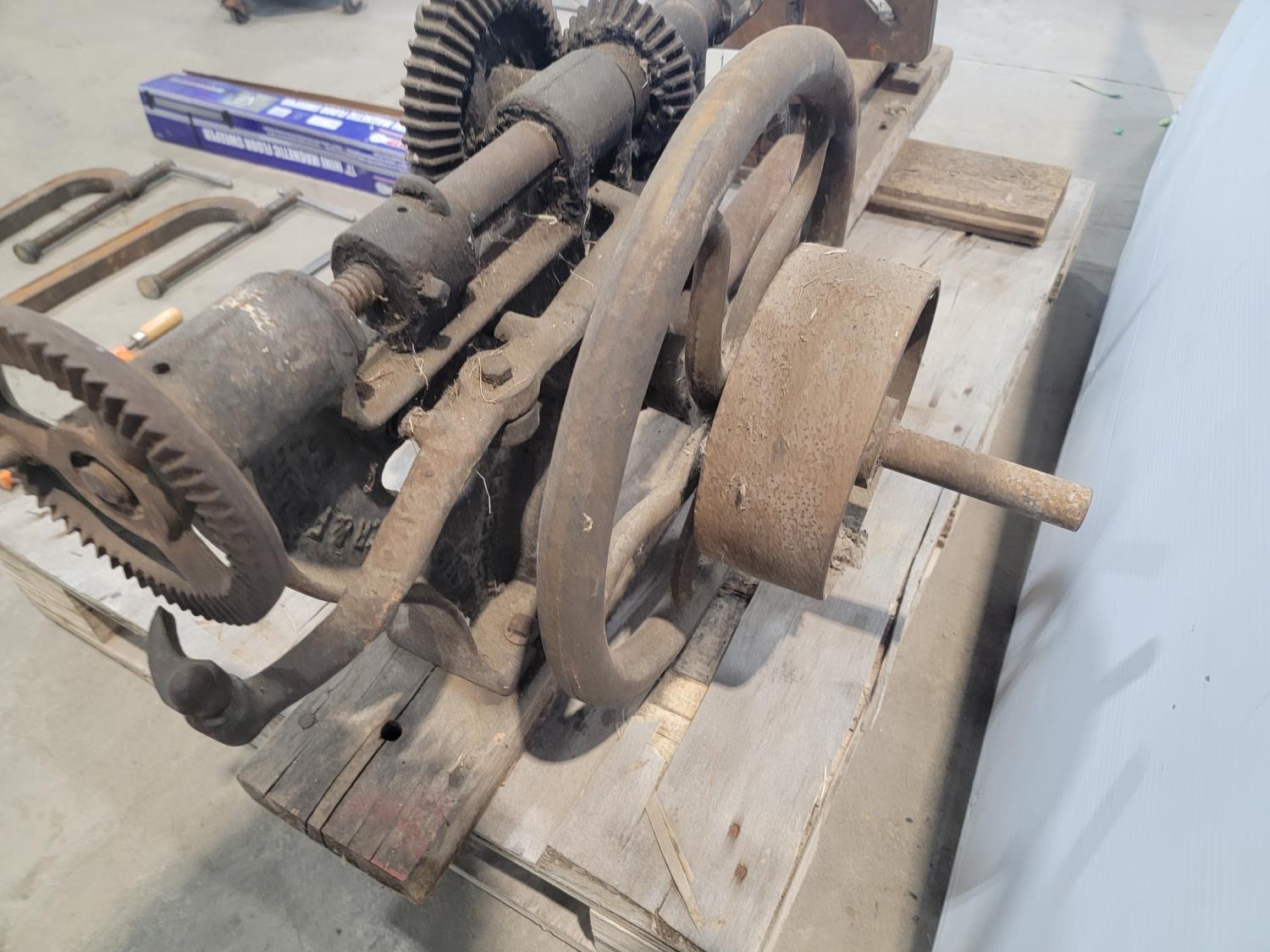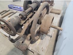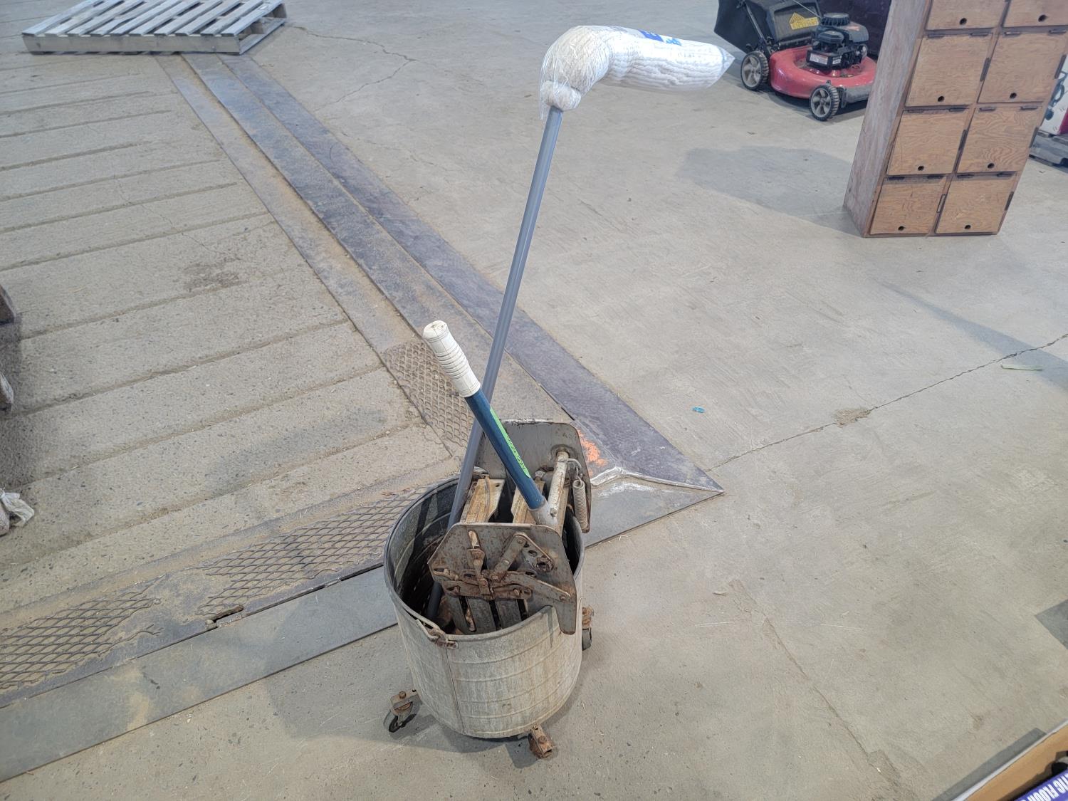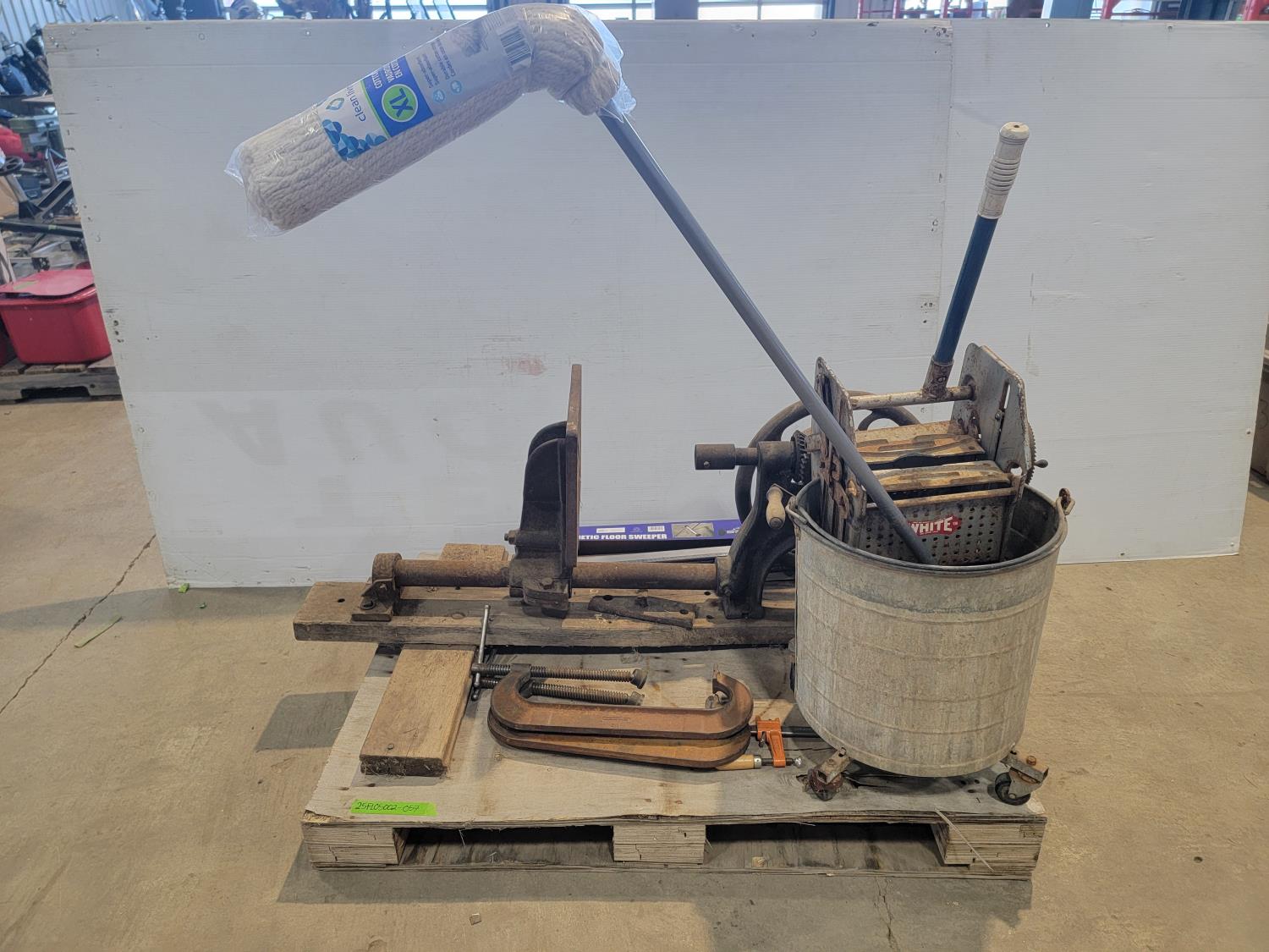 17 inch magnetic floor sweeper, antique drill press, clamps, mop and bucket