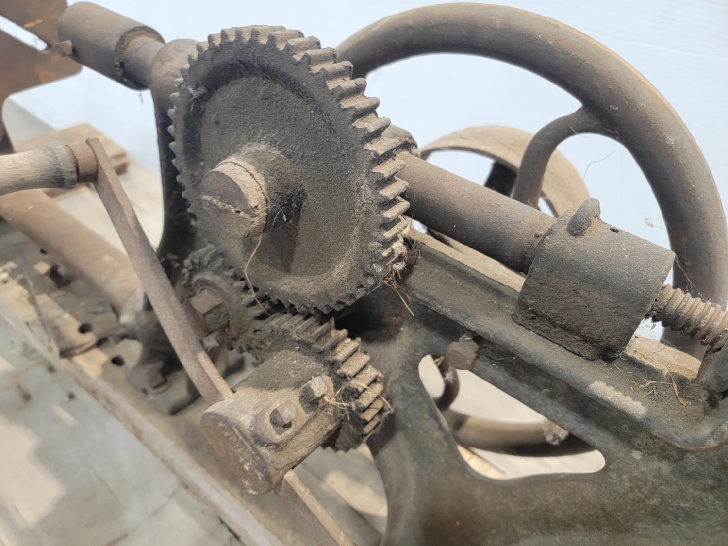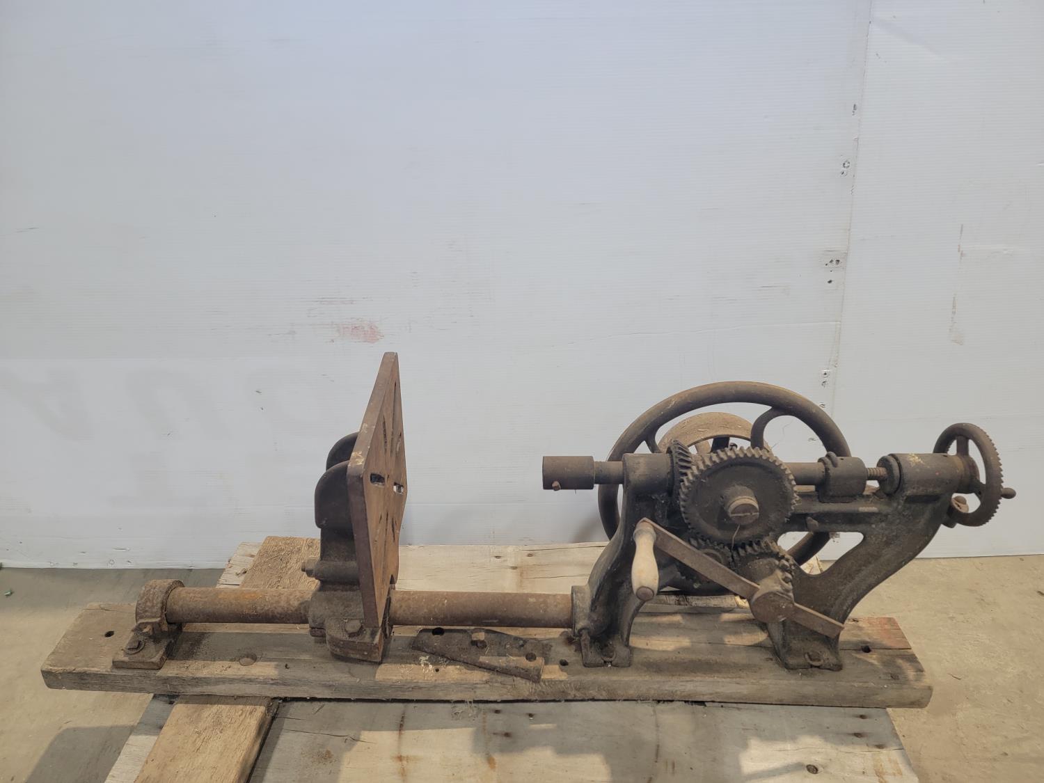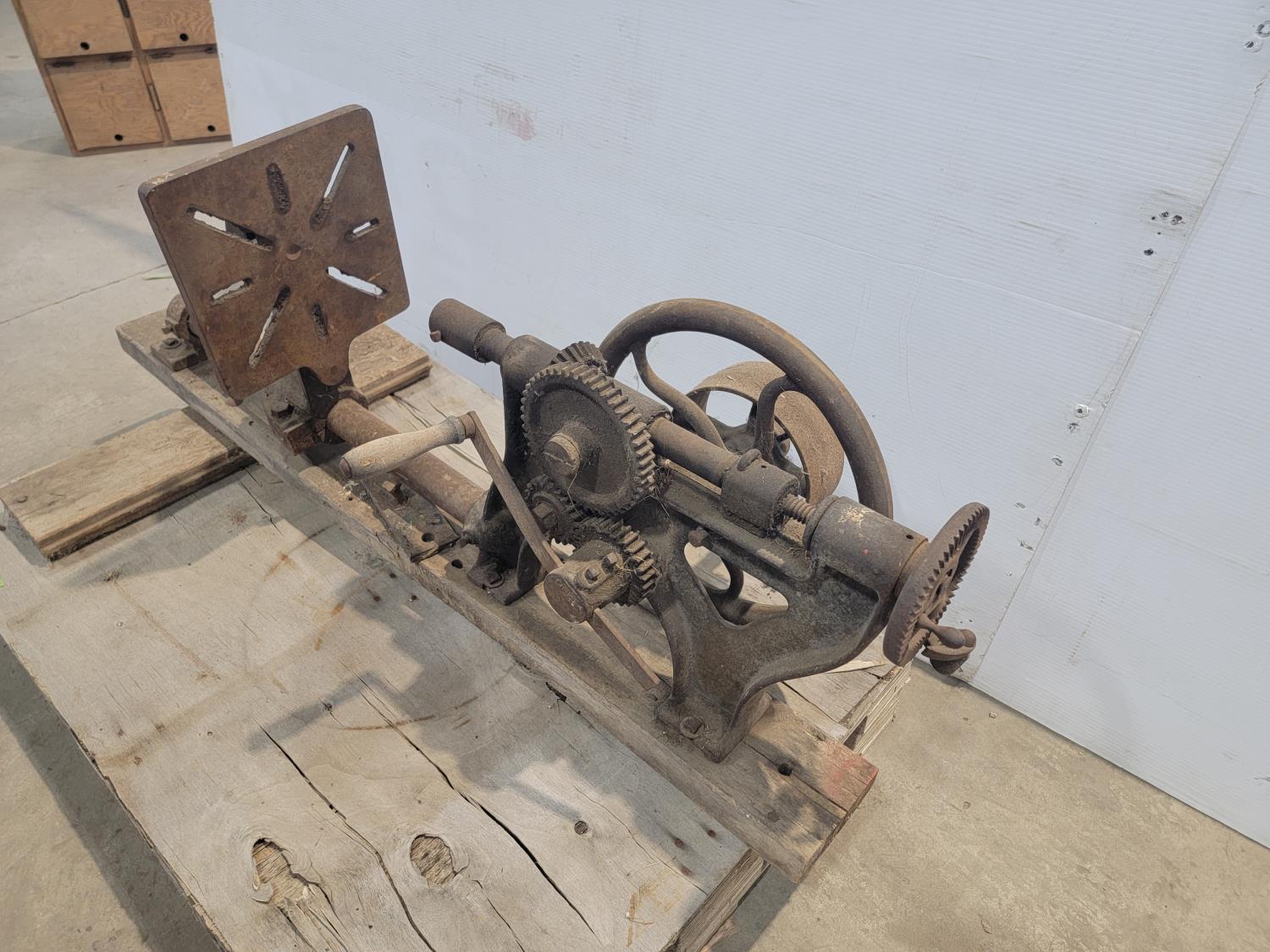 17 inch magnetic floor sweeper, antique drill press, clamps, mop and bucket