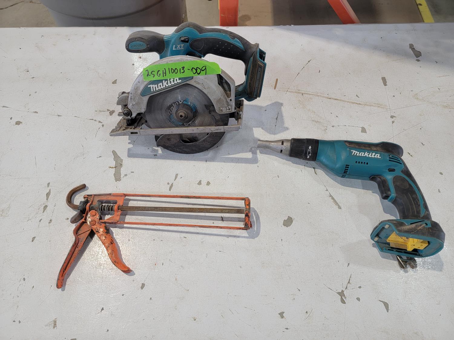 1081 Makita 18V Drill, 6-1/2 Inch Circular Saw and Caulking Gun