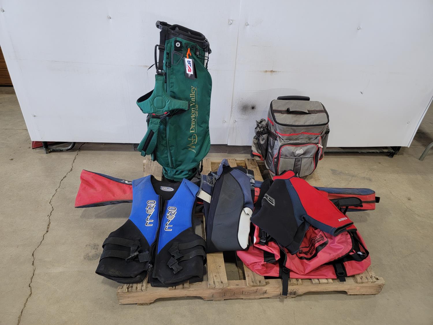 1219 Cooler, Golf Bag, Life Jacket, (2) Wetsuits and O'Brien Water Skis