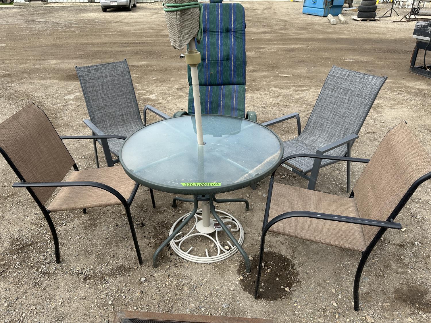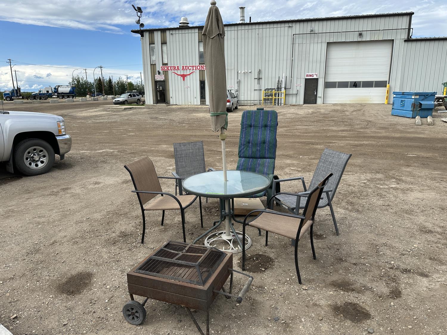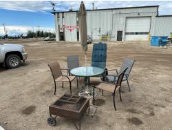1579 Patio Set with (5) Chairs, Umbrella, Base and Portable Fire Pit