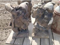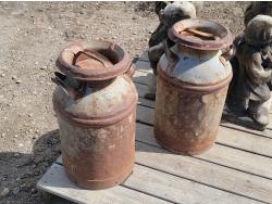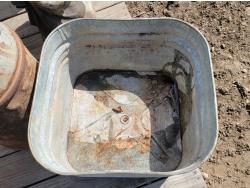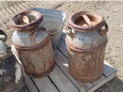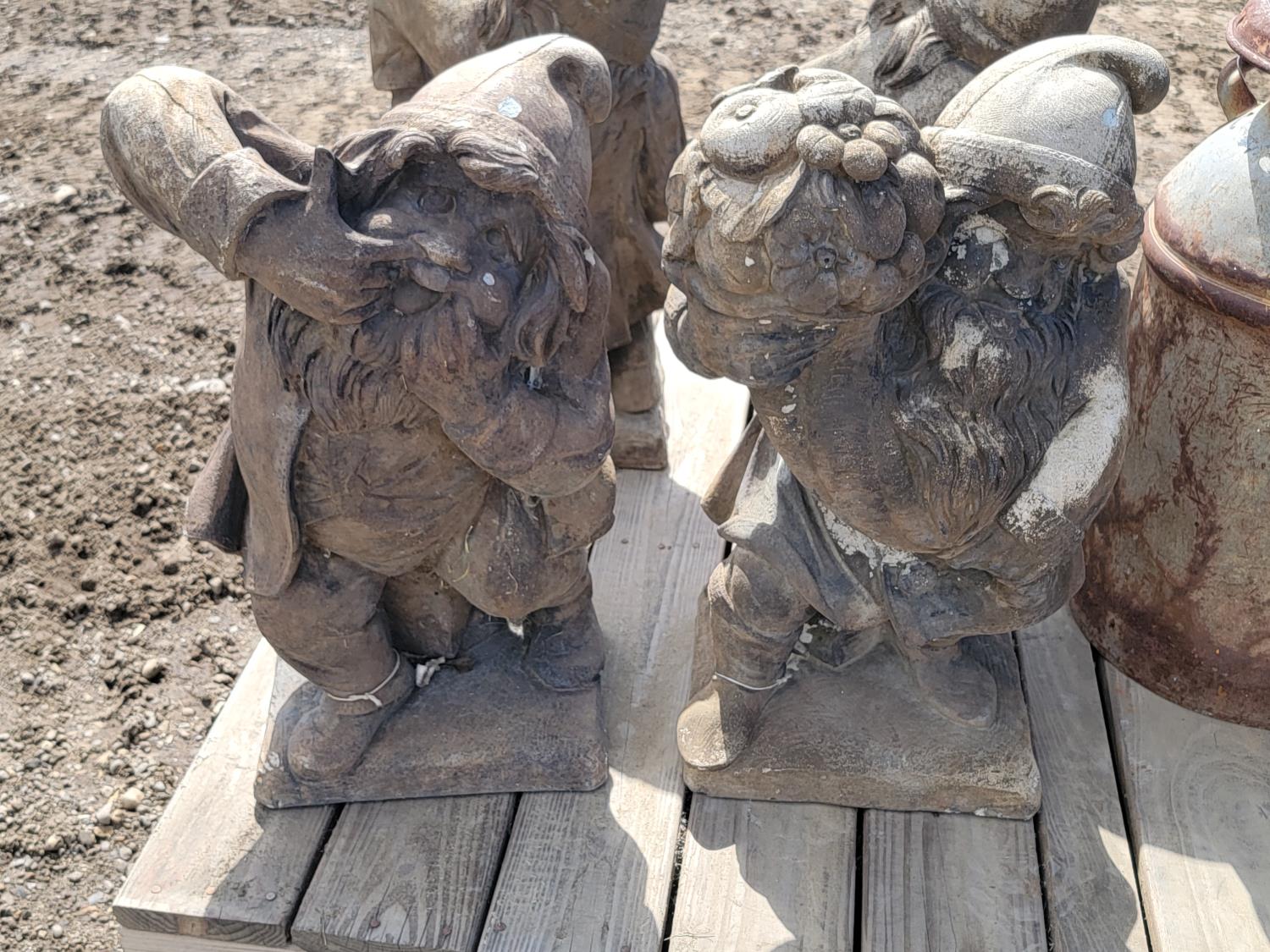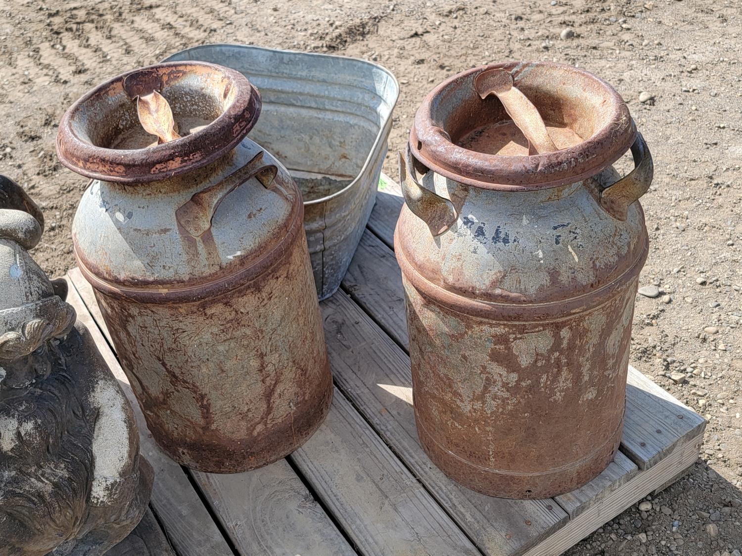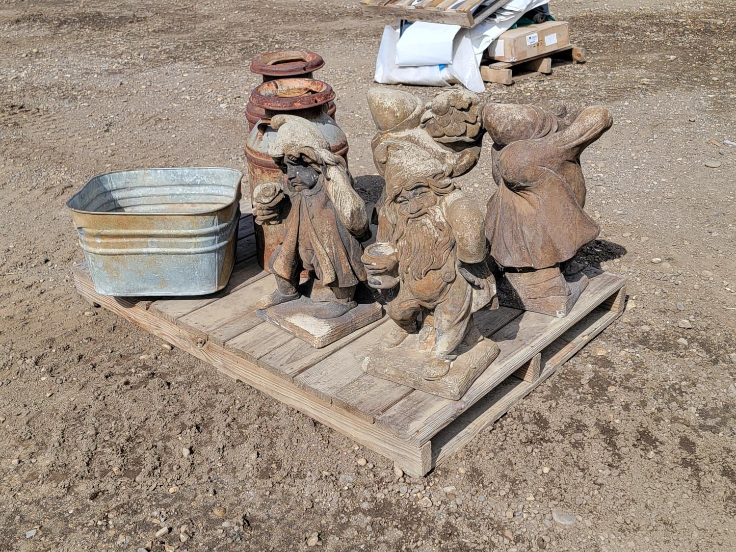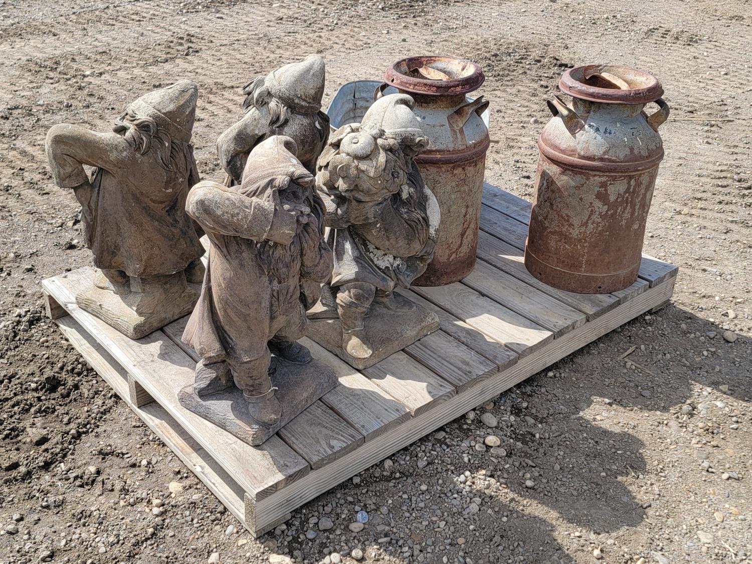 (4) large garden gnomes, (2) metal dairy cans and galvanized tub