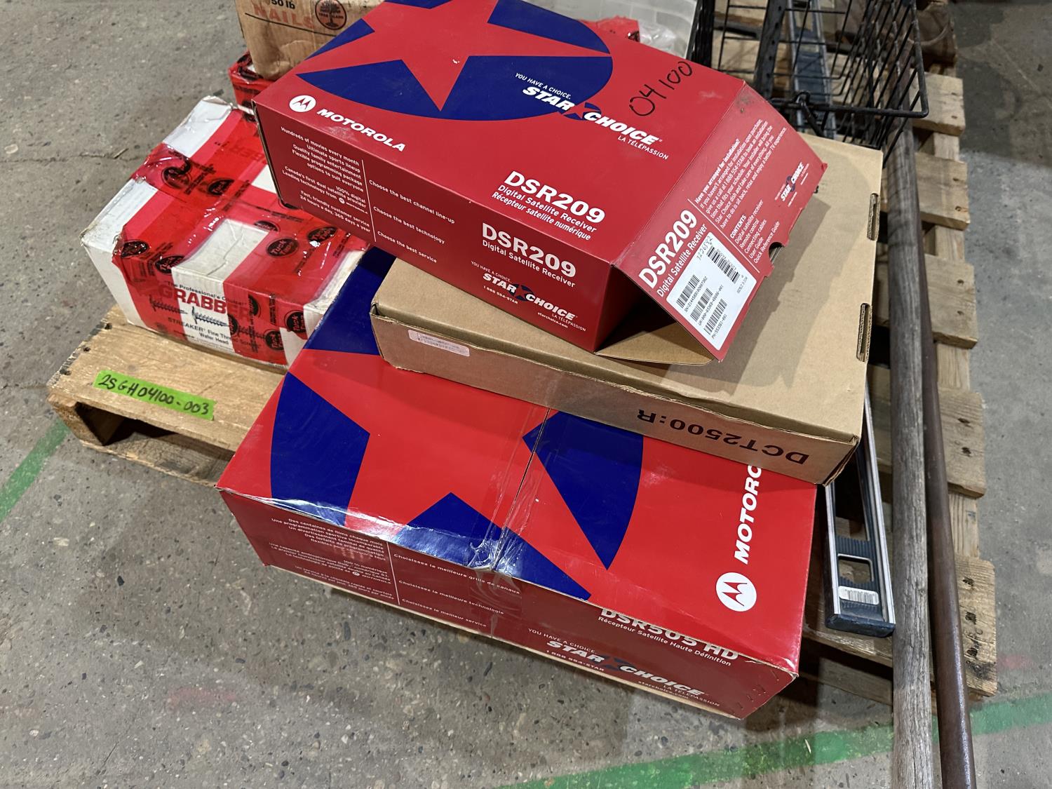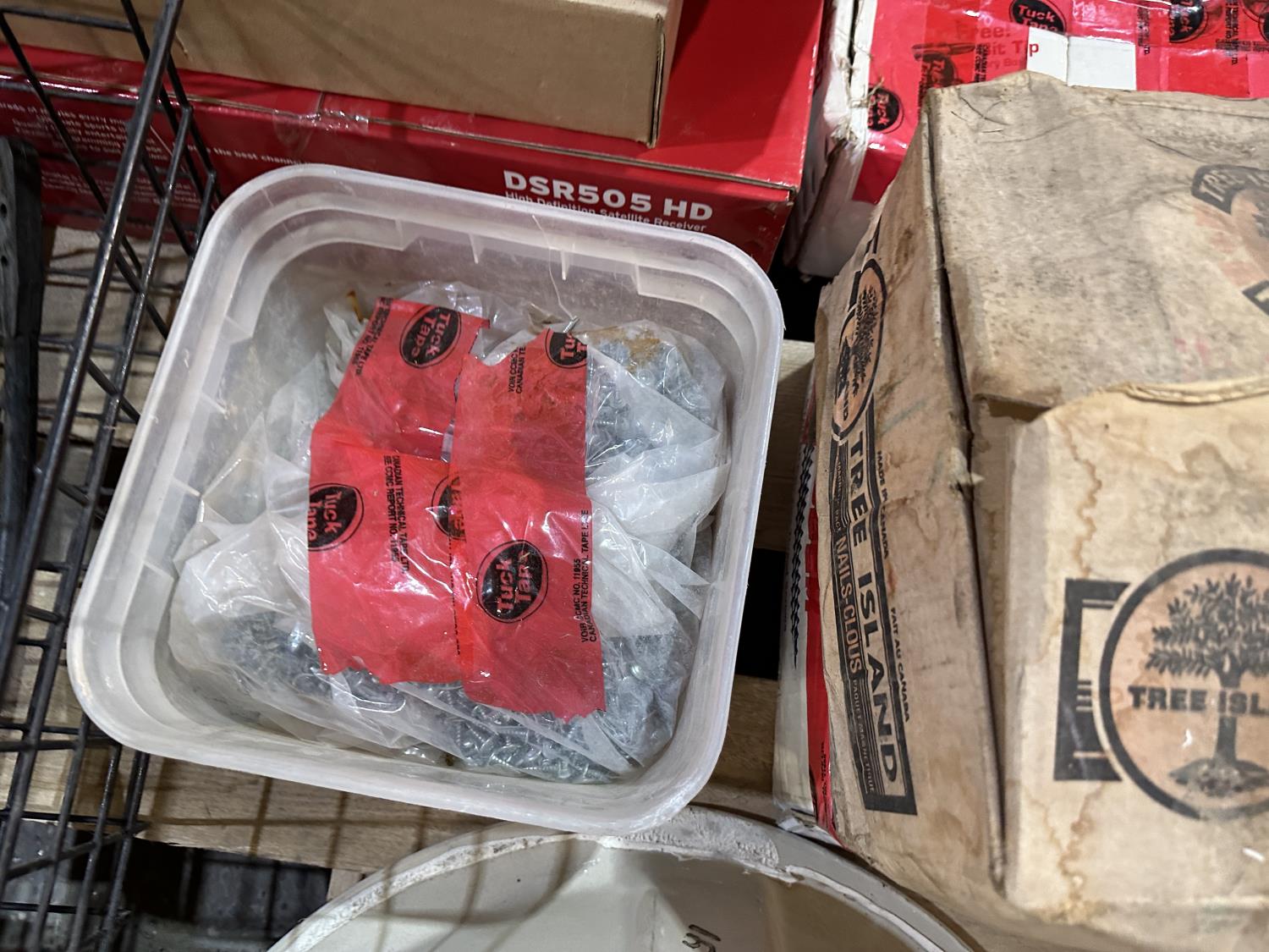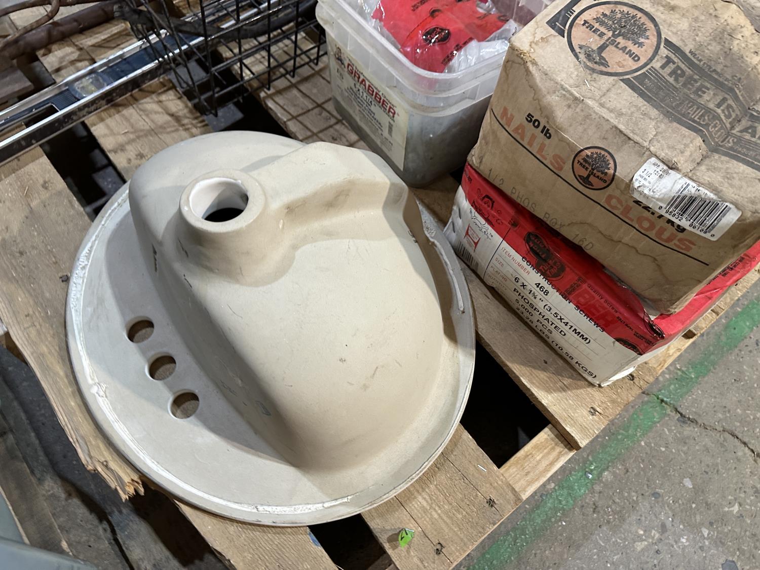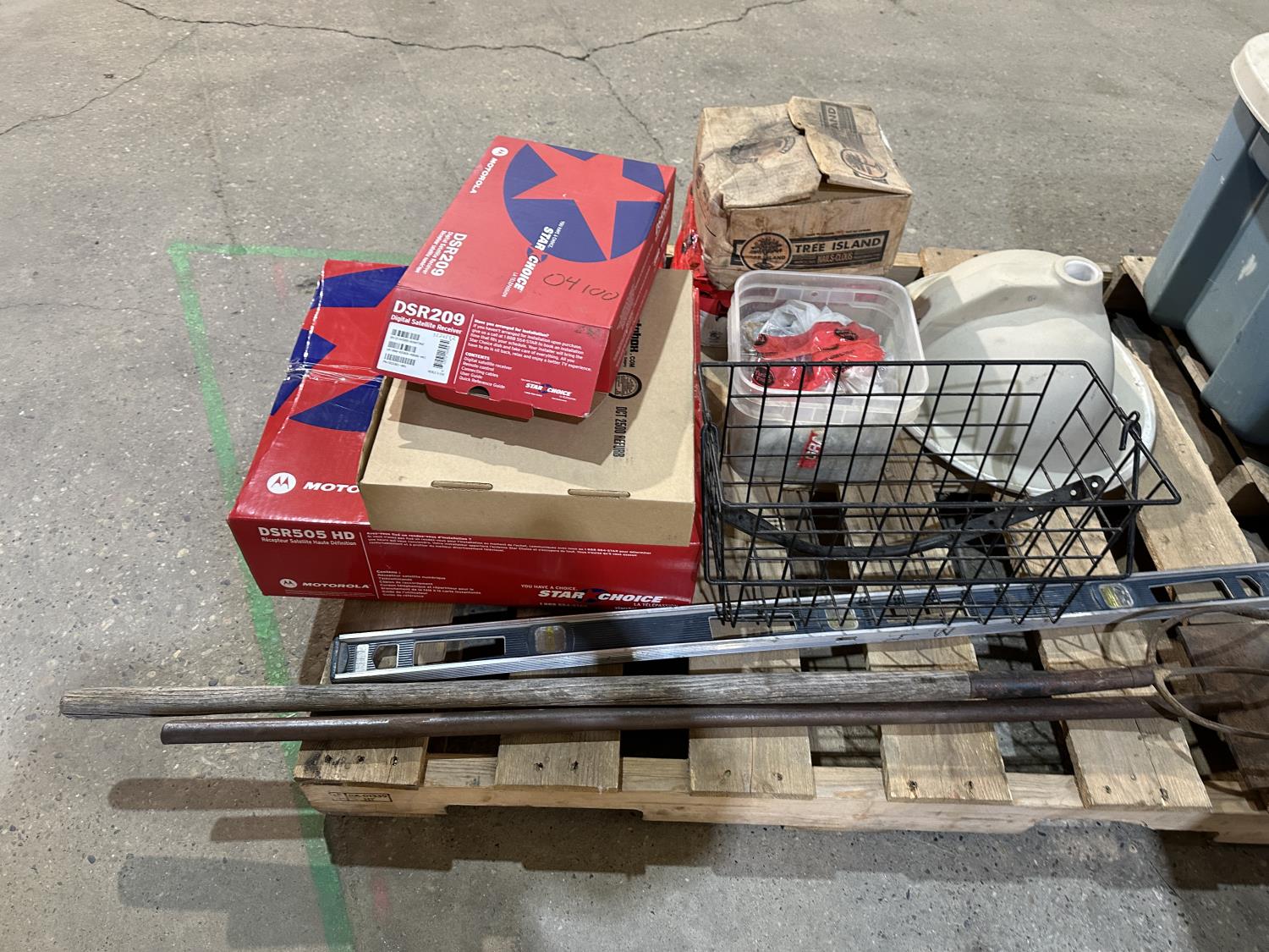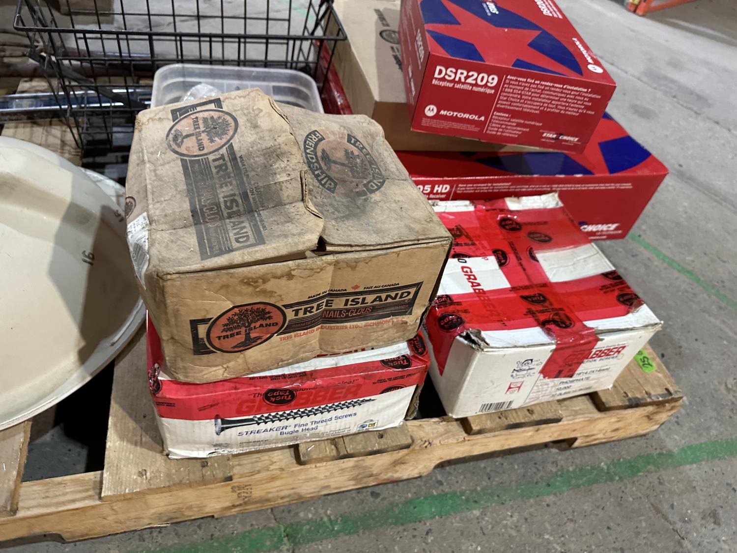 Motorola satellite boxes, porcelain sink, nails, hand tools