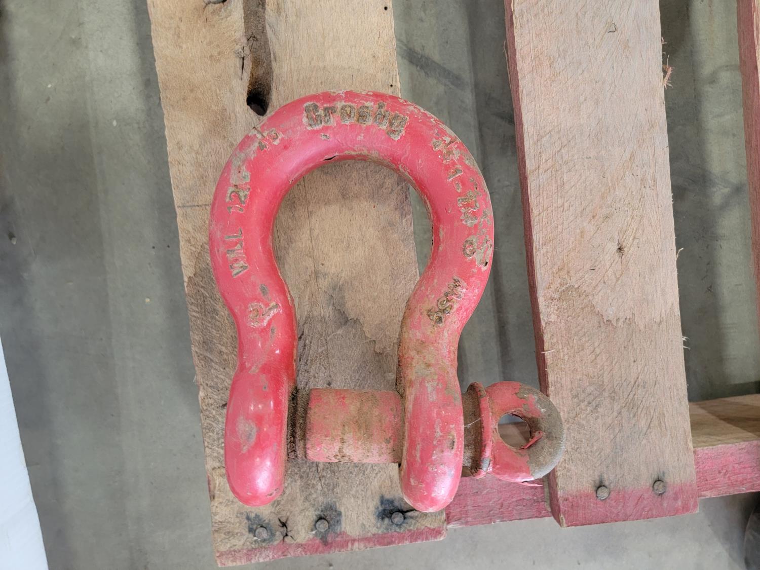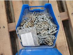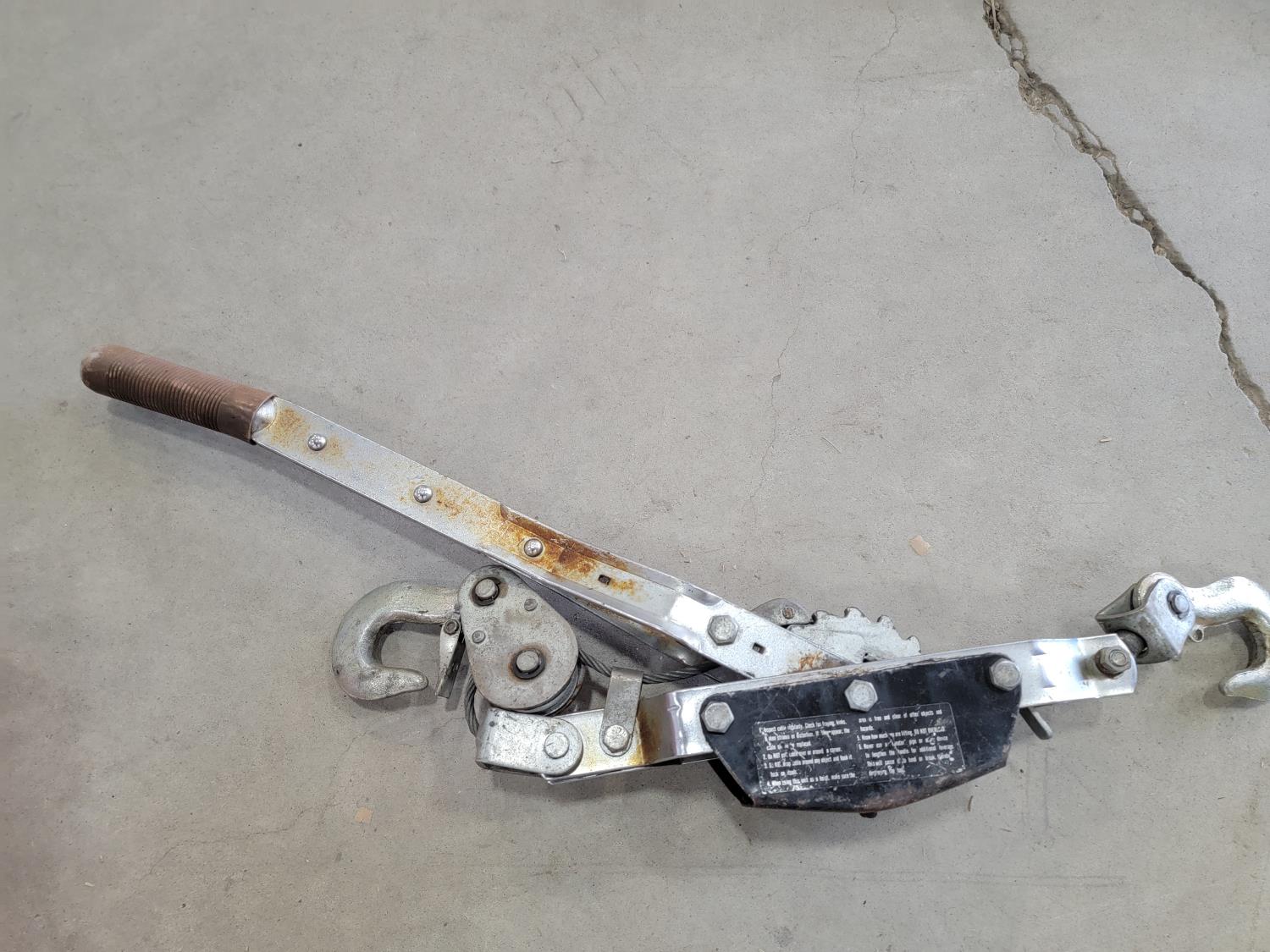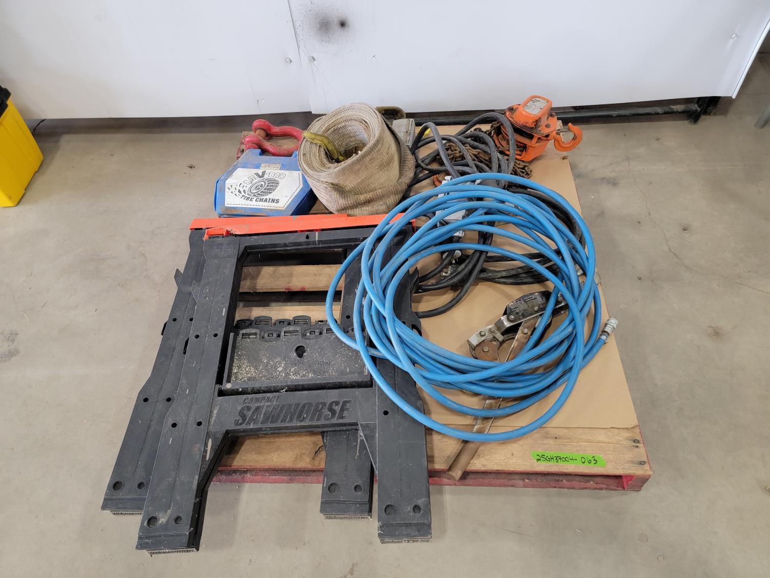 Electrical cords, (2) poly saw horses, shackle, tire chains, 1 ton chain hoist