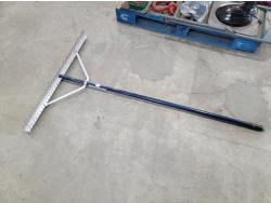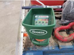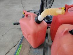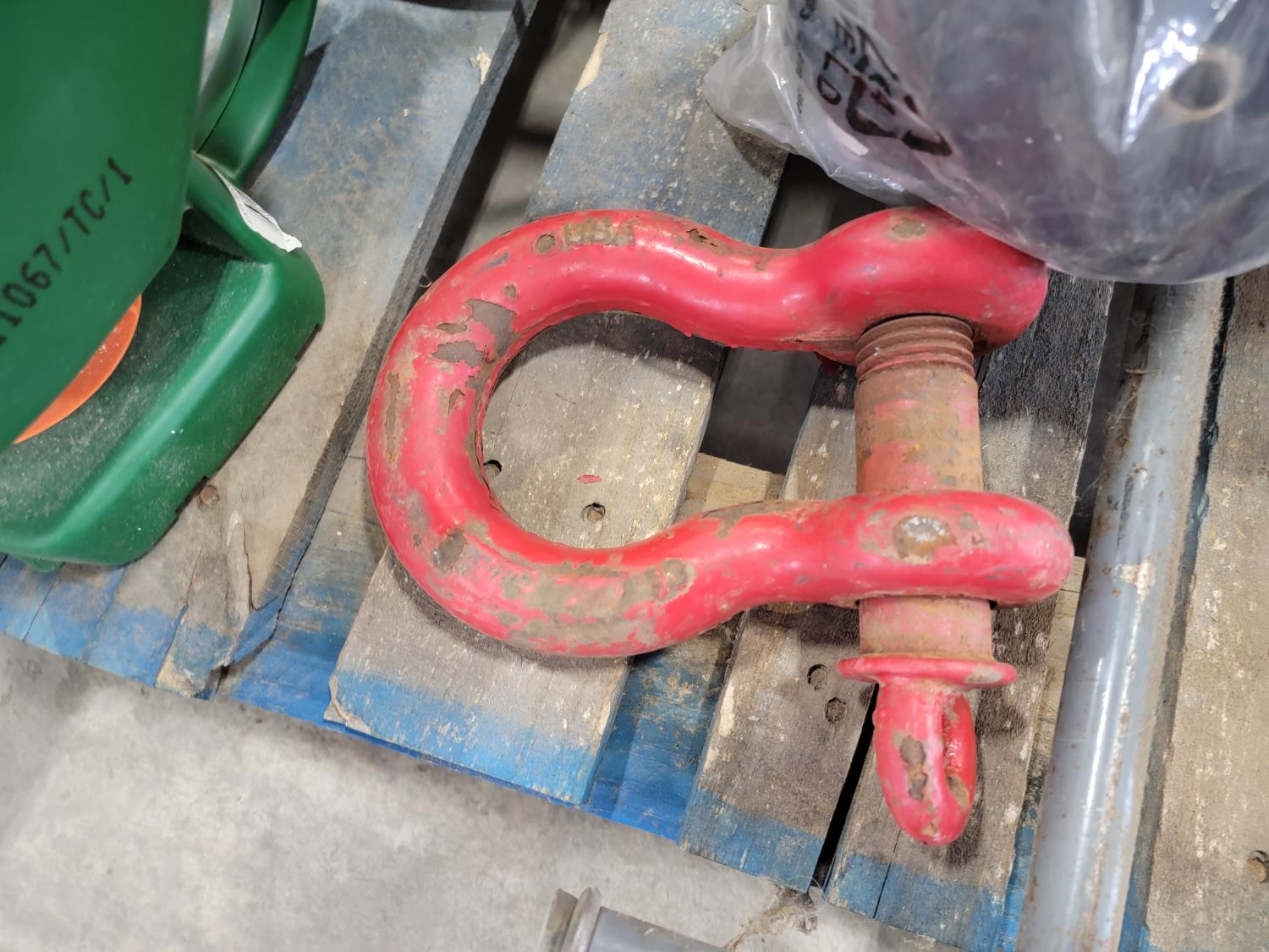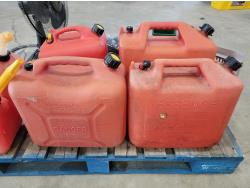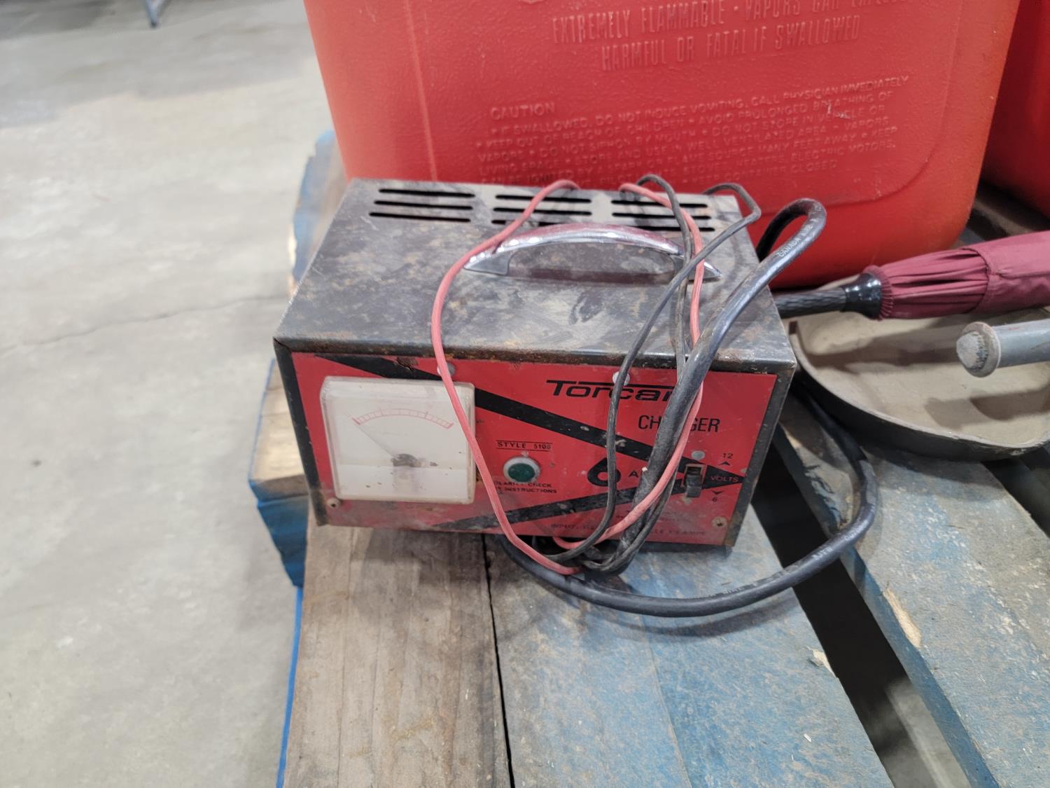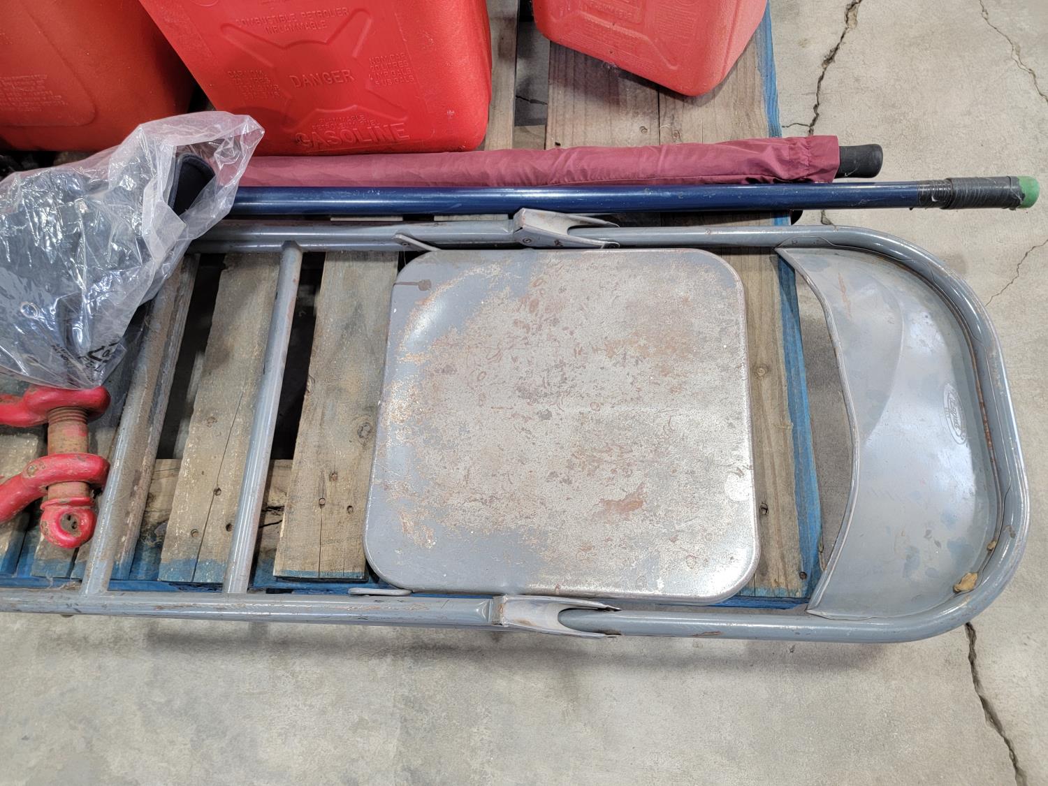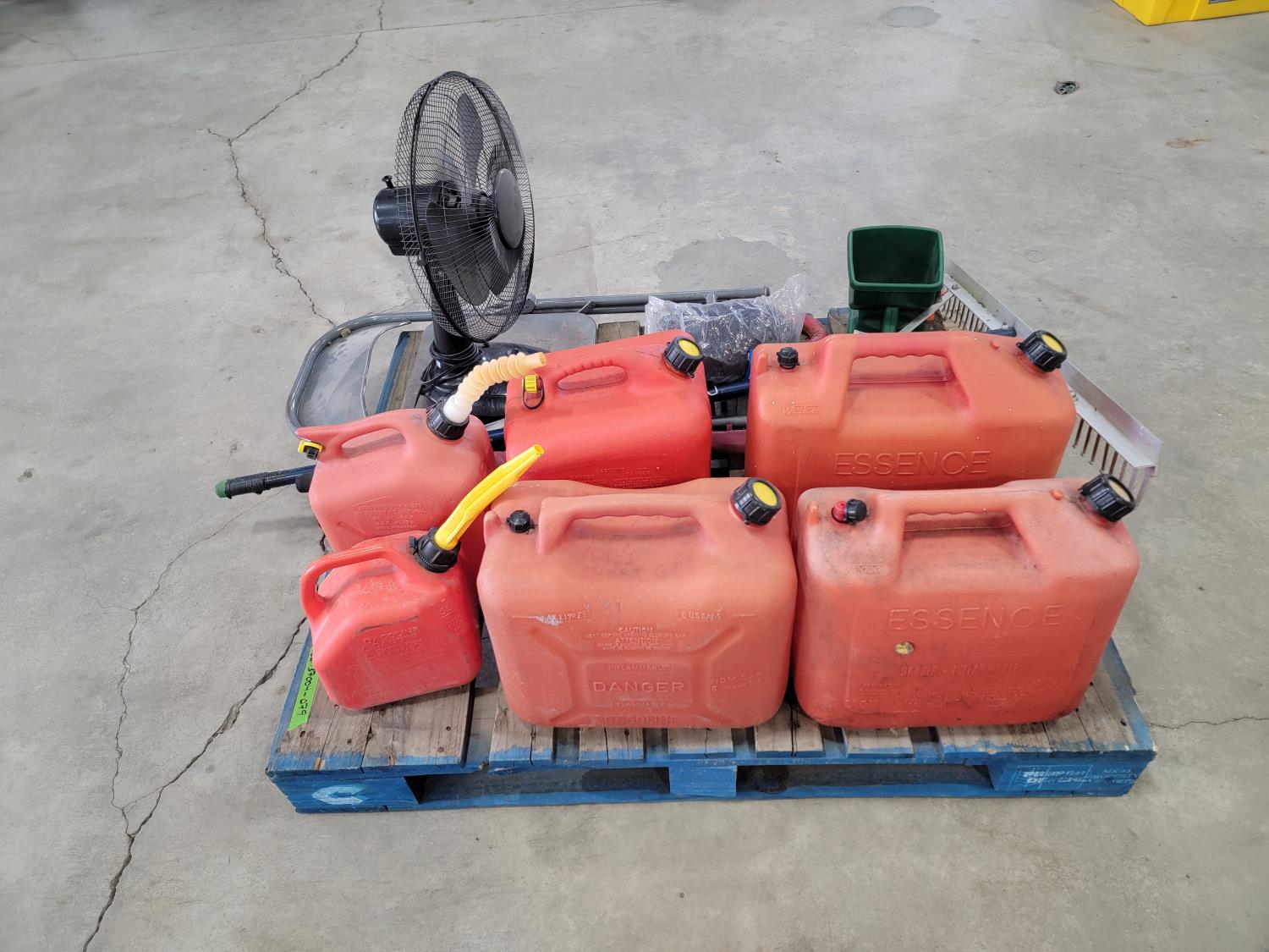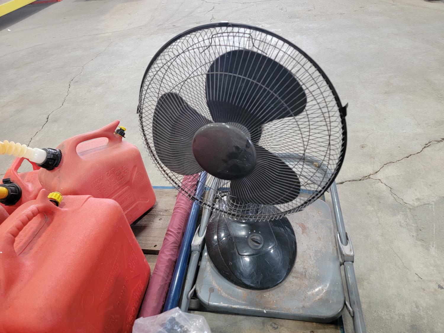 (6) jerry cans, fan, metal folding chair, shackle, (2) Powerfist soft bump caps, battery charger, industrial rake, broadcast spreader