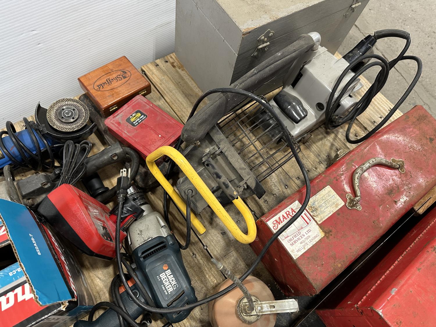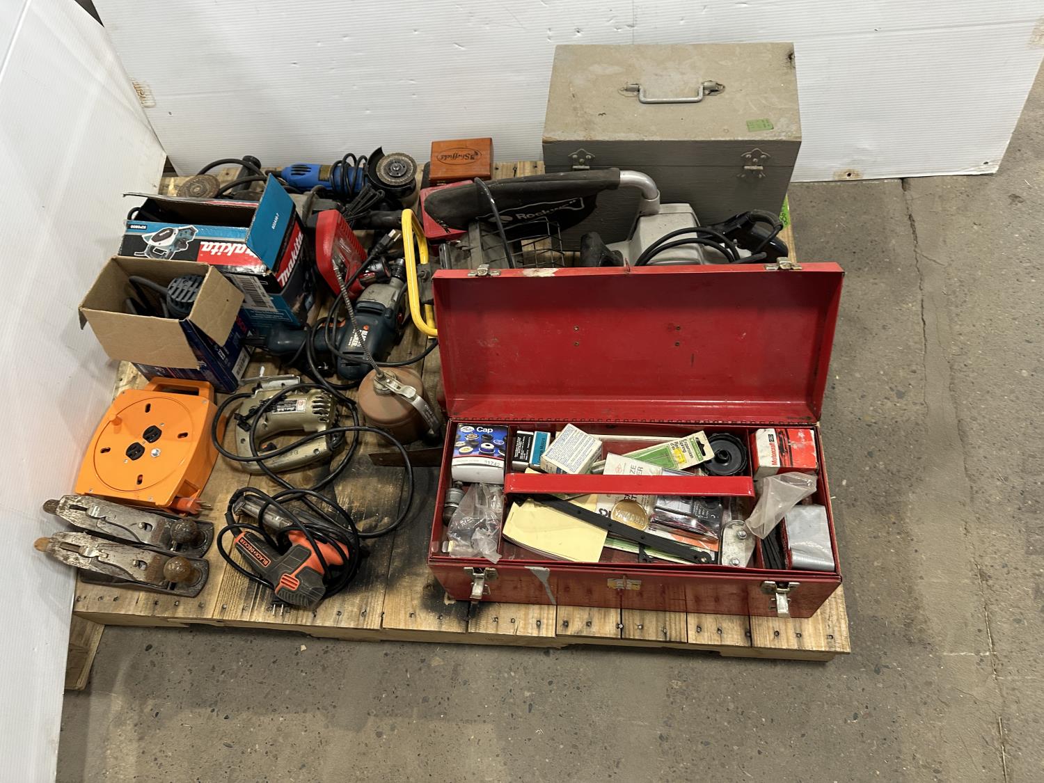 Rockwell planer, angle grinders, drills, palm sanders, tool boxes