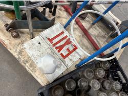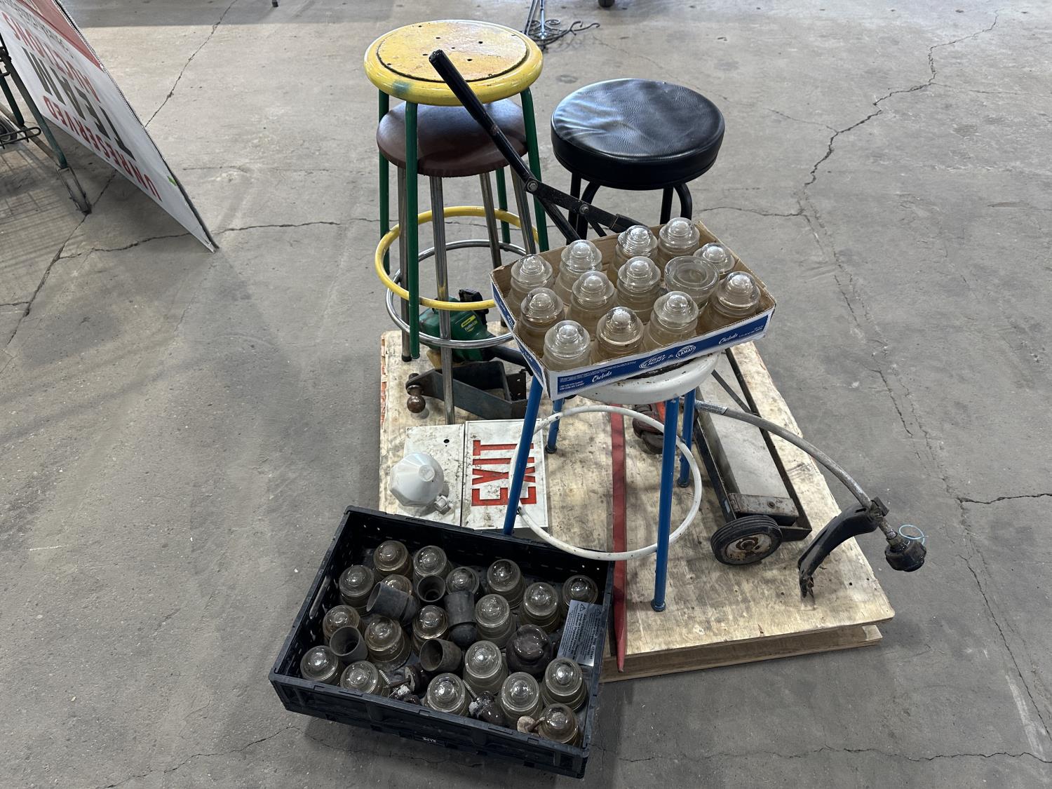 4 ft bale spear, glass insulators, shop stools, pipe wrench, exit sign, weed trimmer (untested)