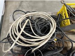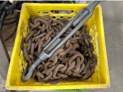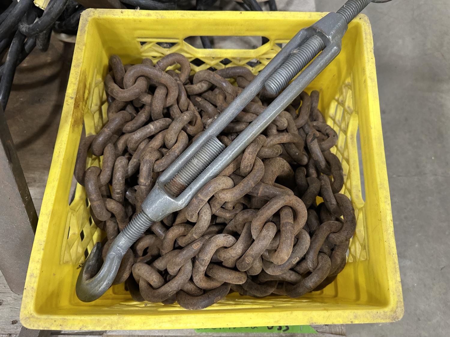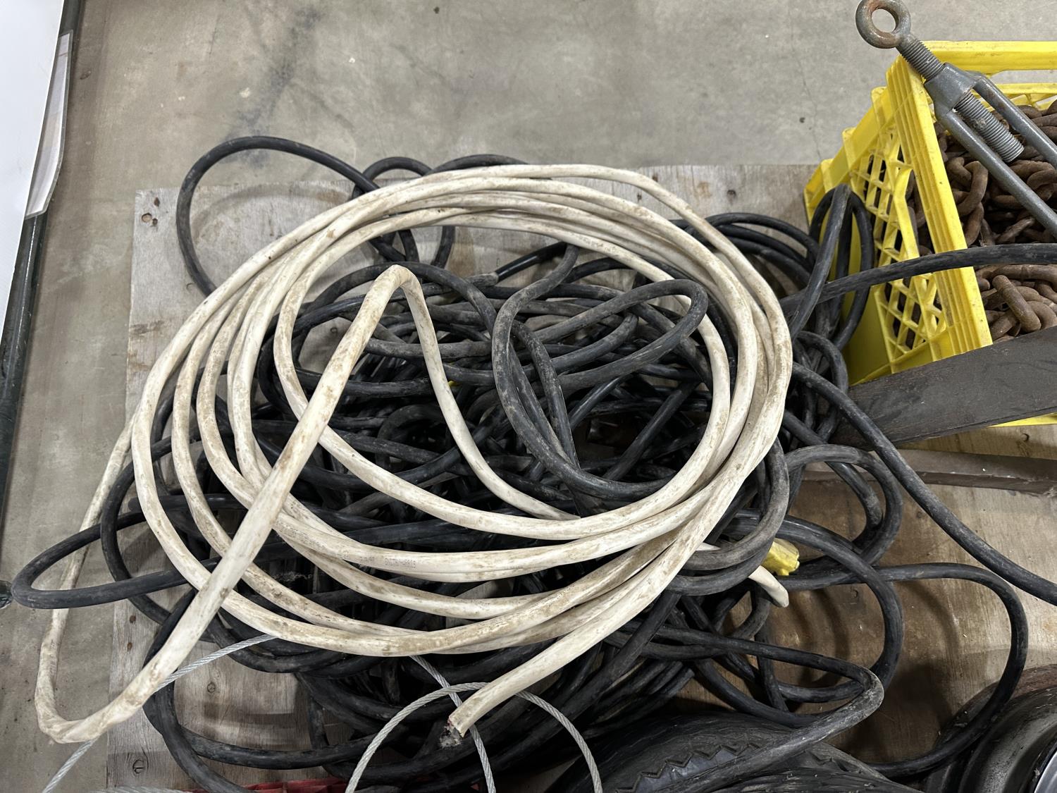 Come-alongs, (2) golf cart tires with rims, (2) 5 bolt rims, extension cords, chain