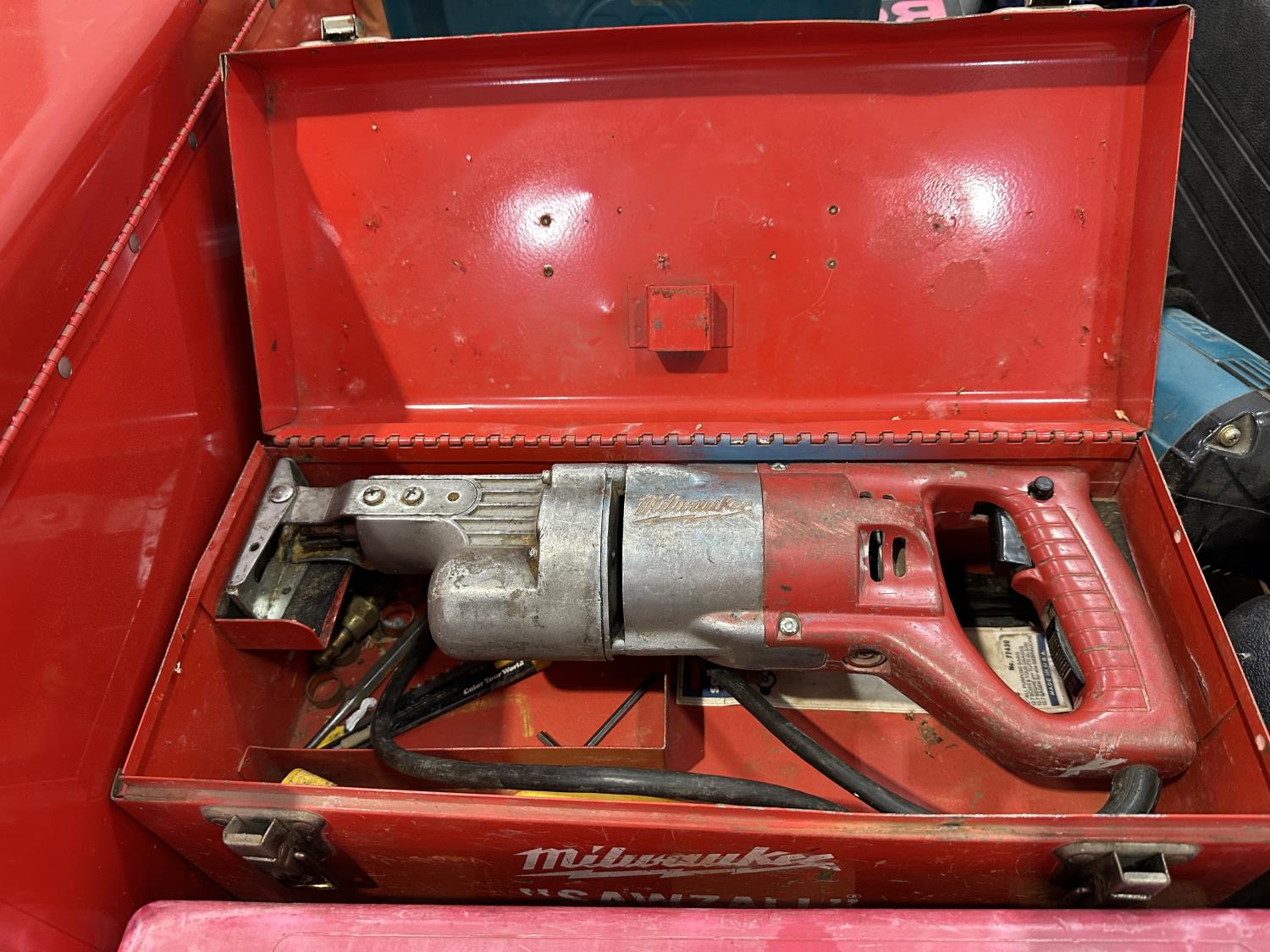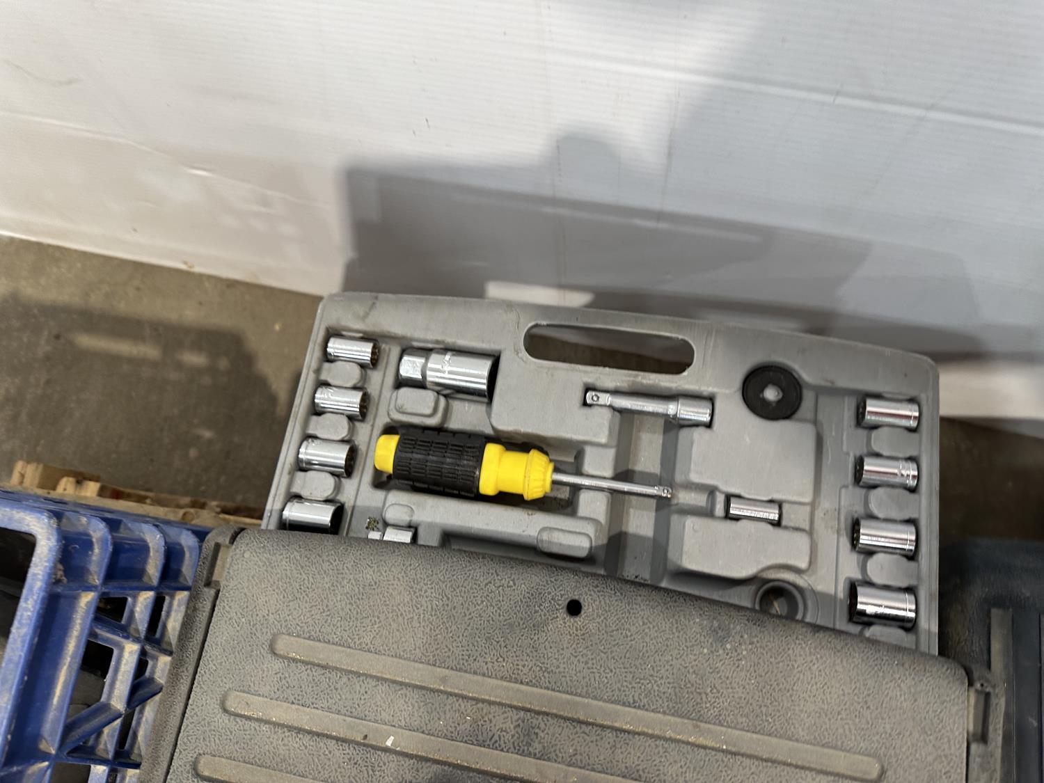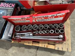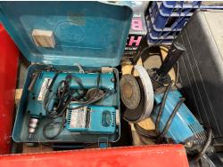 Car parts, Makita angle grinder, Makita drill, 3/4 inch drive 22 piece socket set, road flares, bottle jacks, hitches, Milwaukee sawzall, socket sets