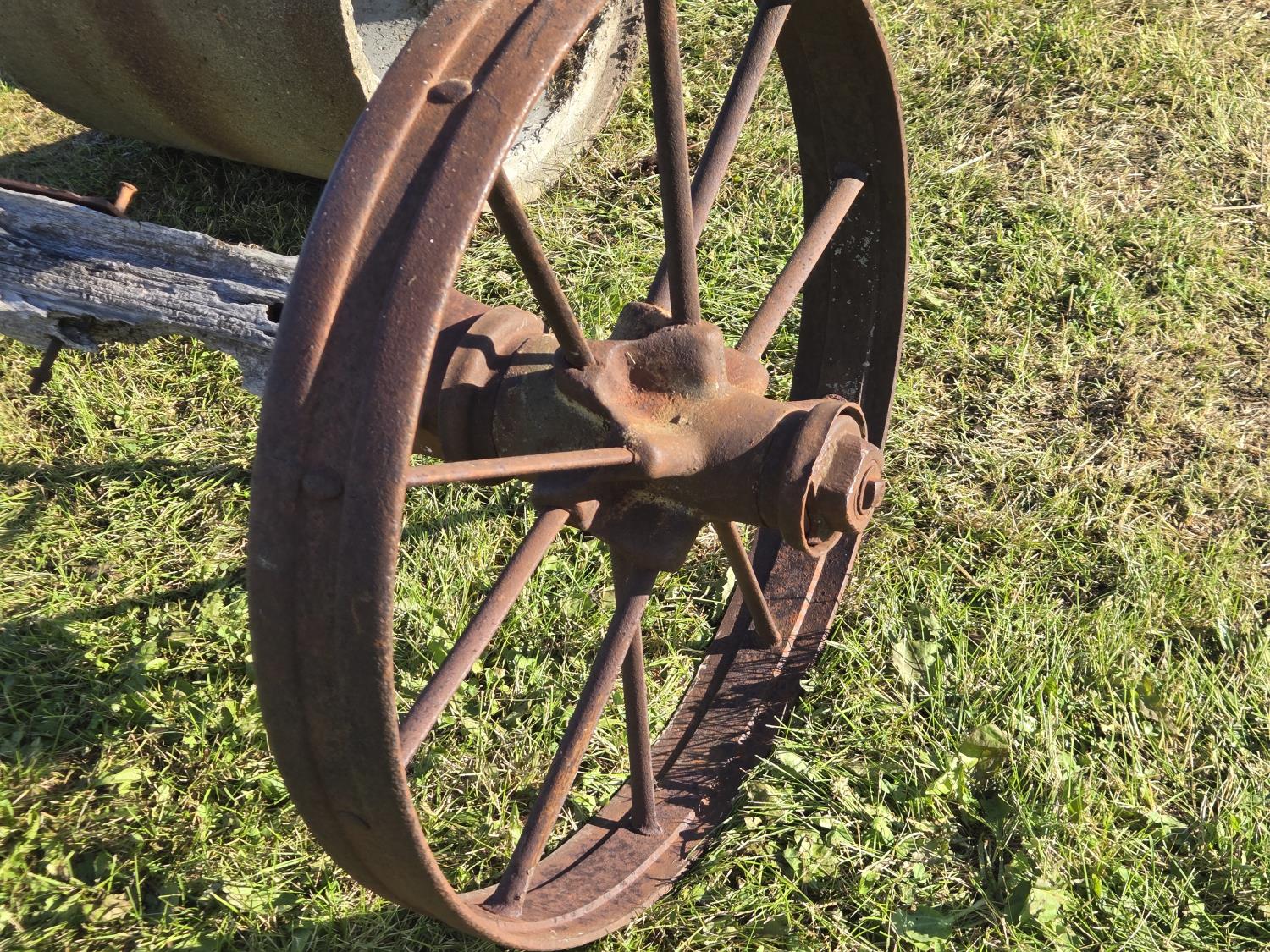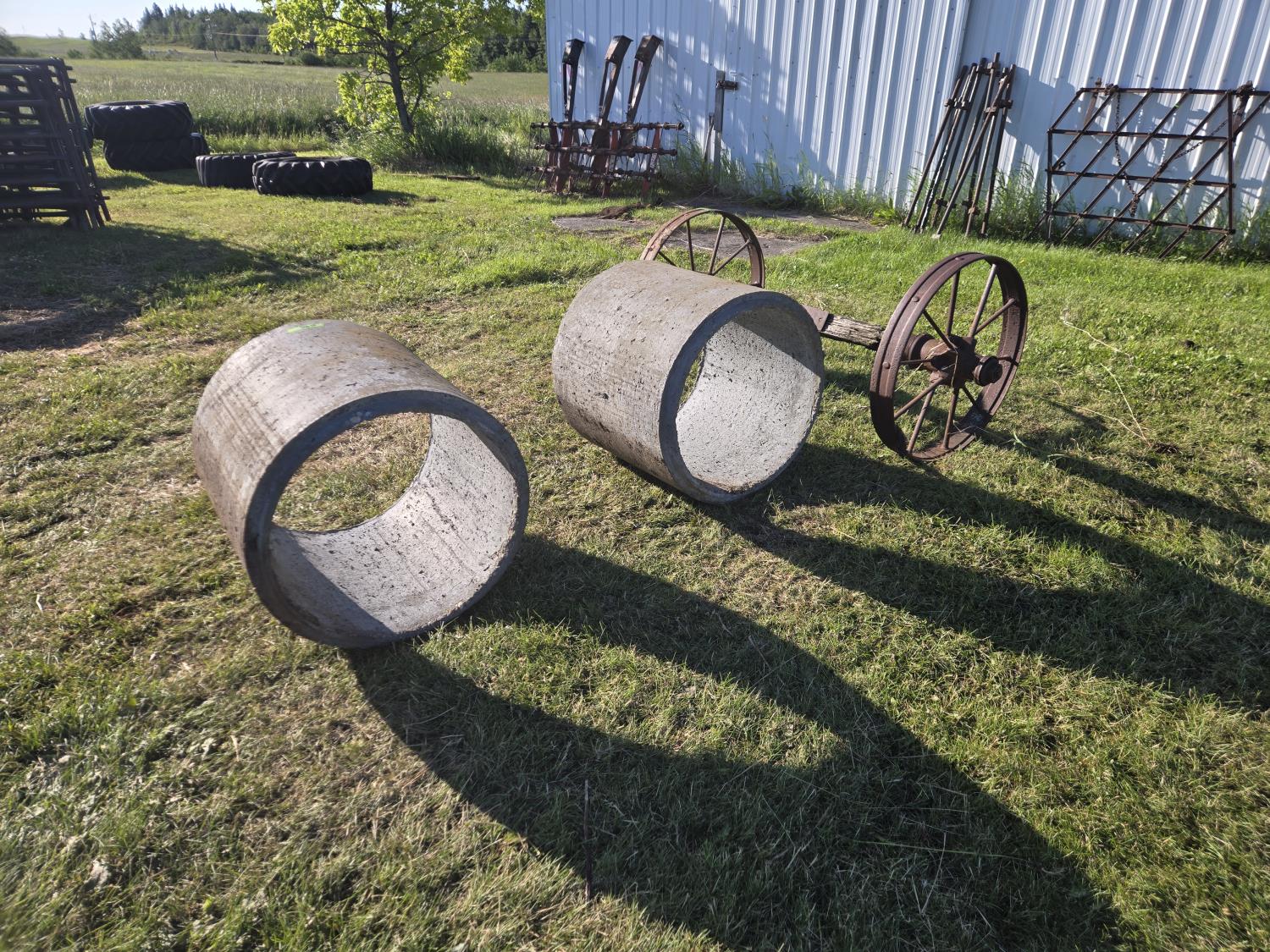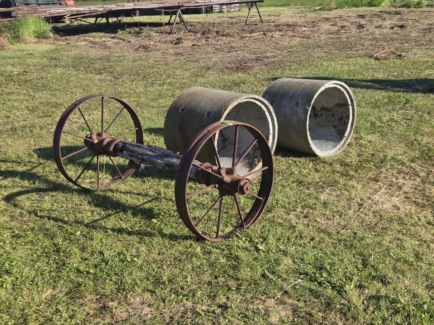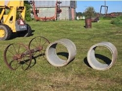 304 (2) Concrete Septic Risers, (2) 30 Inch Steel Wheels On Wooden Axle