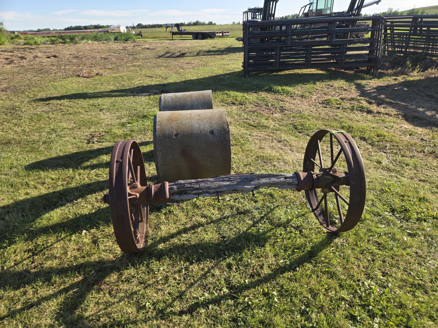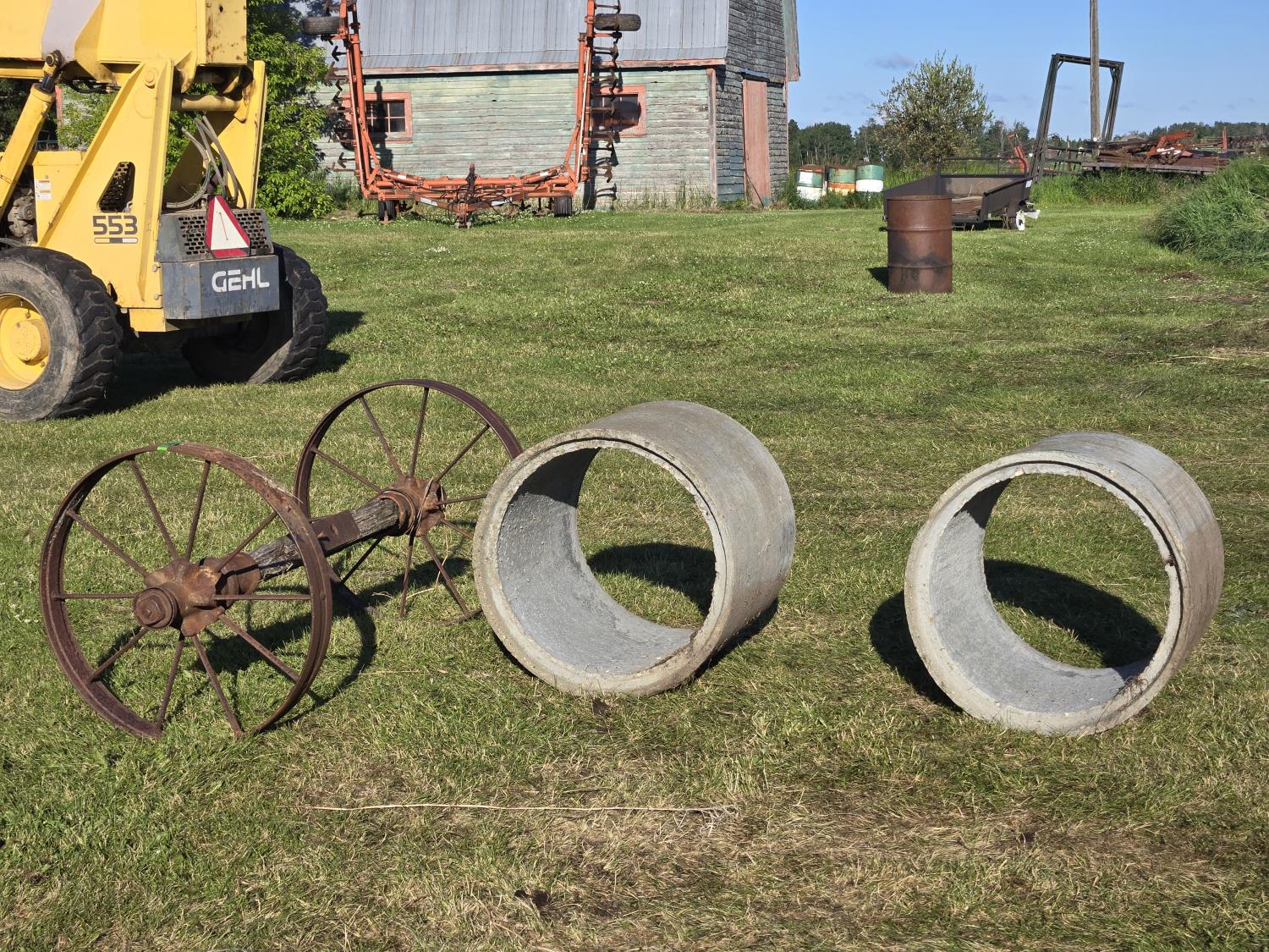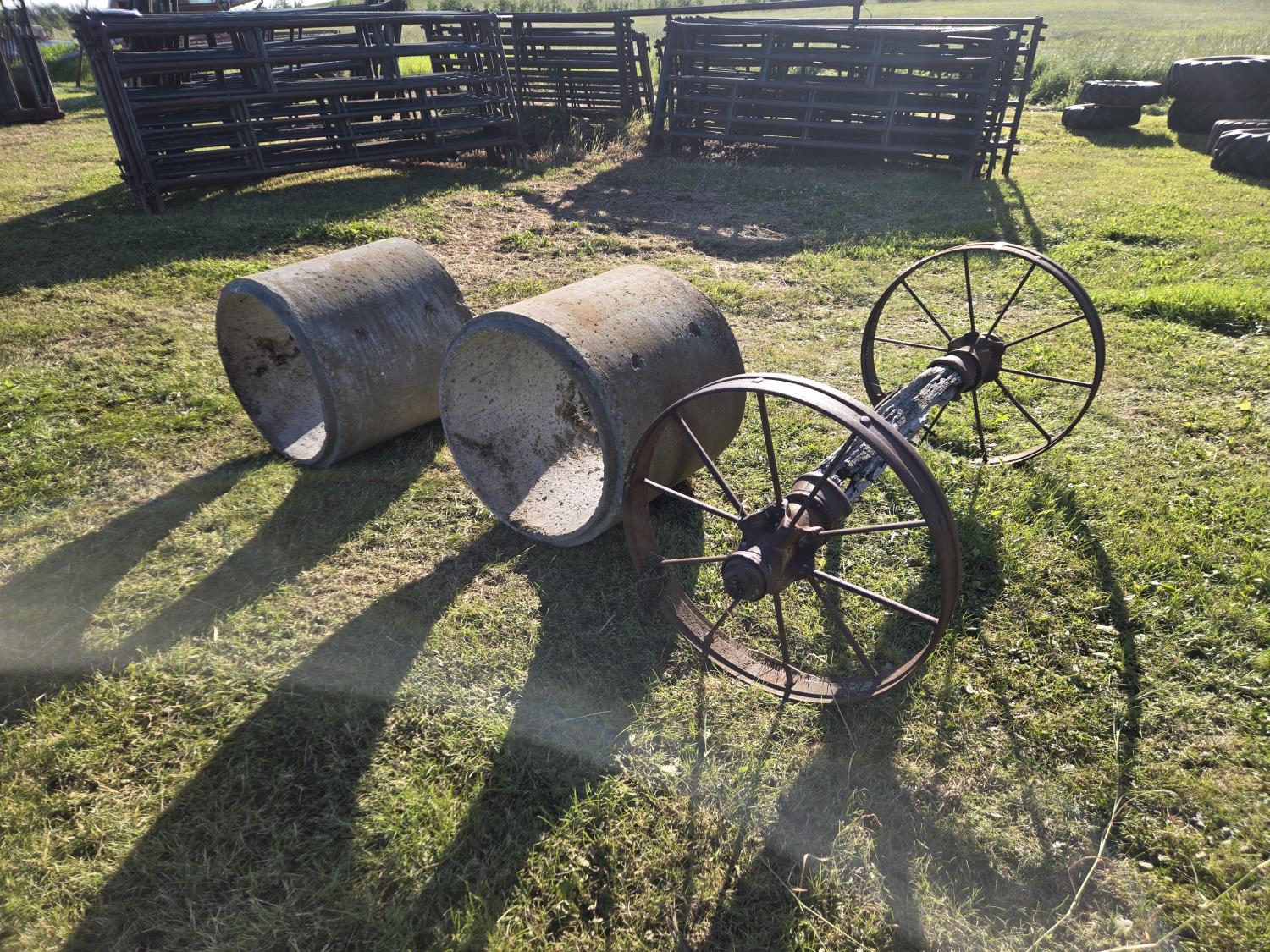 304 (2) Concrete Septic Risers, (2) 30 Inch Steel Wheels On Wooden Axle