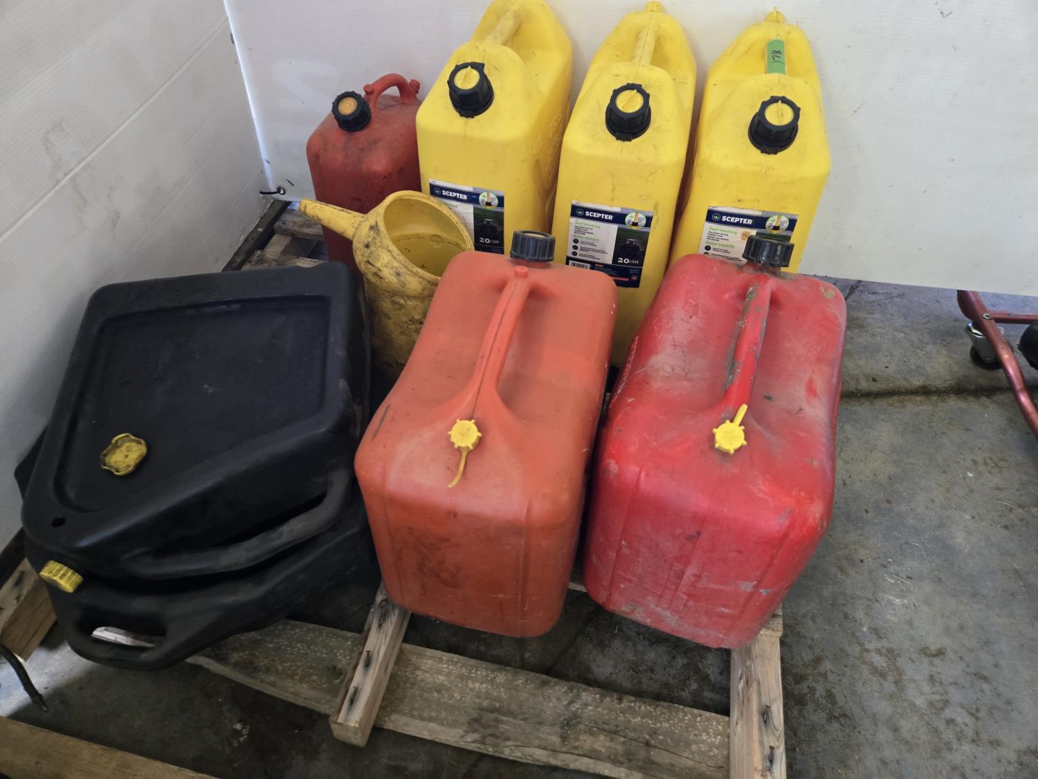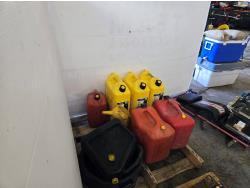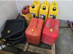 24 (2) Oil Drain Pans, (5) Jerry Cans & Poly Pour Jug