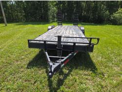 82 inch wide deck, wood deck, stand up ramps, electric brakes, spring suspension, ball hitch, stake pockets, 7000 lb axles, 235/80R16 tires