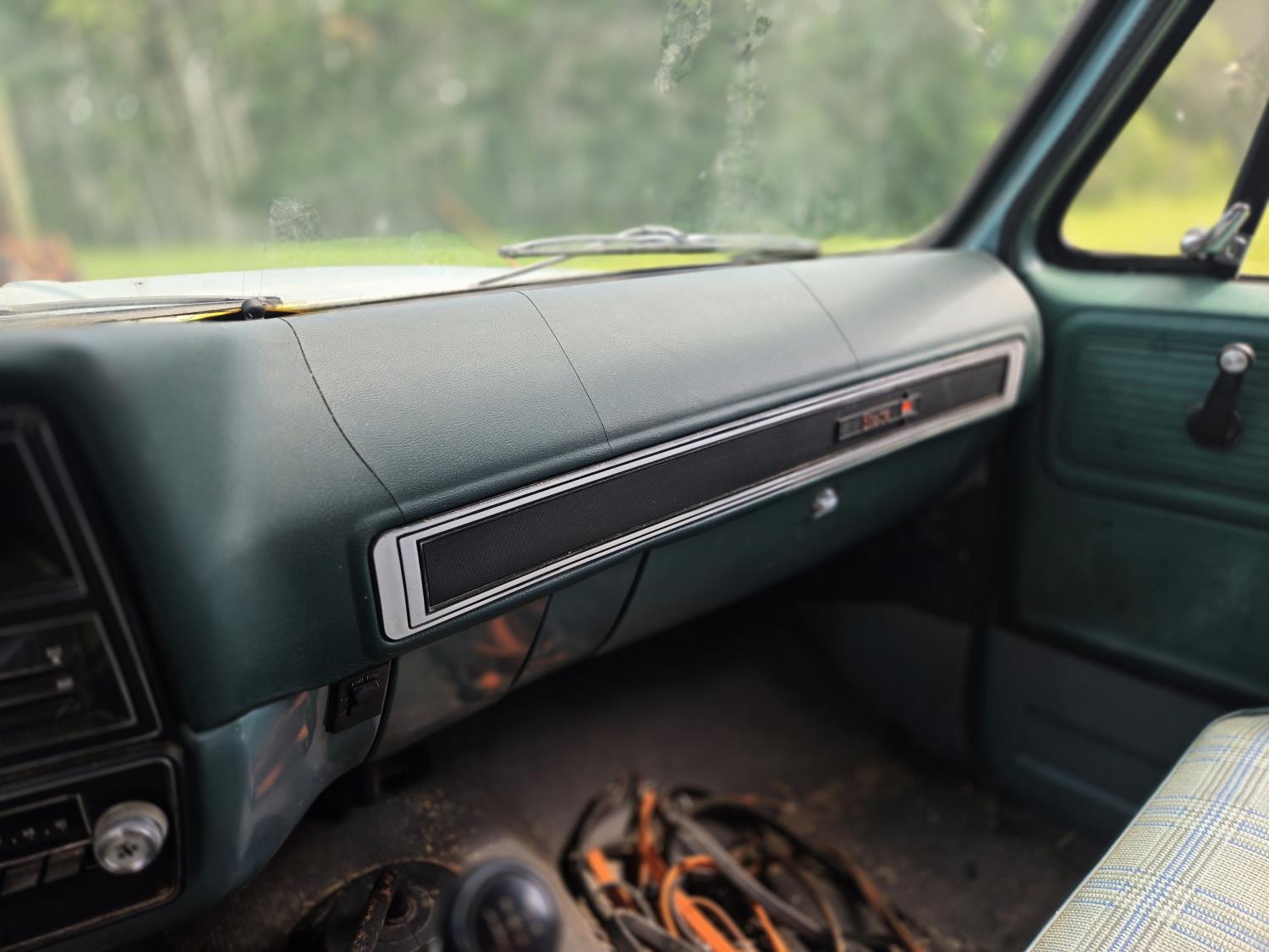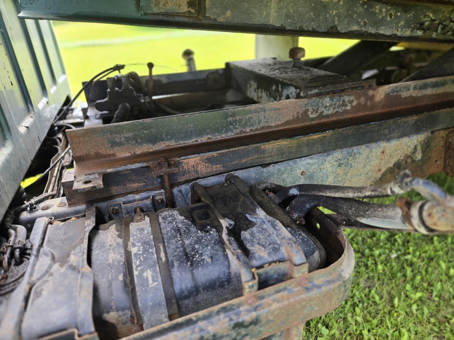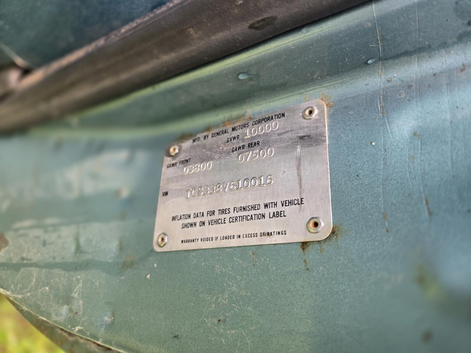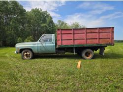 GMC 454 cu in V8 gas engine, 4 speed manual transmission, 12 ft steel box with hoist, 7.50R16 tires