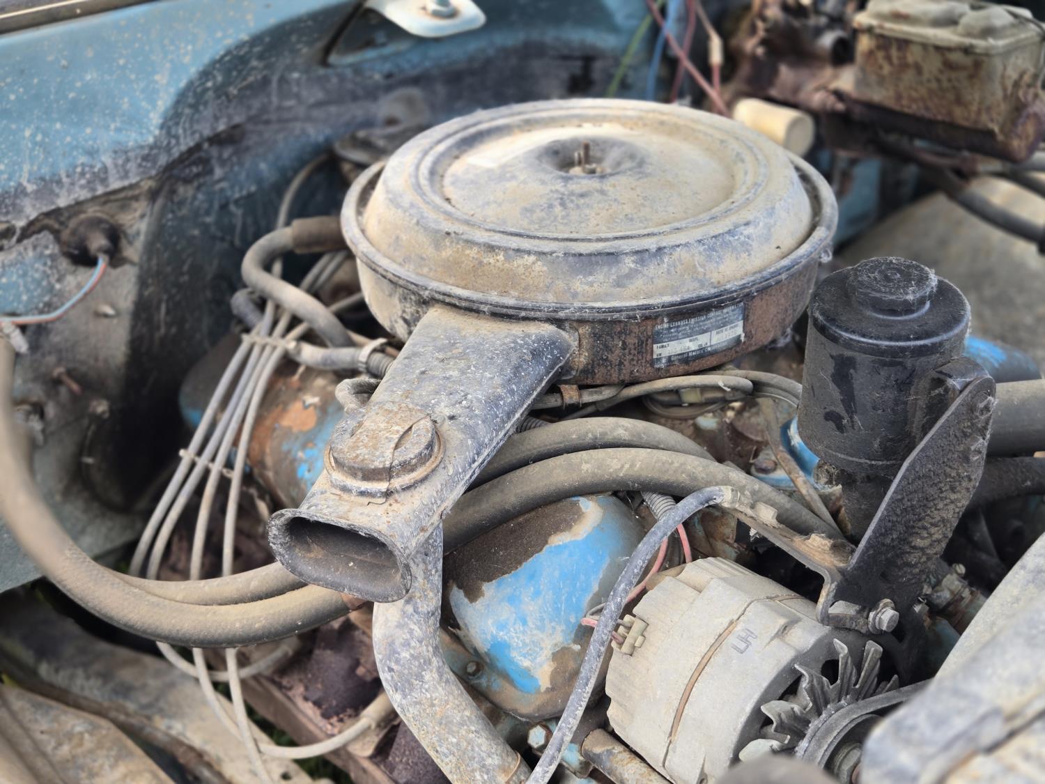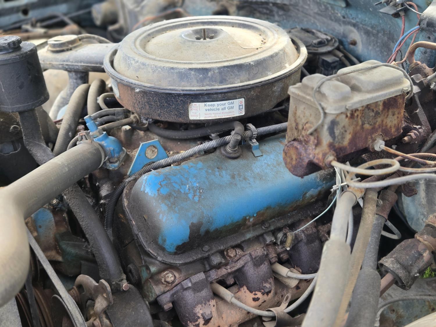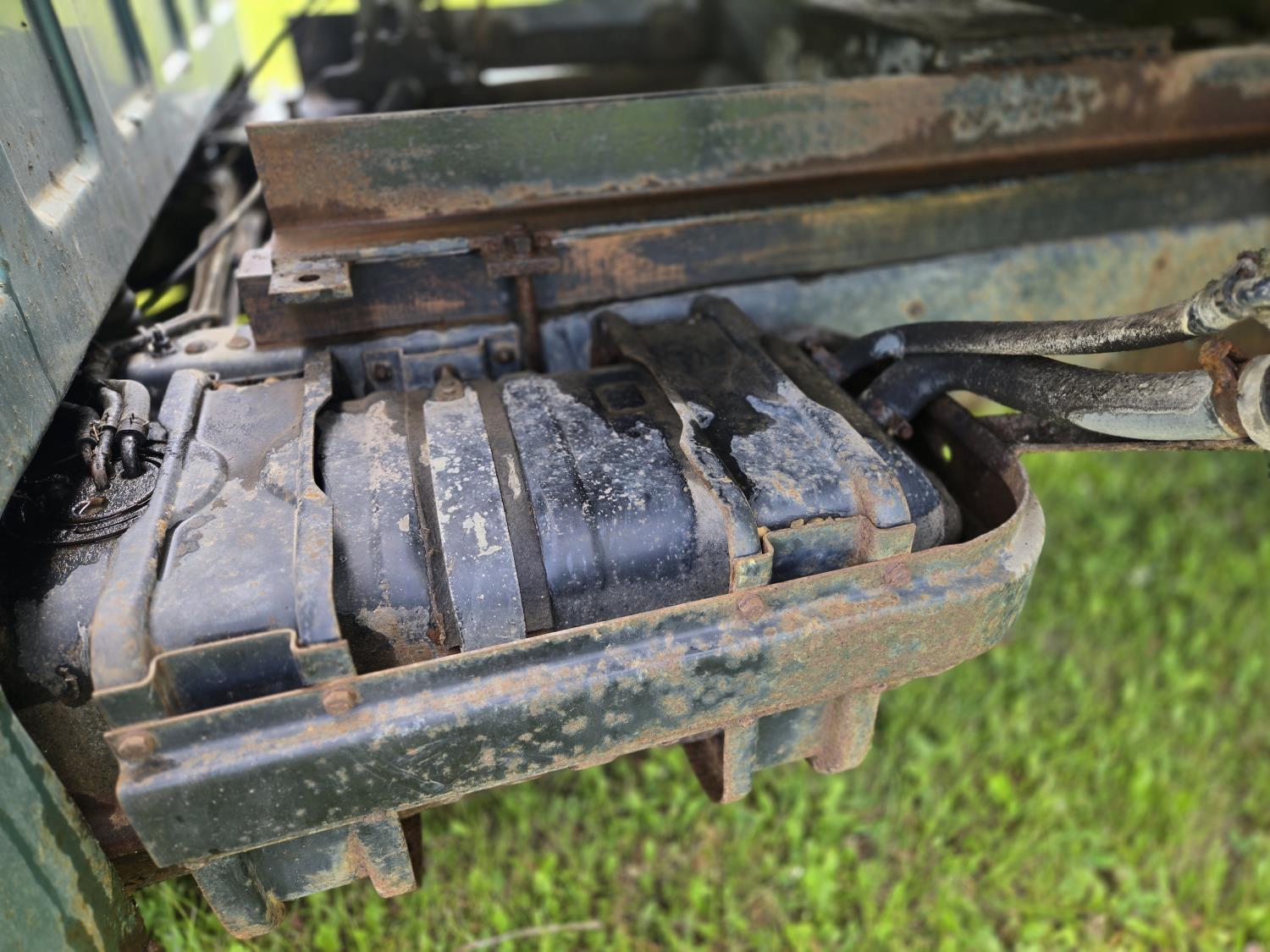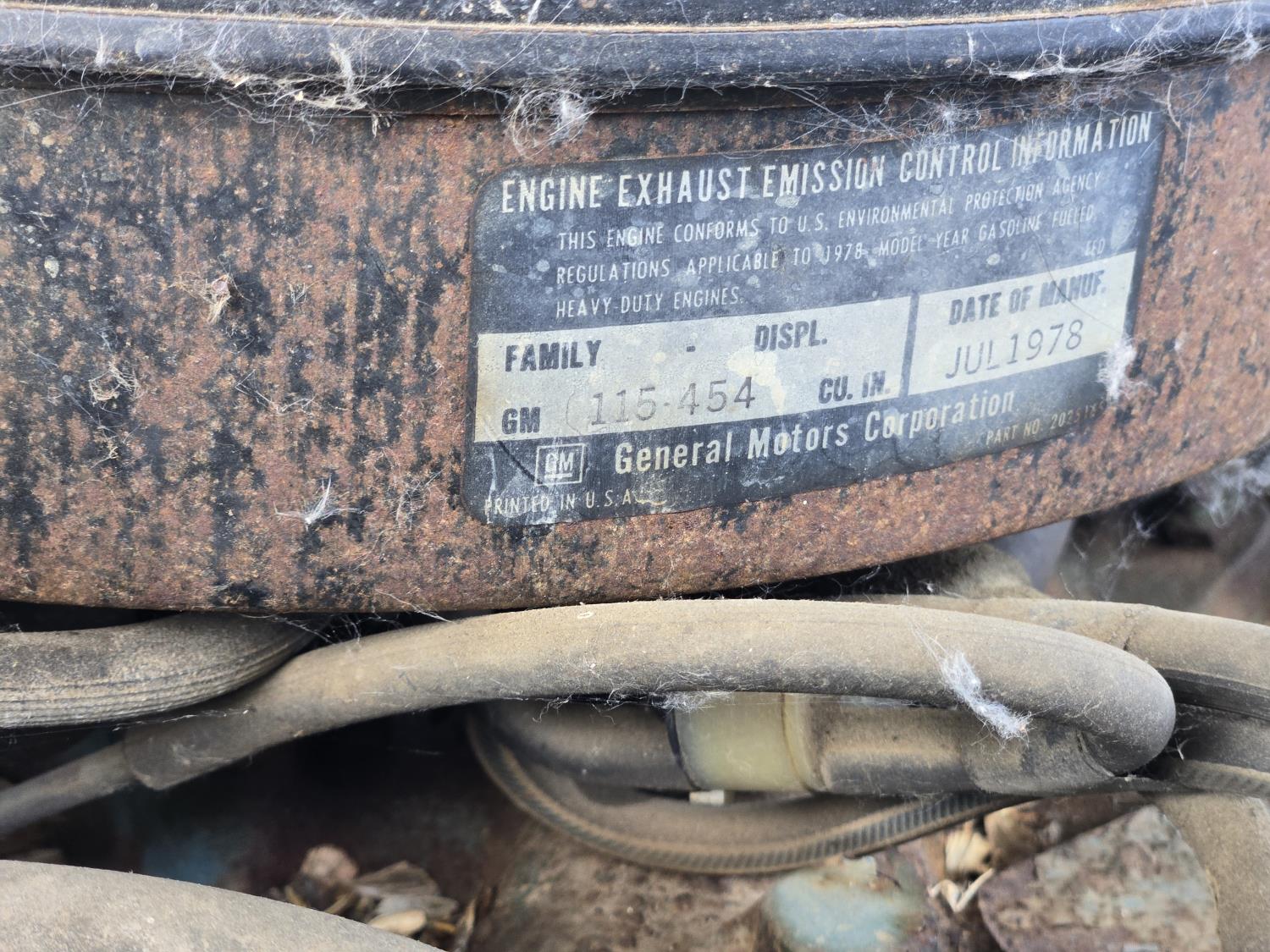 GMC 454 cu in V8 gas engine, 4 speed manual transmission, 12 ft steel box with hoist, 7.50R16 tires