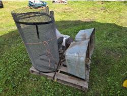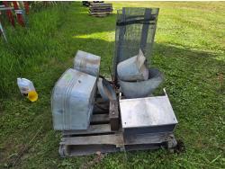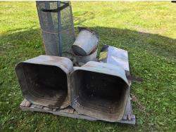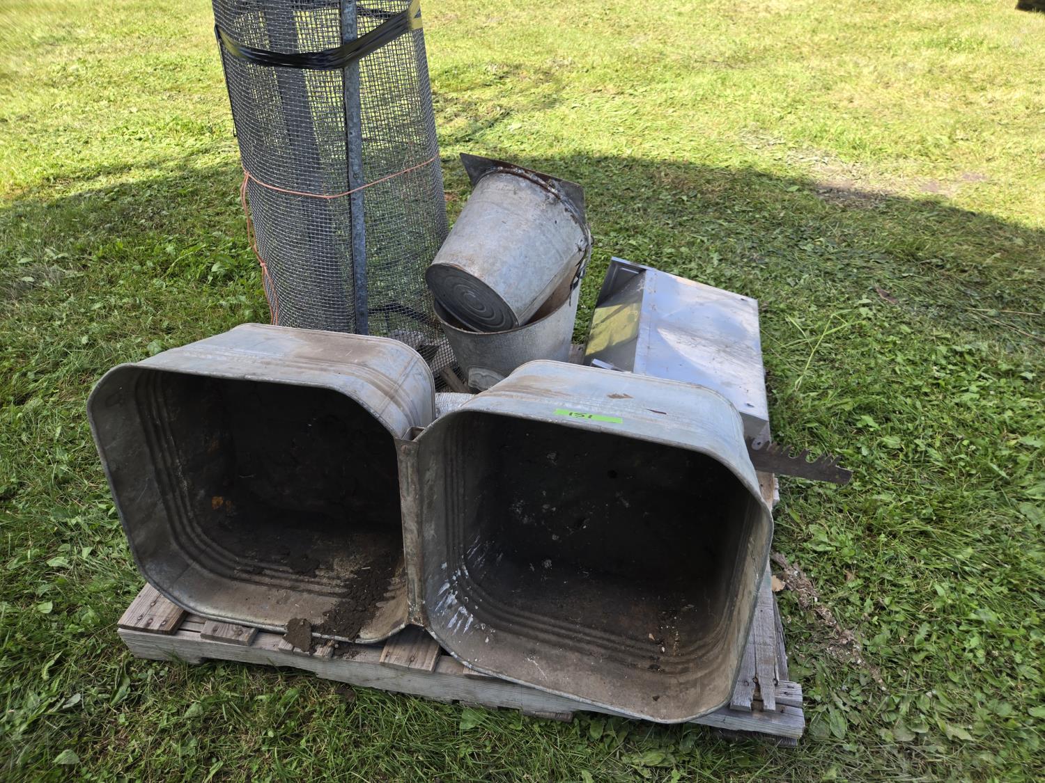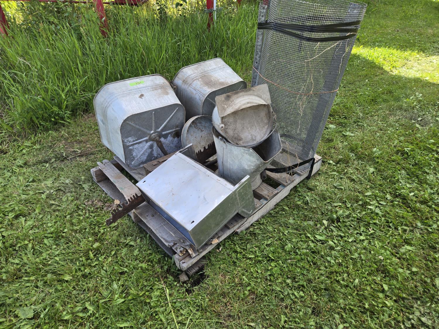 (2) galvanized square tubs, coal pail, chicken watering pail, small hog feeder, saw blade, mesh wire