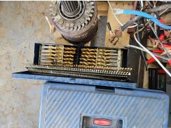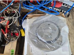 extension cord, wire, smaller charger, small tool box with contents, drill bit set, (2) new rear brake rotors, miscellaneous parts