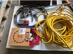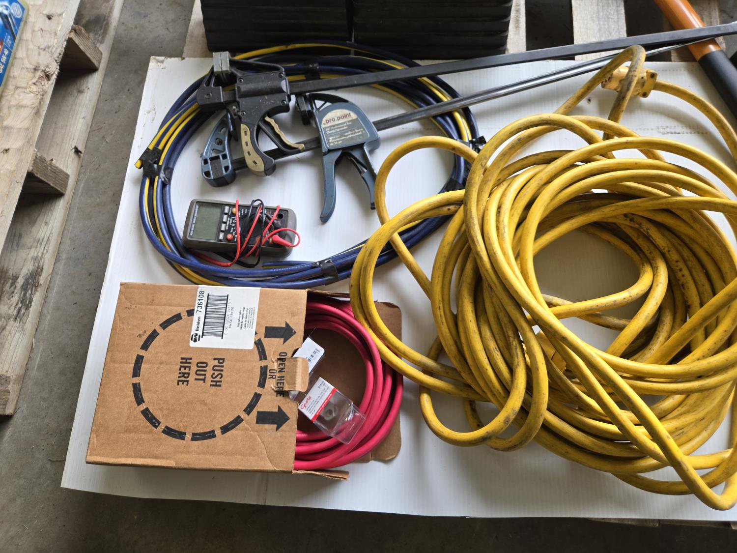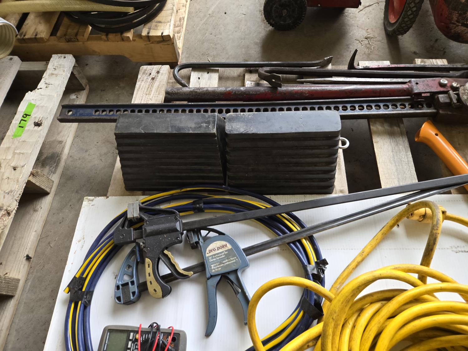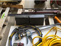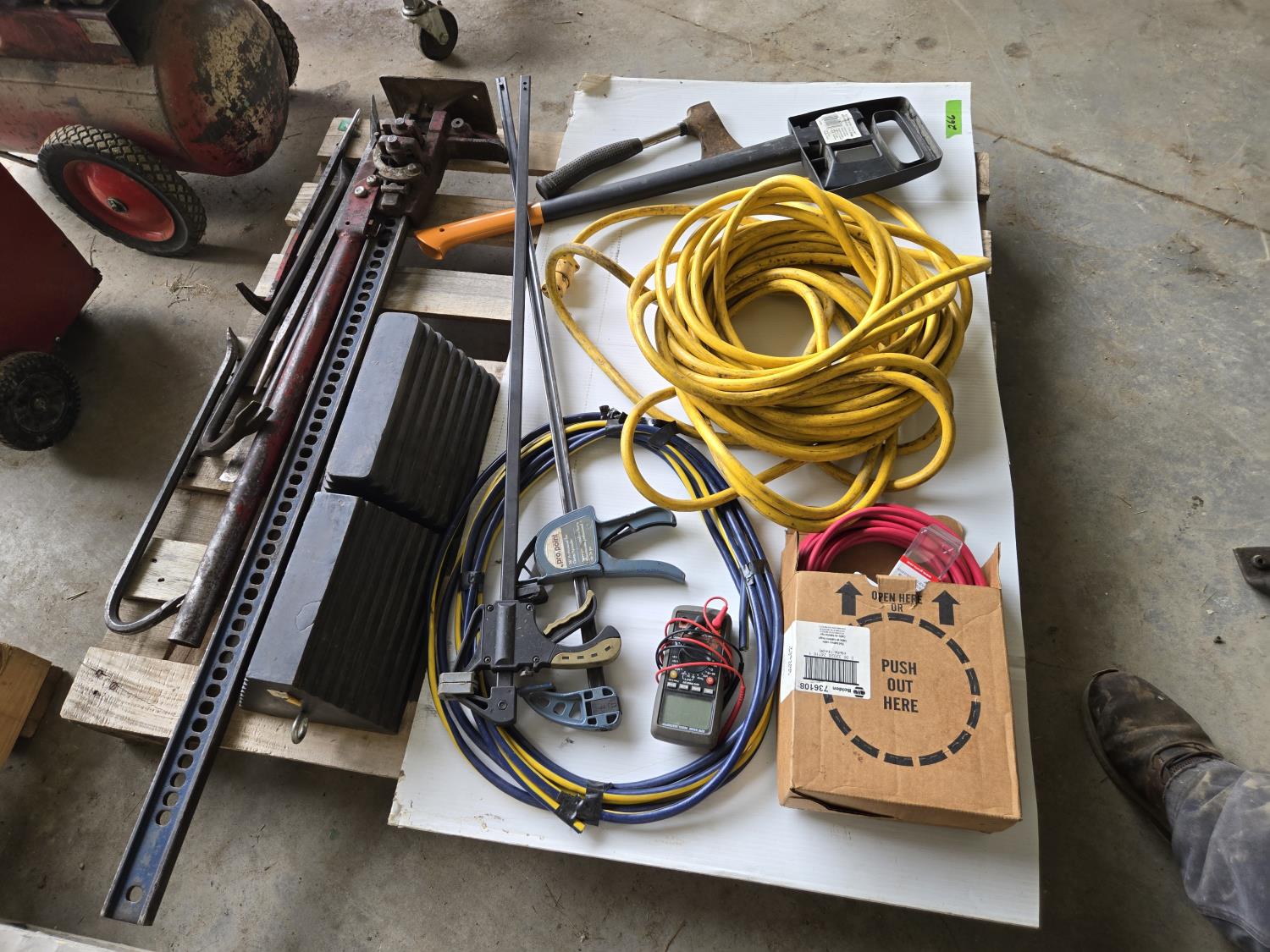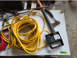 (5) crowbars, 28 inch splitting axe, small axe, heavy duty electrical cable, (2) wheel chalks, red battery cable, (2) 36 inch clamps, digital meter, jackall