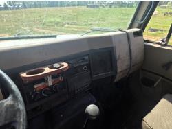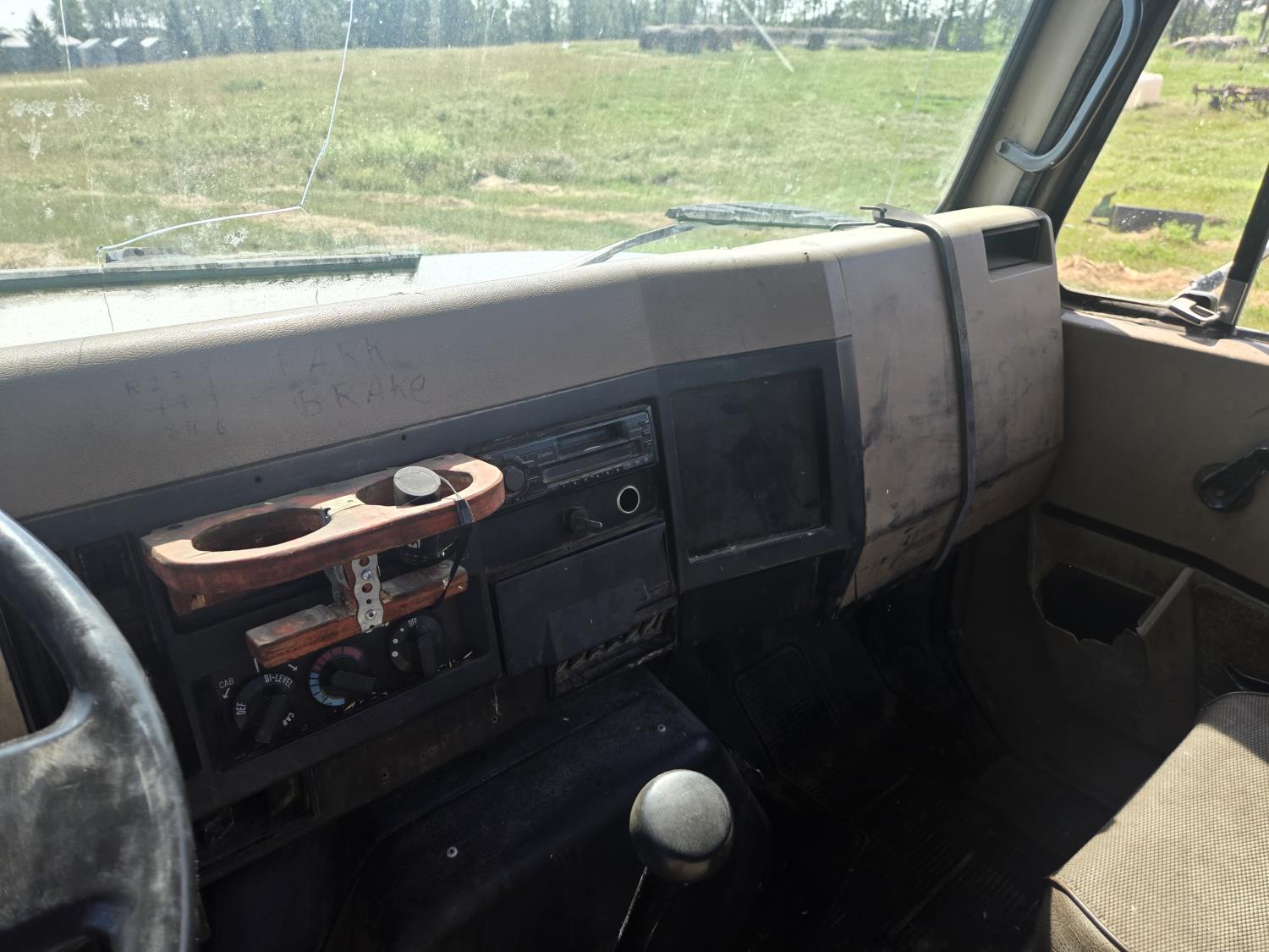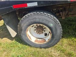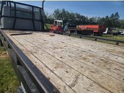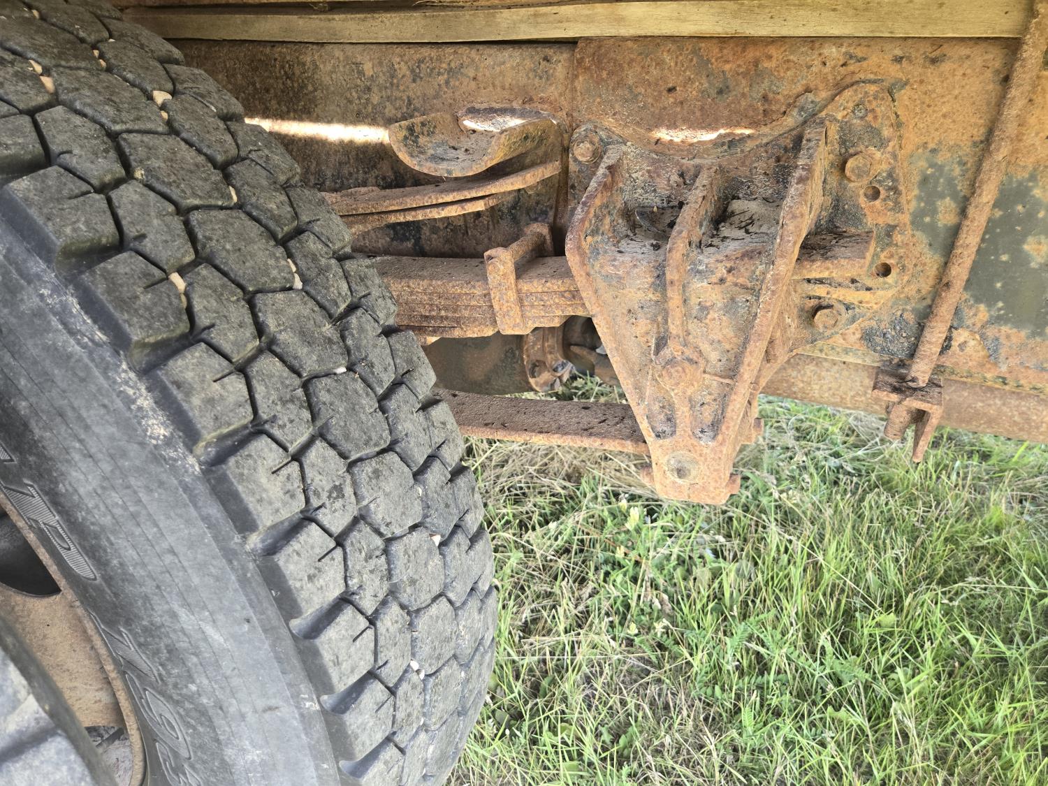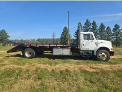 International DT466 6 cylinder diesel engine, manual transmission, 18 ft wood deck with 4 ft beaver tails, 60" flip over ramps, (1) under deck tool storage box, hydraulic brakes, spring suspension, 11R22.5 tires
