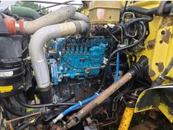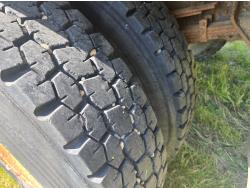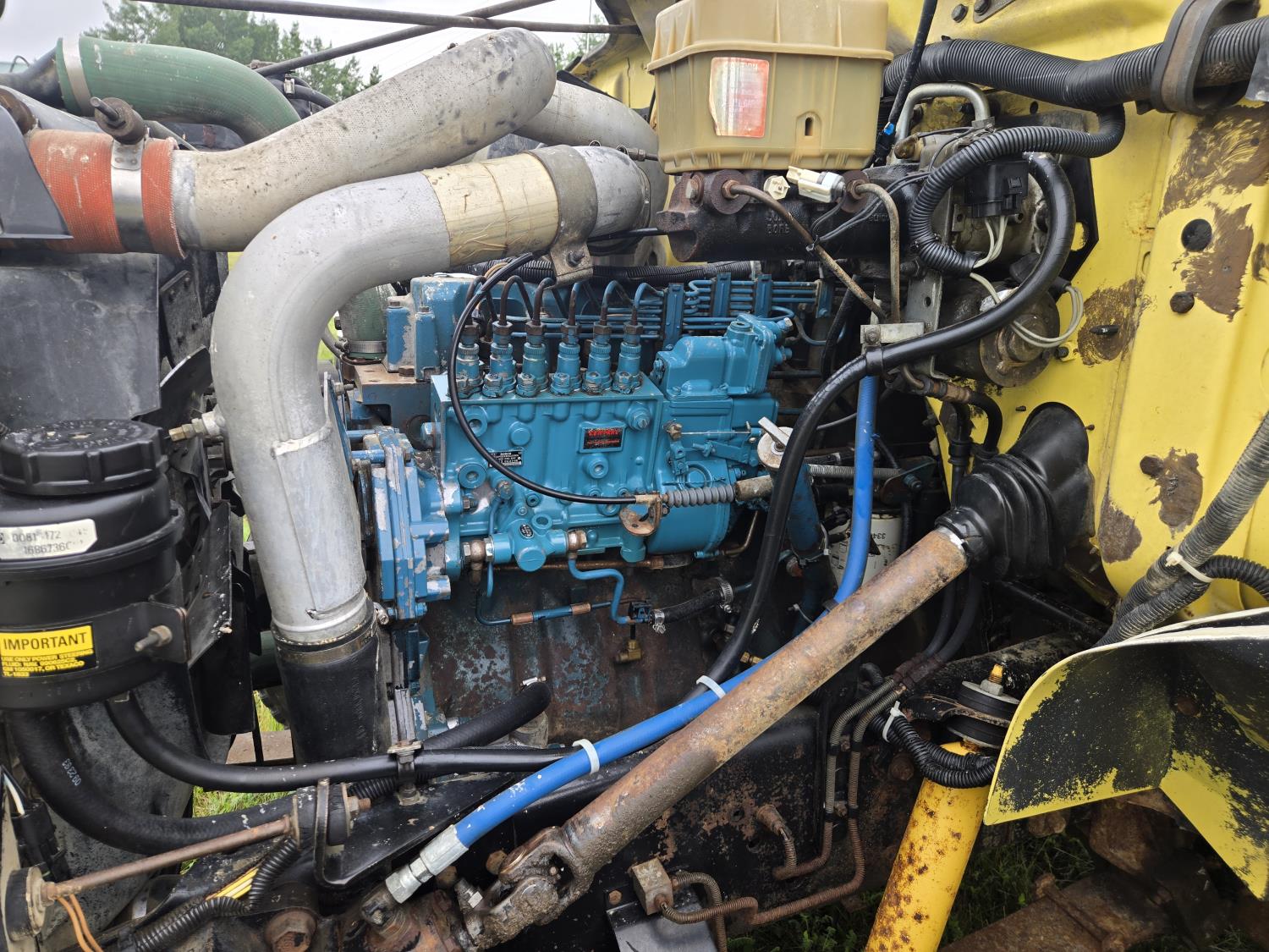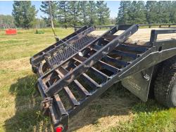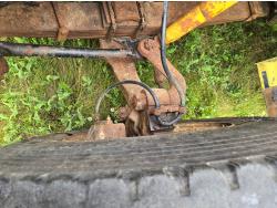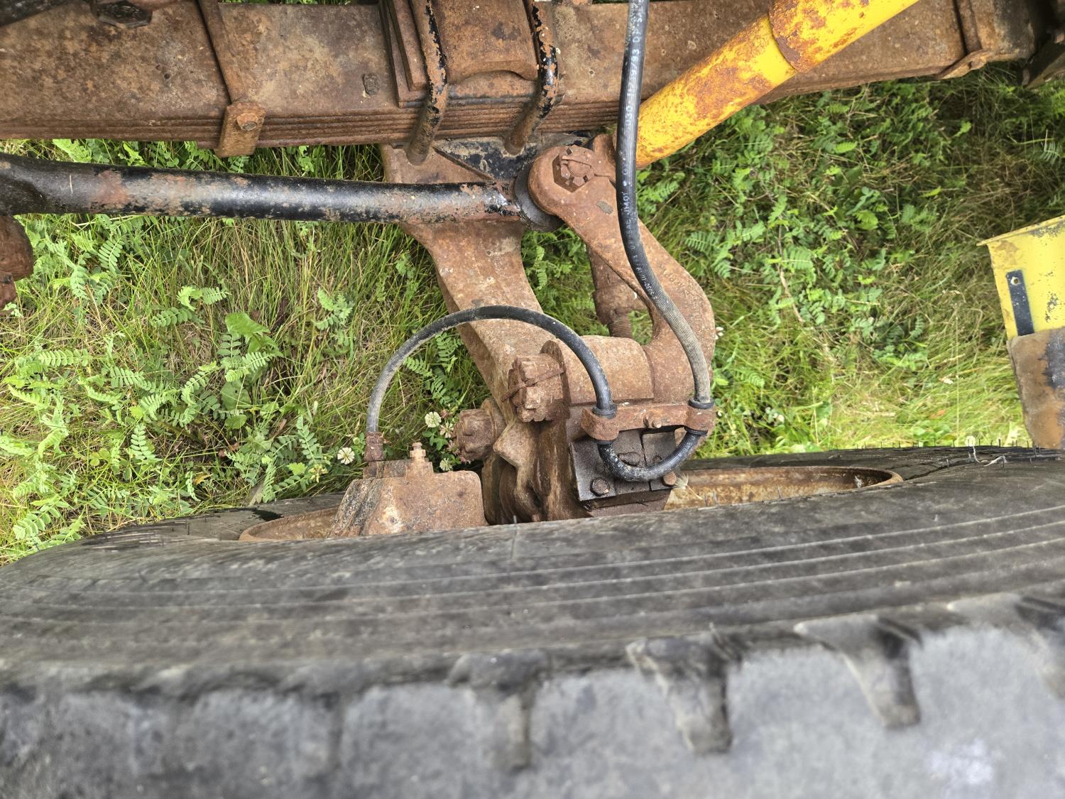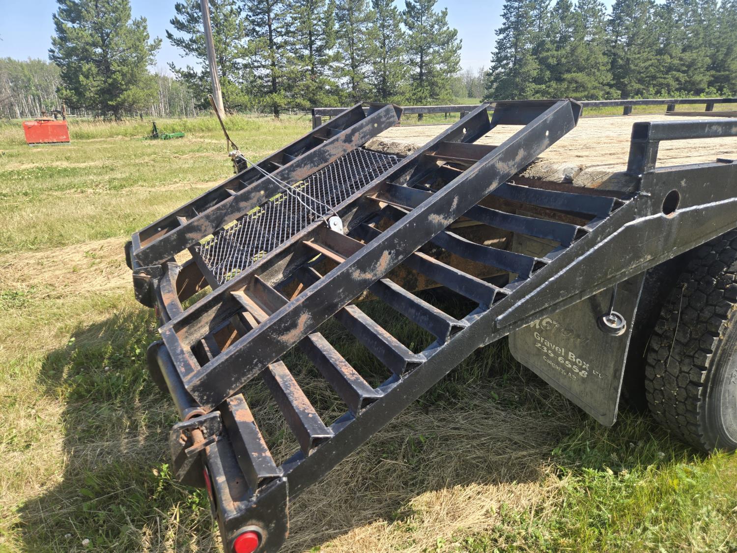 International DT466 6 cylinder diesel engine, manual transmission, 18 ft wood deck with 4 ft beaver tails, 60" flip over ramps, (1) under deck tool storage box, hydraulic brakes, spring suspension, 11R22.5 tires