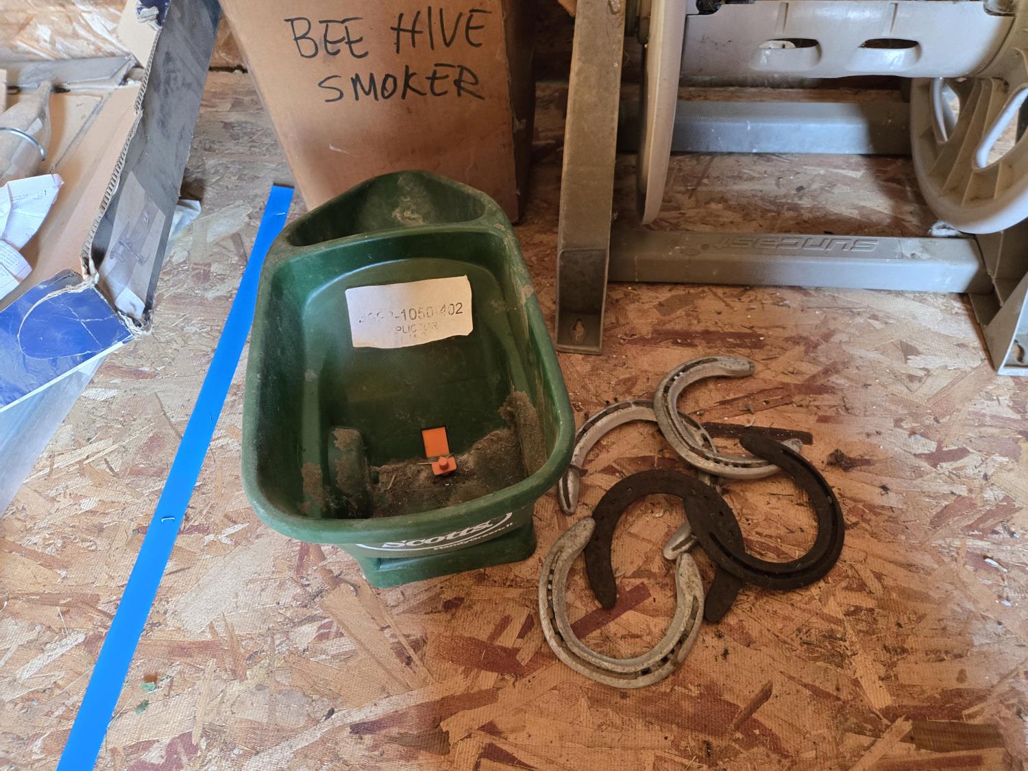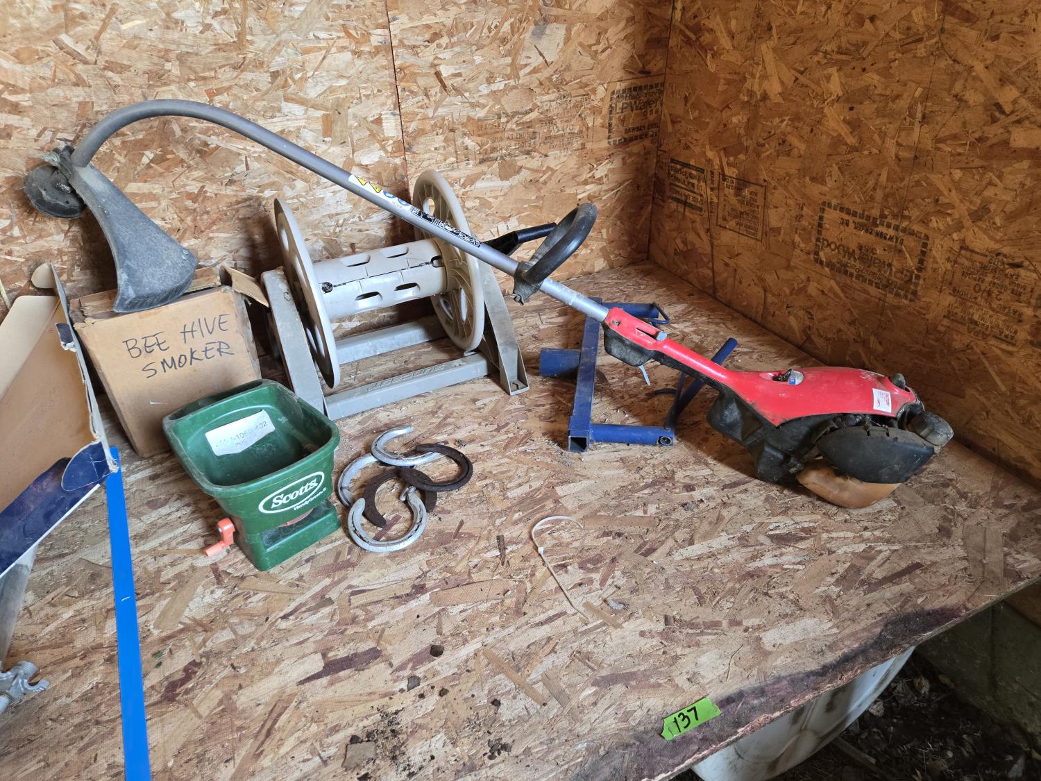 44 Hose Reel, Scotts Grass Seed Spreader, Tire Spreader, Homelite Trimmer