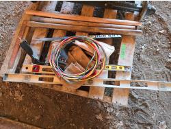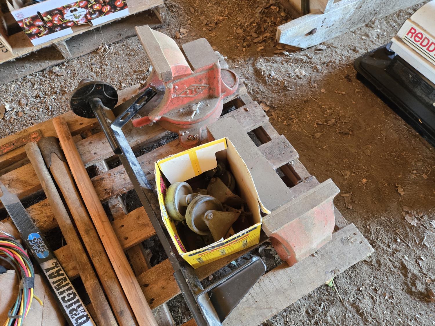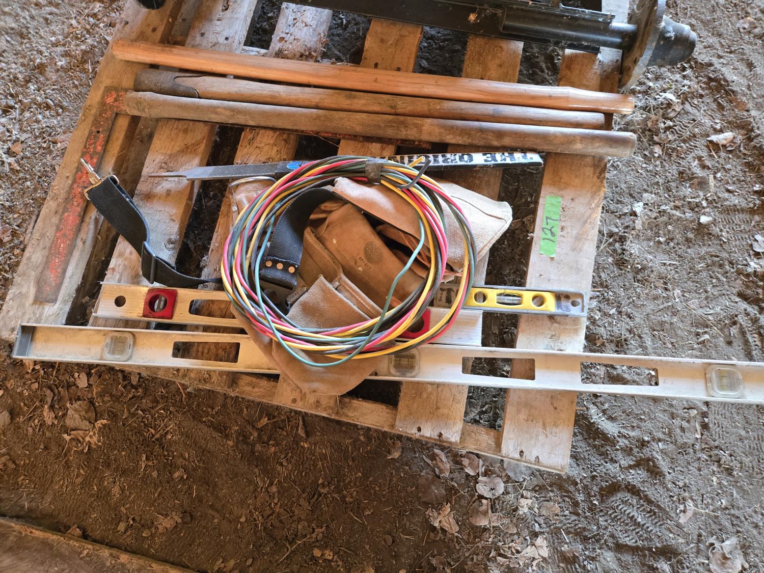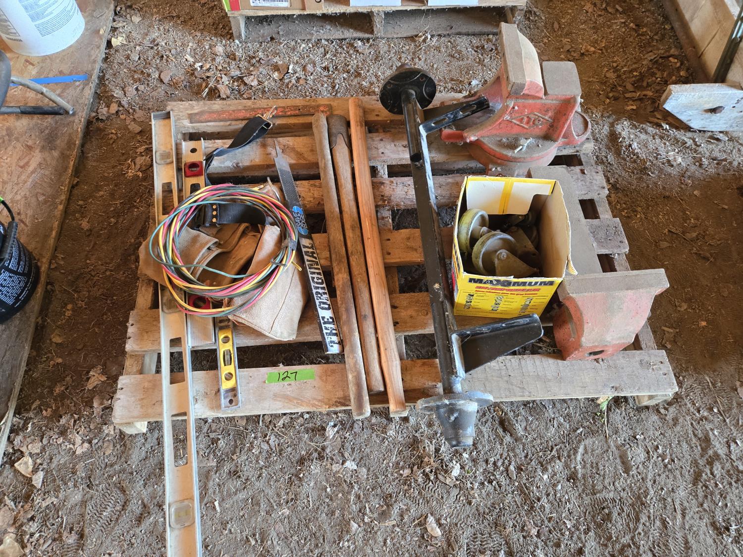 (3) levels, (2) wooden tool handles, large vise missing handle and screw, carpenters belt, small axle assembly