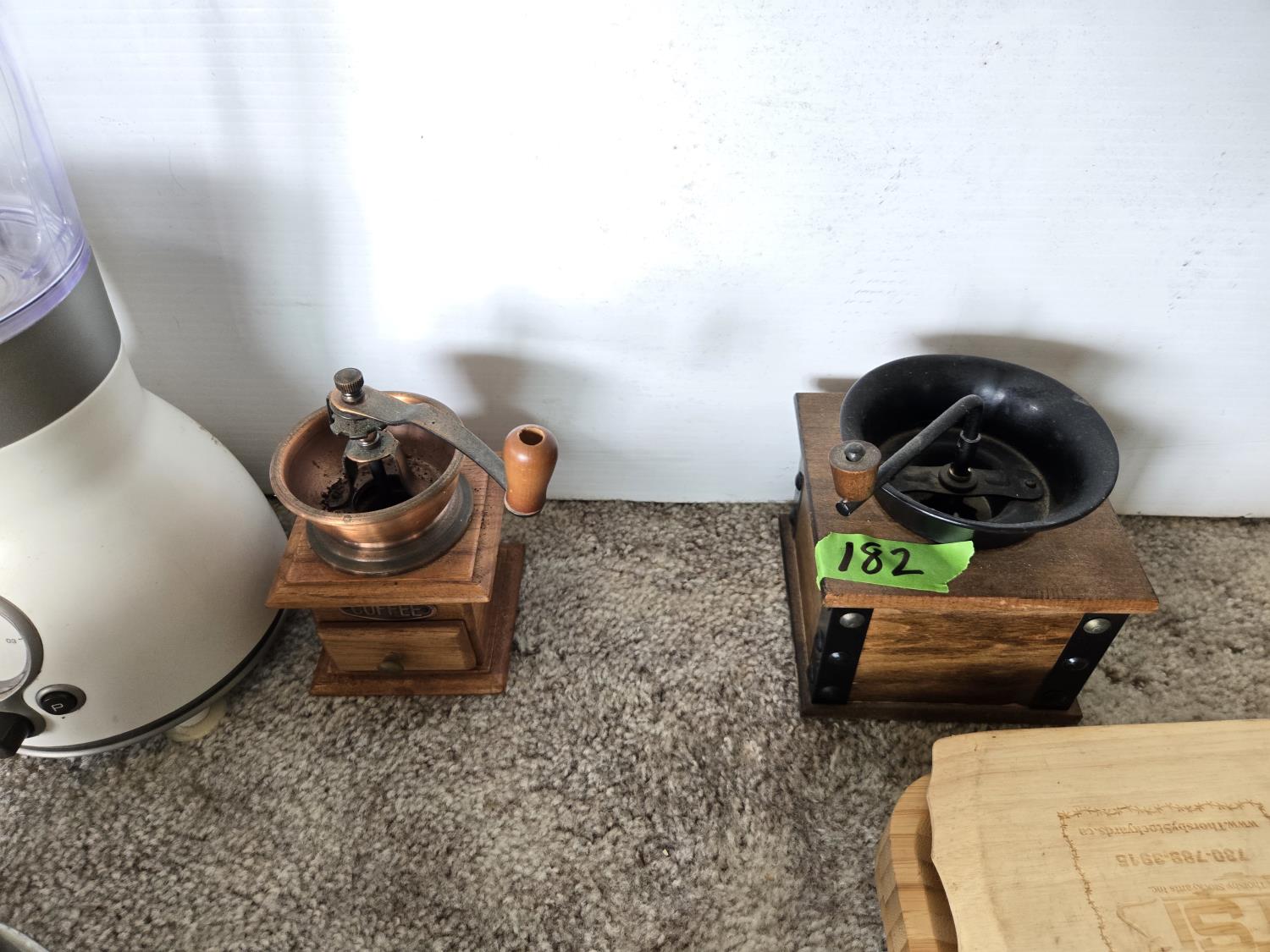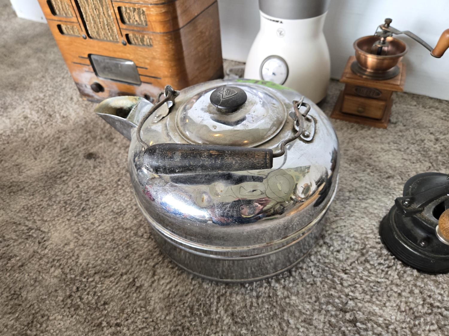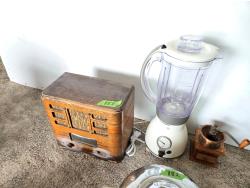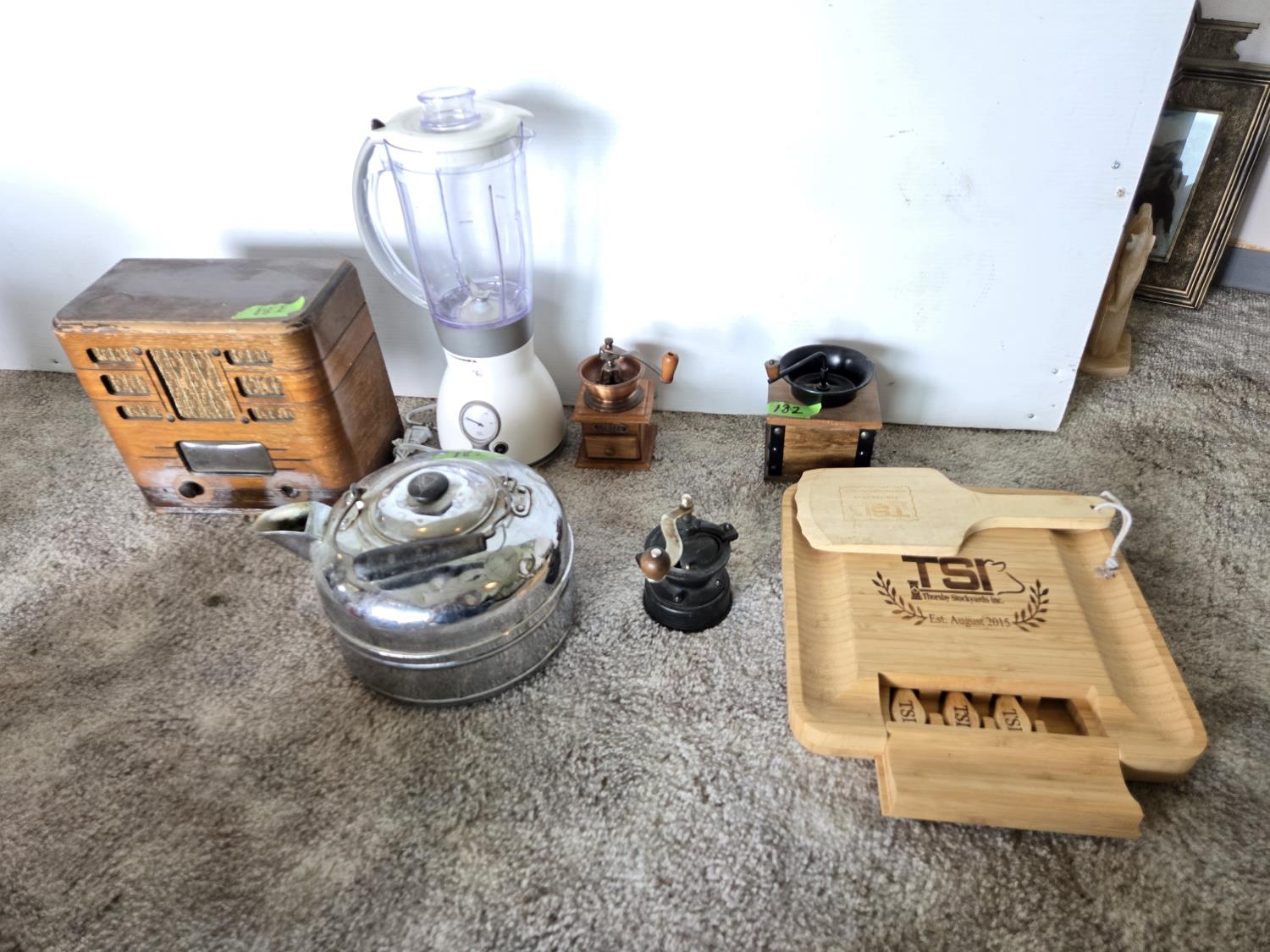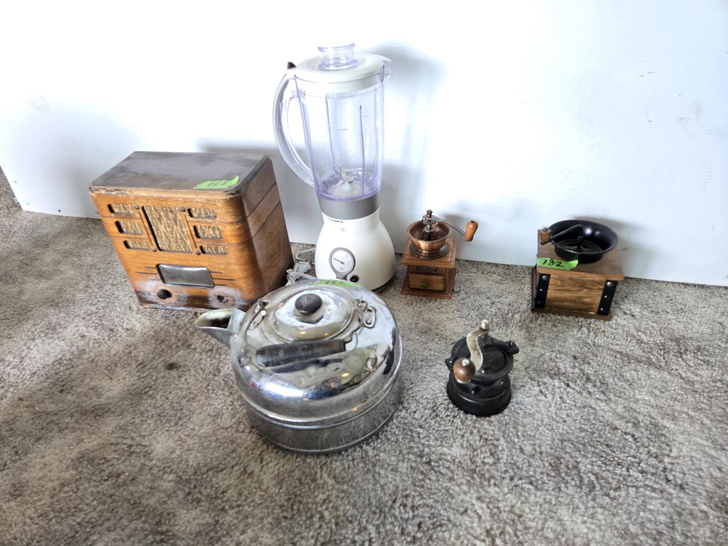 107 Vintage Blender & Grinder, Kettle & Radio, Thorsby Stock Yards Cutting Board