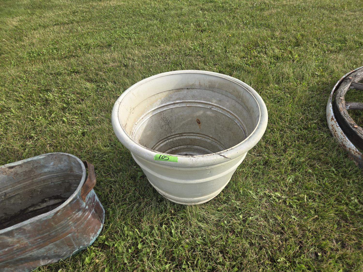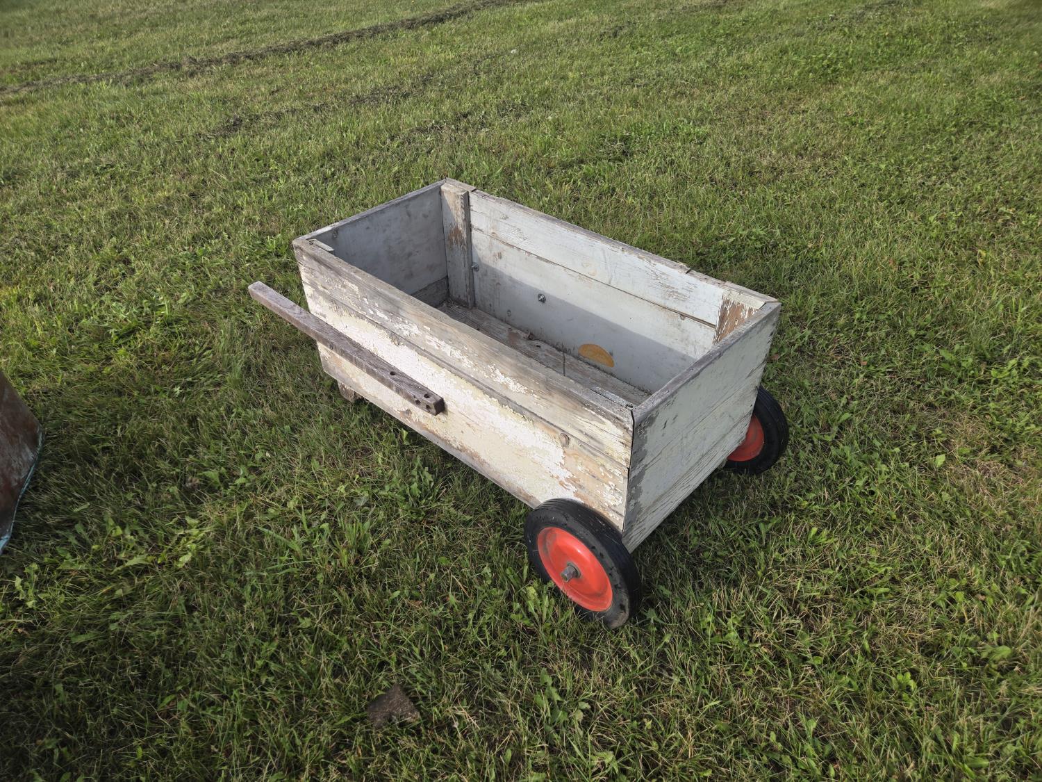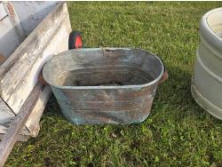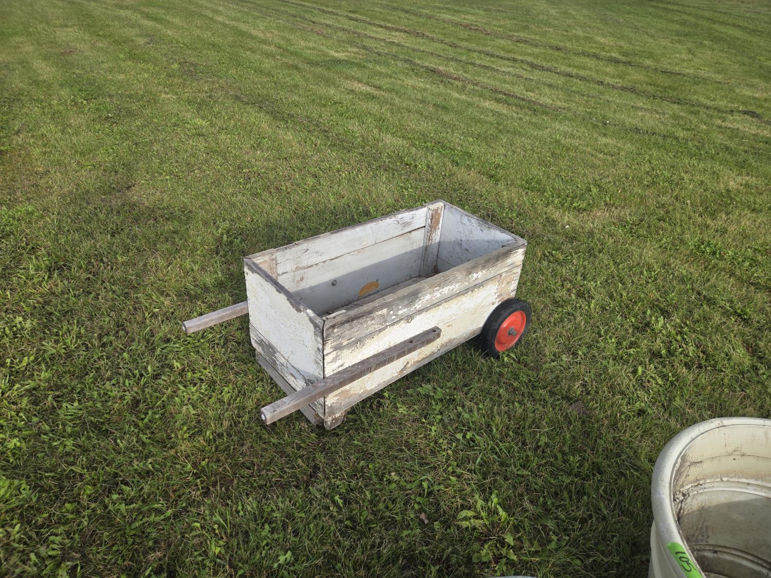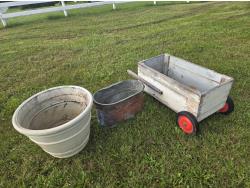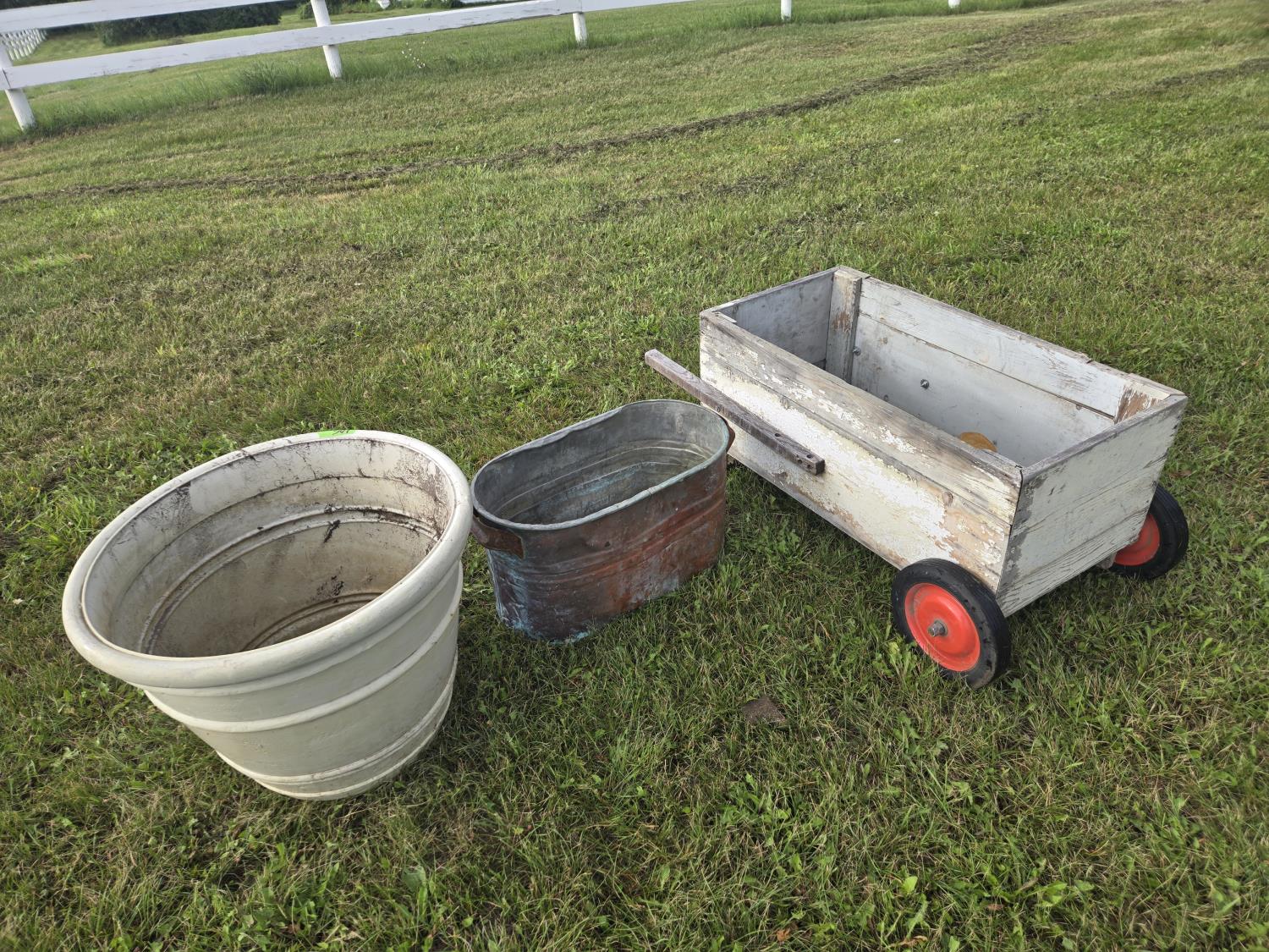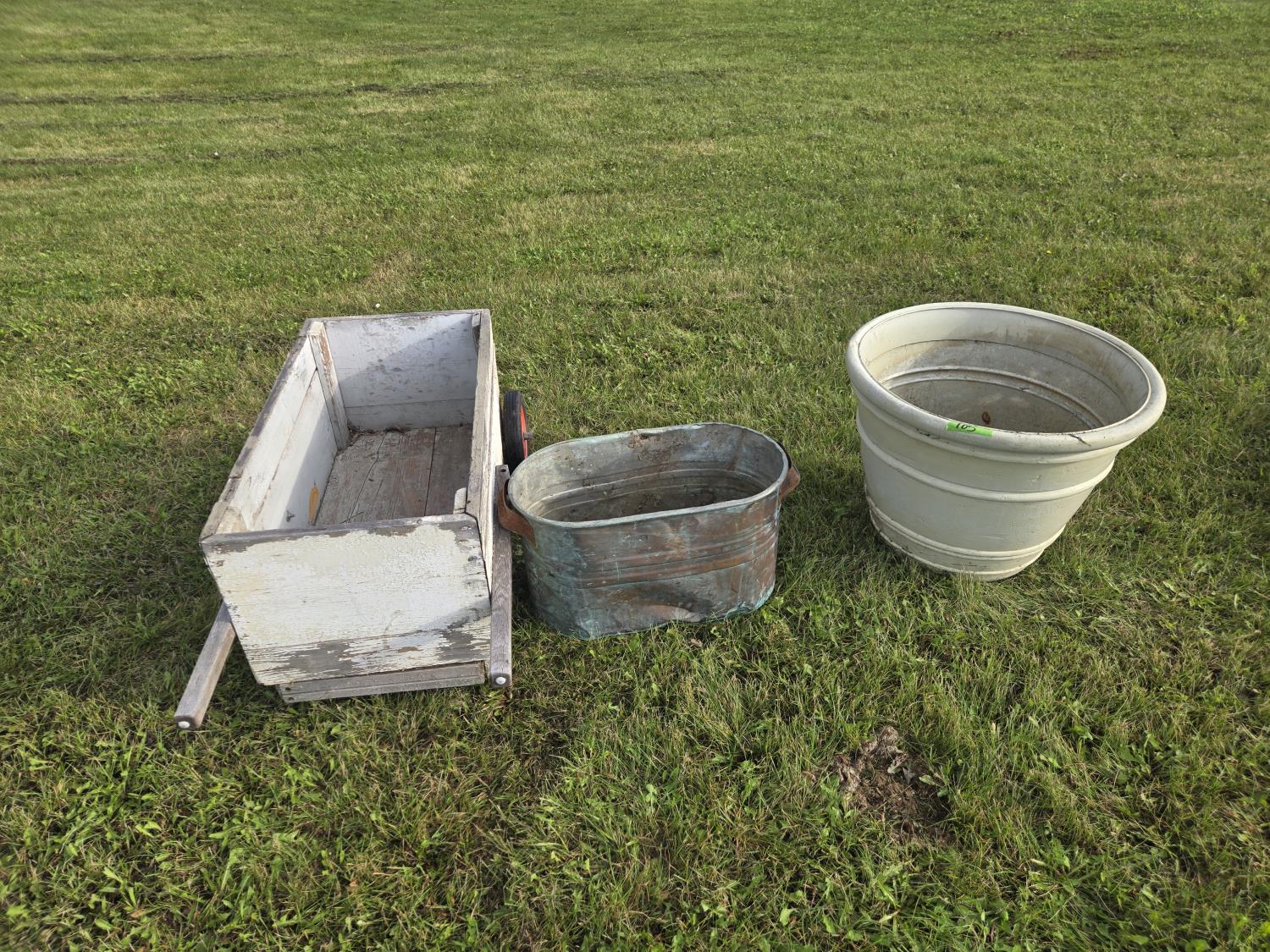 187 Copper Boiler, Wooden Garden Wagon & Poly Flower Pot