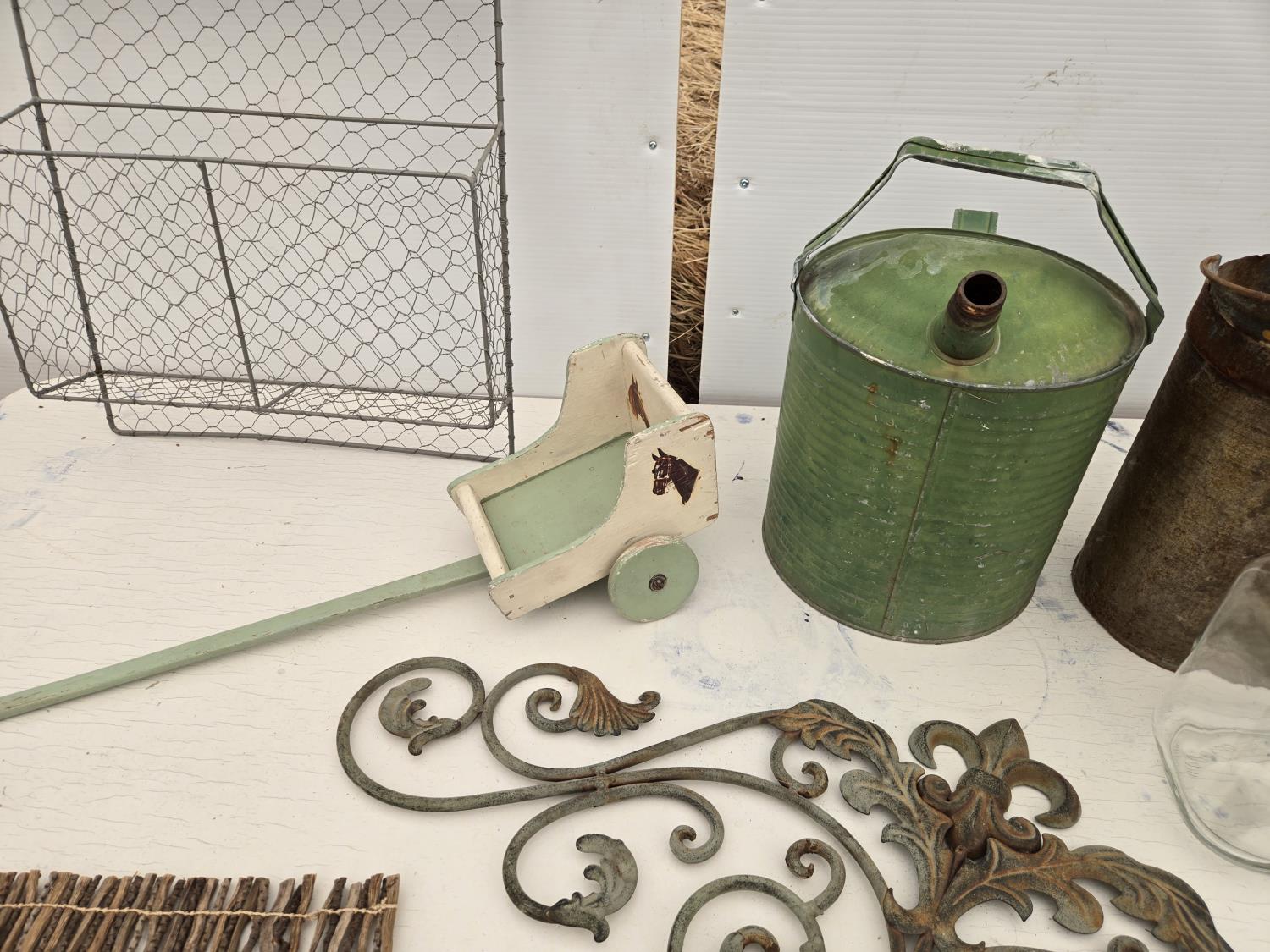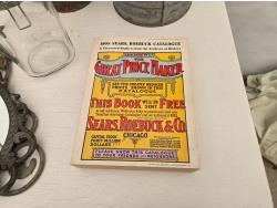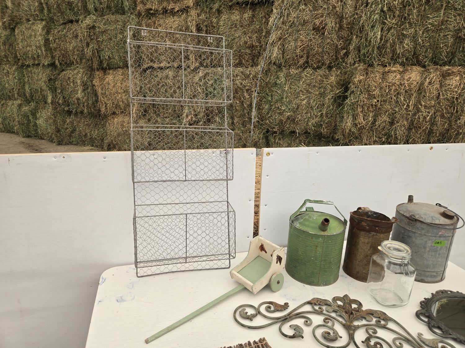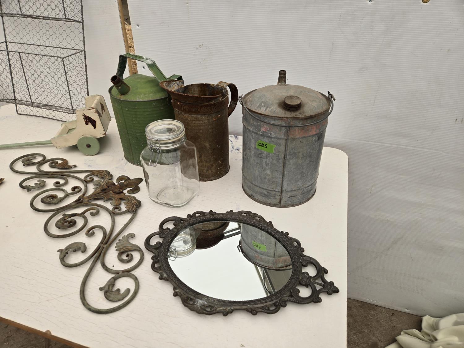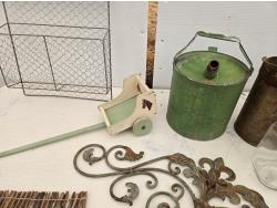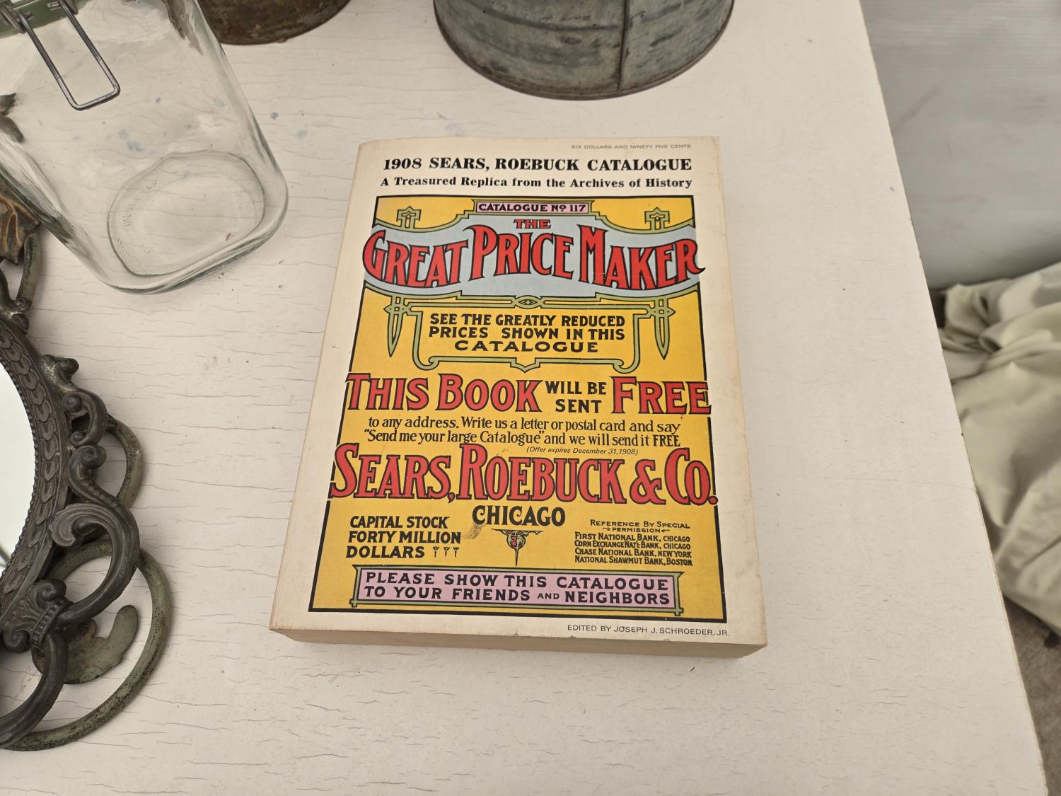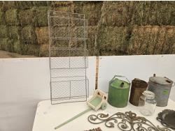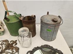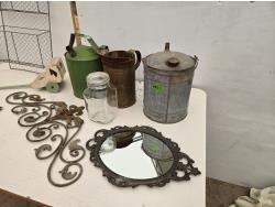 (3) cans, mirror, wall decor, mesh basket, wooden cart, jar, Sear Roebuck catalogue