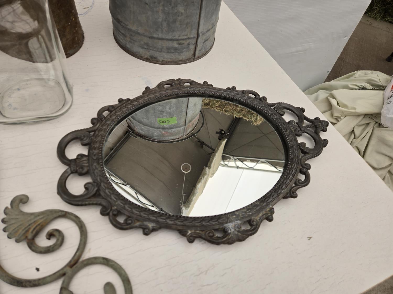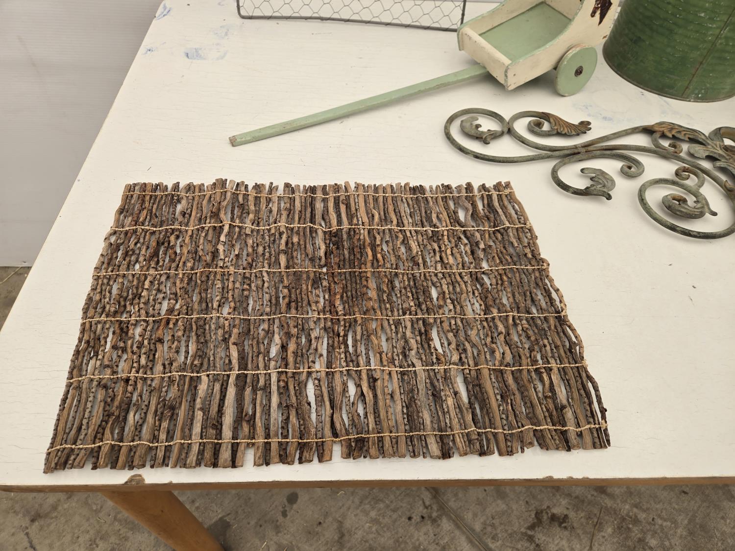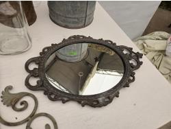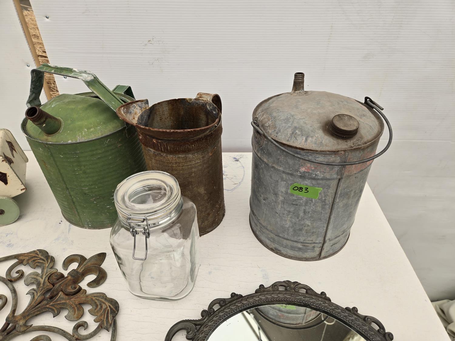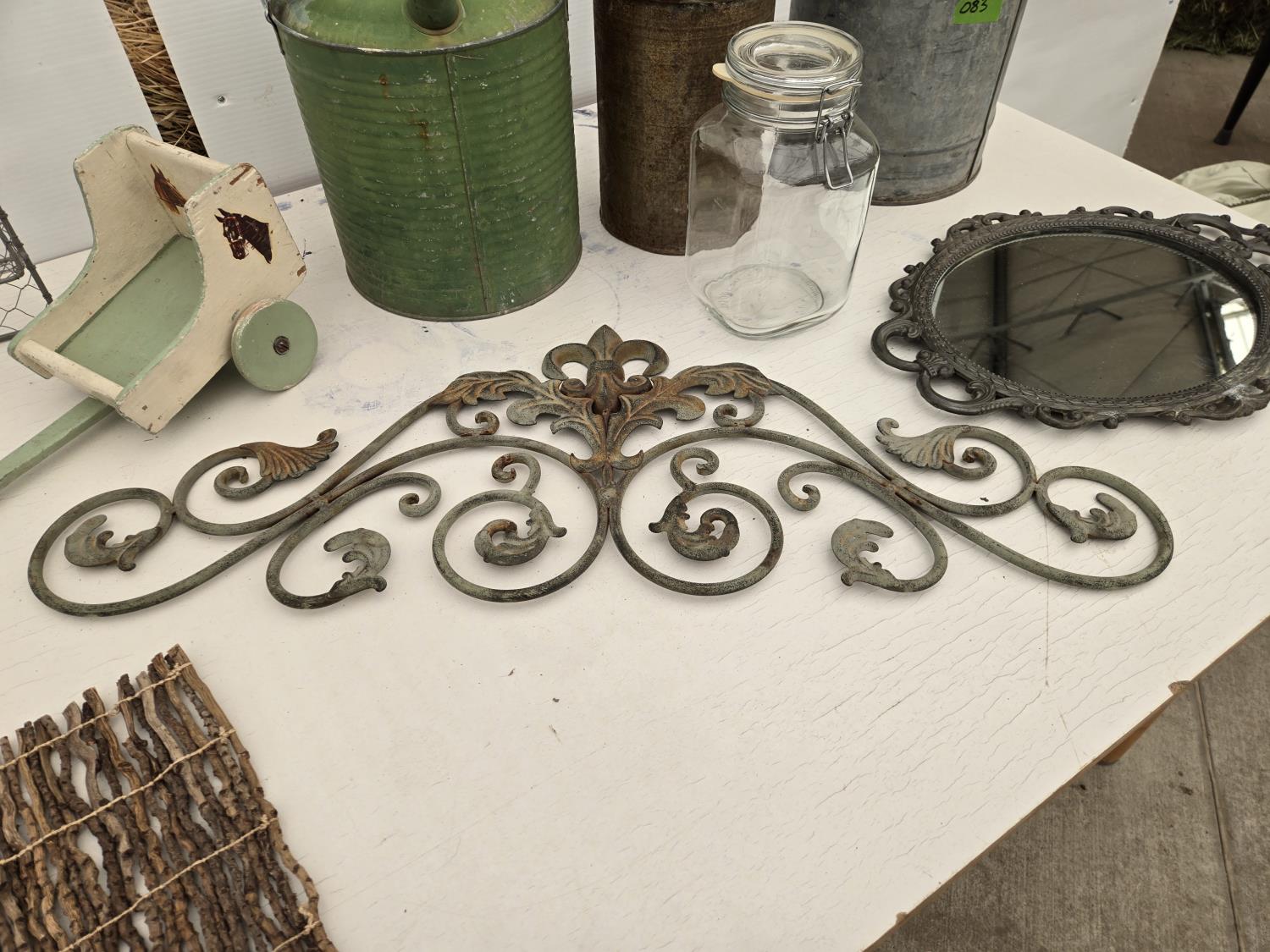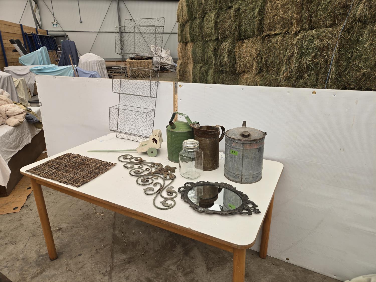 (3) cans, mirror, wall decor, mesh basket, wooden cart, jar, Sear Roebuck catalogue